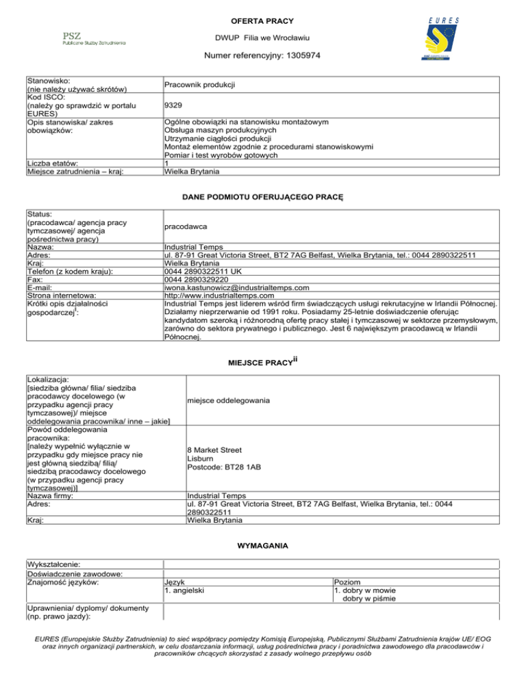 OFERTA PRACY DWUP Filia we Wrocławiu Numer referencyjny: 1305974 Stanowisko: (nie należy używać skrótów) Kod ISCO: (należy go sprawdzić w portalu EURES) Opis stanowiska/ zakres obowiązków: Liczba etatów: Miejsce zatrudnienia – kraj: Pracownik produkcji 9329 Ogólne obowiązki na stanowisku montażowym Obsługa maszyn produkcyjnych Utrzymanie ciągłości produkcji Montaż elementów zgodnie z procedurami stanowiskowymi Pomiar i test wyrobów gotowych 1 Wielka Brytania DANE PODMIOTU OFERUJĄCEGO PRACĘ Status: (pracodawca/ agencja pracy tymczasowej/ agencja pośrednictwa pracy) Nazwa: Adres: Kraj: Telefon (z kodem kraju): Fax: E-mail: Strona internetowa: Krótki opis działalności gospodarczeji: pracodawca Industrial Temps ul. 87-91 Great Victoria Street, BT2 7AG Belfast, Wielka Brytania, tel.: 0044 2890322511 Wielka Brytania 0044 2890322511 UK 0044 2890329220 [email protected] http://www.industrialtemps.com Industrial Temps jest liderem wśród firm świadczących usługi rekrutacyjne w Irlandii Północnej. Działamy nieprzerwanie od 1991 roku. Posiadamy 25-letnie doświadczenie oferując kandydatom szeroką i różnorodną ofertę pracy stałej i tymczasowej w sektorze przemysłowym, zarówno do sektora prywatnego i publicznego. Jest 6 największym pracodawcą w Irlandii Północnej. MIEJSCE PRACYii Lokalizacja: [siedziba główna/ filia/ siedziba pracodawcy docelowego (w przypadku agencji pracy tymczasowej)/ miejsce oddelegowania pracownika/ inne – jakie] Powód oddelegowania pracownika: [należy wypełnić wyłącznie w przypadku gdy miejsce pracy nie jest główną siedzibą/ filią/ siedzibą pracodawcy docelowego (w przypadku agencji pracy tymczasowej)] Nazwa firmy: Adres: Kraj: miejsce oddelegowania 8 Market Street Lisburn Postcode: BT28 1AB Industrial Temps ul. 87-91 Great Victoria Street, BT2 7AG Belfast, Wielka Brytania, tel.: 0044 2890322511 Wielka Brytania WYMAGANIA Wykształcenie: Doświadczenie zawodowe: Znajomość języków: Język 1. angielski Poziom 1. dobry w mowie dobry w piśmie Uprawnienia/ dyplomy/ dokumenty (np. prawo jazdy): EURES (Europejskie Służby Zatrudnienia) to sieć współpracy pomiędzy Komisją Europejską, Publicznymi Służbami Zatrudnienia krajów UE/ EOG oraz innych organizacji partnerskich, w celu dostarczania informacji, usług pośrednictwa pracy i poradnictwa zawodowego dla pracodawców i pracowników chcących skorzystać z zasady wolnego przepływu osób Inne istotne wymagania: • Wykształcenie: podstawowe • Doświadczenie zawodowe: mile widziane wcześniejsze doświadczenie w środowisku produkcyjnym; przeszkolenie stanowiskowe oraz BHP będzie zapewnione przez pracodawcę • Znajomość języków: angielski - komunikatywny/dobry (warunek konieczny) WYNAGRODZENIE I WARUNKI ZATRUDNIENIA Wysokość pensji brutto: Wysokość pensji netto: Waluta, w jakiej wypłacana jest pensja: Rodzaj stawki wynagrodzenia: (godzinowa/ tygodniowa/ miesięczna/ roczna/ inna) Premie: Dodatkowe świadczenia (zakwaterowanie, wyżywienie, koszty związane ze zmianą miejsca zamieszkania, koszty podróży itp.): Nazwa firmy, z którą zostanie podpisana umowa: Rodzaj umowy: (umowa o pracę, umowa zlecenia, wolontariat, praktyka zawodowa/ staż, praca zdalna, agencja pracy tymczasowej, inne): Wymiar czasu pracy (praca na pełen etat/ część etatu): Czas trwania umowy: (nieokreślony/ określony) 7,20 Liczba godzin tygodniowo: Zmiany i praca w dni wolne: 37,50 Do wyboru zmiana: - poranna – 7- 15 (37h tygodniowo – do 25 roku życia £6.95/ powyżej 25 £7.20) - wieczorna – 15.15 – 23.15 (37h tygodniowo – do 25 roku życia £6.95/ powyżej 25 £7.20) - nocna – 23.30 – 6.45 (34 godzin tygodniowo – do 25 roku życia £7.20/ powyżej 25 £7.70) 2017-01-04 Wysokość pensji brutto: min. 7,20 – 9,95 za godzinę + płatny urlop Możliwość rozwoju i zdobycia doświadczenia oraz pracy bezpośrednio dla naszych klientów Data rozpoczęcia: Inne informacje: Funt szterling Czasowy ze stawką godzinową Pełne wsparcie w relokacji: pomoc w znalezieniu zakwaterowania, w uzyskaniu ubezpieczenia (NI number), formalnościach przy zakładaniu konta bankowego i niezbędny pakiet informacji potrzebnych na start. Industrial Temps umowa o pracę etat nieokreślony Data wygaśnięcia umowy (w przypadku umowy na czas określony): SPOSÓB SKŁADANIA WNIOSKU Wymagane dokumenty (list motywacyjny, CV itp.): Język, w którym muszą być sporządzone przedkładane dokumenty: Do kogo należy wysłać dokumenty: (do pracodawcy/ doradcy EURES) Gdzie należy wysłać dokumenty: (adres, adres e-mail, nr faksu z kodem kraju itp.) Dane teleadresowe doradcy EURES lub przedstawiciela pracodawcy: (nazwisko, adres, telefon, fax, e-mail itp.) CV oraz możliwie referencje oraz kopia dokumentów potwierdzająca dodatkowe uprawnienia polski do agencji [email protected] 0044 28 90322511 Iwona Kastunowicz - 0044 28 90322511 DODATKOWE INFORMACJE WAŻNOŚĆ 2017-01-04 Data publikacji: Termin przedkładania podań o pracę / 2017-01-31 zakończenia ważności oferty: Uprzejmie informujemy, że skontaktujemy się wyłącznie z wybranymi kandydatami. UWAGA: EURES (Europejskie Służby Zatrudnienia) to sieć współpracy pomiędzy Komisją Europejską, Publicznymi Służbami Zatrudnienia krajów UE/ EOG oraz innych organizacji partnerskich, w celu dostarczania informacji, usług pośrednictwa pracy i poradnictwa zawodowego dla pracodawców i pracowników chcących skorzystać z zasady wolnego przepływu osób 1. Umowa z zagranicznym pracodawcą jest zawierana, co do zasady, zgodnie z prawem kraju zatrudnienia. Oznacza to, że wszystkie roszczenia odnośnie warunków, które obejmuje umowa, można kierować wyłącznie do odpowiedniego sądu w kraju zatrudnienia. Publiczne służby zatrudnienia (EURES) nie mogą pośredniczyć ani reprezentować pracownika w sądzie kraju zatrudnienia w przypadku sporu z pracodawcą. 2. Publiczne służby zatrudnienia (EURES) dokładają wszelk