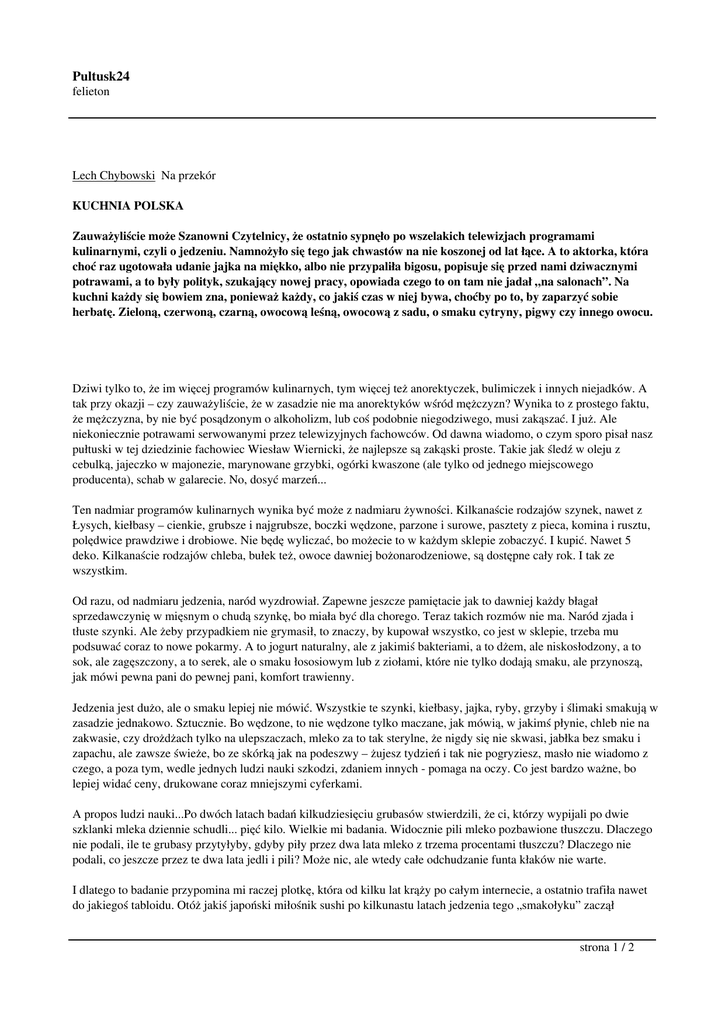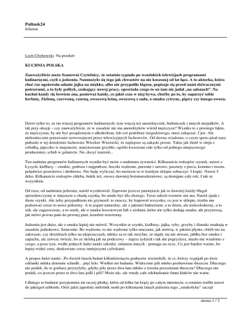 Pultusk24 felieton Lech Chybowski Na przekór KUCHNIA POLSKA Zauważyliście może Szanowni Czytelnicy, że ostatnio sypnęło po wszelakich telewizjach programami kulinarnymi, czyli o jedzeniu. Namnożyło się tego jak chwastów na nie koszonej od lat łące. A to aktorka, która choć raz ugotowała udanie jajka na miękko, albo nie przypaliła bigosu, popisuje się przed nami dziwacznymi potrawami, a to były polityk, szukający nowej pracy, opowiada czego to on tam nie jadał „na salonach”. Na kuchni każdy się bowiem zna, ponieważ każdy, co jakiś czas w niej bywa, choćby po to, by zaparzyć sobie herbatę. Zieloną, czerwoną, czarną, owocową leśną, owocową z sadu, o smaku cytryny, pigwy czy innego owocu. Dziwi tylko to, że im więcej programów kulinarnych, tym więcej też anorektyczek, bulimiczek i innych niejadków. A tak przy okazji – czy zauważyliście, że w zasadzie nie ma anorektyków wśród mężczyzn? Wynika to z prostego faktu, że mężczyzna, by nie być posądzonym o alkoholizm, lub coś podobnie niegodziwego, musi zakąszać. I już. Ale niekoniecznie potrawami serwowanymi przez telewizyjnych fachowców. Od dawna wiadomo, o czym sporo pisał nasz pułtuski w tej dziedzinie fachowiec Wiesław Wiernicki, że najlepsze są zakąski proste. Takie jak śledź w oleju z cebulką, jajeczko w majonezie, marynowane grzybki, ogórki kwaszone (ale tylko od jednego miejscowego producenta), schab w galarecie. No, dosyć marzeń... Ten nadmiar programów kulinarnych wynika być może z nadmiaru żywności. Kilkanaście rodzajów szynek, nawet z Łysych, kiełbasy – cienkie, grubsze i najgrubsze, boczki wędzone, parzone i surowe, pasztety z pieca, komina i rusztu, polędwice prawdziwe i drobiowe. Nie będę wyliczać, bo możecie to w każdym sklepie zobaczyć. I kupić. Nawet 5 deko. Kilkanaście rodzajów chleba, bułek też, owoce dawniej bożonarodzeniowe, są dostępne cały rok. I tak ze wszystkim. Od razu, od nadmiaru jedzenia, naród wyzdrowiał. Zapewne jeszcze pamiętacie jak to dawniej każdy błagał sprzedawczynię w mięsnym o chudą szynkę, bo miała być dla chorego. Teraz takich rozmów nie ma. Naród zjada i tłuste szynki. Ale żeby przypadkiem nie grymasił, to znaczy, by kupował wszystko, co jest w sklepie, trzeba mu podsuwać coraz to nowe pokarmy. A to jogurt naturalny, ale z jakimiś bakteriami, a to dżem, ale niskosłodzony, a to sok, ale zagęszczony, a to serek, ale o smaku łososiowym lub z ziołami, które nie tylko dodają smaku, ale przynoszą, jak mówi pewna pani do pewnej pani, komfort trawienny. Jedzenia jest dużo, ale o smaku lepiej nie mówić. Wszystkie te szynki, kiełbasy, jajka, ryby, grzyby i ślimaki smakują w zasadzie jednakowo. Sztucznie. Bo wędzone, to nie wędzone tylko maczane, jak mówią, w jakimś płynie, chleb nie na zakwasie, czy drożdżach tylko na ulepszaczach, mleko za to tak sterylne, że nigdy się nie skwasi, jabłka bez smaku i zapachu, ale zawsze świeże, bo ze skórką jak na podeszwy – żujesz tydzień i tak nie pogryziesz, masło nie wiadomo z czego, a poza tym, wedle jednych ludzi nauki szkodzi, zdaniem innych - pomaga na oczy. Co jest bardzo ważne, bo lepiej widać ceny, drukowane coraz mniejszymi cyferkami. A propos ludzi nauki...Po dwóch latach badań kilkudziesięciu grubasów stwierdzili, że ci, którzy wypijali po dwie szklanki mleka dziennie schudli... pięć kilo. Wielkie mi badania. Widocznie pili mleko pozbawione tłuszczu. Dlaczego nie podali, ile te grubasy przytyłyby, gdyby piły przez dwa lata mleko z trzema procentami tłuszczu? Dlaczego nie podali, co jeszcze przez te dwa lata jedli i pili? Może nic, ale wtedy całe odchudzanie funta kłaków nie warte. I dlatego to badanie przypomina mi raczej plotkę, która od kilku lat krąży po całym internecie, a ostatnio trafiła nawet do jakiegoś tabloidu. Otóż jakiś japoński miłośnik sushi po kilkunastu latach jedzenia tego „smakołyku” zaczął strona 1 / 2 Pultusk24 felieton odczuwać bóle głowy. Coraz silniejsze. Ale, wierny jak to zawsze samurajowie, sushi jadł mimo nasilającego się bólu. Aż do śmierci. I podczas sekcji okazało się, że przyczyną bólów głowy były robaki, które się w niej zagnieździły. Oczywiście robaki pochodzące z tych surowych ryb, które jadł. No bo przecież chyba nie z ryżu... Ponieważ jednak, jak sądzę, zbliża się pora konsumowania przeze mnie kleików ryżowych, zwracam się z prośbą do ministra nauki o spowodowanie, by nasi naukowcy rzetelnie zbadali czy od jedzenia ryżu człowiek nie dostaje robaków. Szczególnie w głowie. Bo z innymi łatwiej sobie poradzić... strona 2 / 2