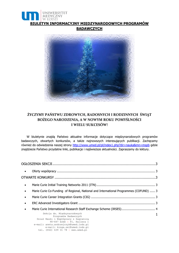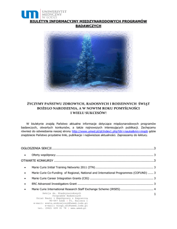 BIULETYN INFORMACYJNY MIĘDZYNARODOWYCH PROGRAMÓW BADAWCZYCH ŻYCZYMY PAŃSTWU ZDROWYCH, RADOSNYCH I RODZINNYCH ŚWIĄT BOŻEGO NARODZENIA, A W NOWYM ROKU POMYŚLNOŚCI I WIELU SUKCESÓW! W biuletynie znajdą Państwo aktualne informacje dotyczące międzynarodowych programów badawczych, otwartych konkursów, a także najnowszych interesujących publikacji. Zachęcamy również do odwiedzenia naszej strony http://www.umed.pl/pl/index1.php?dir=nauka&mn=mspb gdzie znajdziecie Państwo przydatne linki, publikacje i najświeższe aktualności. Zapraszamy do lektury. OGŁOSZENIA SEKCJI ...................................................................................................... 3 Oferty współpracy ............................................................................................................. 3 OTWARTE KONKURSY .................................................................................................... 3 Marie Curie Initial Training Networks 2011 (ITN) ................................................................. 3 Marie Curie Co-Funding of Regional, National and International Programmes (COFUND) ...... 3 Marie Curie Career Integration Grants (CIG) ....................................................................... 3 ERC Advanced Investigators Grant ..................................................................................... 3 Marie Curie International Research Staff Exchange Scheme (IRSES) ..................................... 4 Sekcja ds. Międzynarodowych Programów Badawczych Dział Nauki i Współpracy z Zagranicą 90-647 Łódź | Pl. Hallera 1 e-mail: [email protected] e-mail: [email protected] tel. (042) 639 31 78 | www.umed.pl 1 KBBE 2011 ........................................................................................................................ 4 Nuclear Fission and Radiation Protection ............................................................................. 4 Reinforcing Cooperation with Europe's neighbours in the context of the ERA ........................ 4 Strengthening European research facilities in third countries - INCO-LAB .............................. 4 Strengthening joint European S&T centres in Third Countries - INCO-HOUSE ........................ 4 Konkurs w ramach projektu ERA-Net E-Rare-2 .................................................................... 5 III konkurs w ramach Inicjatywy Leków Innowacyjnych IMI JU ............................................ 6 MOBILNOŚĆ PLUS ............................................................................................................. 6 OGŁOSZENIA KOMISJI EUROPEJSKIEJ ............................................................................. 6 Interim Evaluation of the Seventh Framework Programme - Report of the Expert Group ........ 6 WYDARZENIA ................................................................................................................ 6 Szkolenia i konferencje : .................................................................................................... 6 OFERTY WSPÓŁPRACY ................................................................................................... 6 Oferty współpracy w projektach w ramach 7. Programu Ramowego: ................................... 6 IMBB-FORTH – GREECE ..................................................................................................... 7 Instituto Aragonés de Ciencias de la Salud (Aragonese Health Sciences Institute) – SPAIN .... 7 CRIT - Centre for Research and Innovation in Toxicology - Technical University of Catalonia (UPC) – SPAIN ........................................................................................................................... 7 iDeTra – SPAIN ................................................................................................................. 7 JOANNEUM RESEARCH Forschungsges.m.b.H. – AUSTRIA ................................................... 7 TUBITAK Marmara Research Center (Marmara arastirma Merkezi) – TURKEY ........................ 7 Team Professionists Consultants of Health Management – ITALY ......................................... 8 Rosyjskie jednostki naukowe .............................................................................................. 8 Poszukiwanie partnerów do projektów IMI ......................................................................... 8 PUBLIKACJE ................................................................................................................... 8 Udział Polski w 7. Programie Ramowym - statystyki po 219 zakończonych konkursach .......... 8 The magazine of the European Research Area .................................................................... 9 BioMedTalk.com ................................................................................................................ 9 Sekcja ds. Międzynarodowych Programów Badawczych Dział Nauki i Współpracy z Zagranicą 90-647 Łódź | Pl. Hallera 1 e-mail: [email protected] e-mail: [email protected] tel. (042) 639 31 78 | www.umed.pl 2 OGŁOSZENIA SEKCJI Oferty współpracy Jednostki zainteresowane udziałem w 7 PR prosimy o przesyłanie oferty współpracy w języku angielskim zawierającą: - dane osoby do kontaktu (imię, nazwisko, nazwa jednostki i adres, adres mailowy, telefon) - opis obszaru zainteresowań (dlaczego Państwa dany temat interesuje i co Państwo mogą wnieść do projektu w tym temacie) - 5 publikacji (ostatnich lub najważniejszych) Przygotowane oferty proszę przesłać na adres: [email protected] OTWARTE KONKURSY Marie Curie Initial Networks 2011 (ITN) Training Identifier: FP7-PEOPLE-2011-ITN Publication Date: 20 July 2010 Budget: € 318 410 000 Deadline: 26 January 2011 at 17:00:00 (Brussels local time) Specific Programme(s): People Theme: Marie-Curie Actions Szczegóły i dokumenty projektu na stronie: http://cordis.europa.eu/fp7/dc/index.cfm?fuse action=Us
