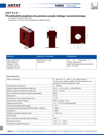 MBS NOWOŚCI CCT 31.3 I Przekładnik prądowy do pomiaru prądu stałego i przemiennego - do analizy i monitorowania sieci, - do pomiaru w sieciach niesinusoidalnych i odkształconych Wymiary Zgodność z normami: Podłączenia: szyna: 30x10 mm kabel: Ø28 mm długość: 70 mm wysokość: 92 mm szerokość: 48 mm DIN EN 50178, 1997 VDE 0160 UH + UH - 0 (Ground) IA Zaciski sprężynowe przekrój przyłączanych przewodów: 0.08…2.5 mm² Dane techniczne: Zakres pomiarowy: 0…300 A DC / 0…300 A Ieff AC, zależy od typu! (Znamionowe zakresy prądowe dostosowane do standardowych wartości zgodnych z IEC) Częstotliwość pomiarowa: 0…100 kHz Wyjście prądowe dla pomiaru prądu AC: AC: 0…± 14.14 mA Ieff, (± 20 mA IPeak) Wyjście prądowe dla pomiaru prądu DC: DC: 0…± 20 mA Max. rezystancja obciążenia wyjścia prądowego: 300 Ω Dokładność: 0,5 % Znamionowe maks. napięcie pracy Um: 1.2 kV Znamionowe napięcie izolacji: 6 kV, Ueff, 50 Hz, 1 min. Napięcie pomocnicze: ± 12…15 V DC, nieregulowalne Znamionowy prąd cieplny ciągły: 1.2 x IN Czas odpowiedzi skokowej (90% IPN, di/dt= 100A/μs): < 500 ns Przekładnia: 1:3000 Prędkość narastania sygnału di/dt: > 100 A / μs Klasa izolacji: E Max. temperatura uzwojenia pierwotnego: 100° C Temperatura pracy: -25° C < TU < +60° C Temperatura przechowywania: -40° C < TL < +90° C 6 ASTAT Sp. z o.o., 60-451 Poznań, ul. Dąbrowskiego 441, tel. 61 848 88 71, fax 61 848 82 76, www.astat.com.pl, [email protected] MBS NOWOŚCI Działanie przekładnika CCT 31.3 I: • Wyindukowany w uzwojeniu wtórnym prąd, proporcjonalny do strumienia magnetycznego, jest rejestrowany przez element półprzewodnikowy. Elektroniczny sterownik wbudowany w urządzenie zamienia sygnał z elementu półprzewodnikowego w sygnał prądowy, wprost proporcjonalny do mierzonej wartości. • Indukcyjny, bezstykowy pomiar zapewnia galwaniczną izolację sygnału wyjściowego. • Przyłączenie obwodów zewnętrznych do przekładnika realizowane jest przez 4-biegunowy zacisk sprężynowy. Zacisk ten umożliwia podłączenie przewodów o przekroju do 2.5 mm². • Część elektroniczna przekładnika wymaga zasilania napięciem pomocniczym ± 12 V. Zalety przekładnika CCT 31.3 I: • • • • • • • • Pomiar zarówno prądu stałego jak i przemiennego za pomocą jednego urządzenia. Dowolne przebiegi czasowe mierzonego prądu są odwzorowane proporcjonalnie. Duży zakres częstotliwości pracy: 0 Hz (DC)…100 kHz (AC). Duże bezpieczeństwo elektryczne dzięki galwanicznej izolacji pomiaru. Proste i bezpieczne przyłączanie obwodów zewnętrznych dzięki zastosowaniu zacisków sprężynowych. Bezpośredni montaż na szynie prądowej za pomocą śrub mocujących. Montaż na szynie DIN 35mm za pomocą dodatkowych elementów mocujących. Wysoka klimatyczna i mechaniczna wytrzymałość dzięki całkowitemu utwardzeniu elementów elektronicznych Charakterystyka przetwarzania przekładnika CCT 31.3 I: Typ CCT 31.3 I Prąd pierwotny [A] Nr katalogowy 50 1101-10001 100 1101-10003 150 1101-10005 200 1101-10006 250 1101-10007 300 1101-10008 Wyjście prądowe 0…+/-20mA 7 ASTAT Sp. z o.o., 60-451 Poznań, ul. Dąbrowskiego 441, tel. 61 848 88 71, fax 61 848 82 76, www.astat.com.pl, [email protected]