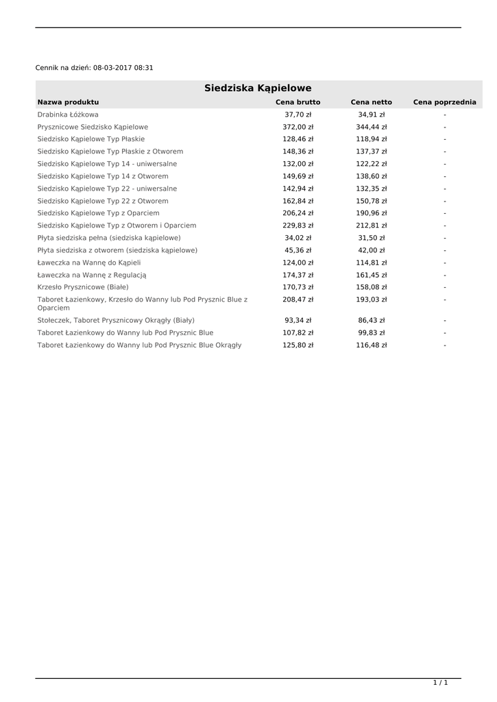 Cennik na dzień: 08-03-2017 08:31 Siedziska Kąpielowe Nazwa produktu Drabinka Łóżkowa Cena brutto Cena netto Cena poprzednia 37,70 zł 34,91 zł - Prysznicowe Siedzisko Kąpielowe 372,00 zł 344,44 zł - Siedzisko Kąpielowe Typ Płaskie 128,46 zł 118,94 zł - Siedzisko Kąpielowe Typ Płaskie z Otworem 148,36 zł 137,37 zł - Siedzisko Kąpielowe Typ 14 - uniwersalne 132,00 zł 122,22 zł - Siedzisko Kąpielowe Typ 14 z Otworem 149,69 zł 138,60 zł - Siedzisko Kąpielowe Typ 22 - uniwersalne 142,94 zł 132,35 zł - Siedzisko Kąpielowe Typ 22 z Otworem 162,84 zł 150,78 zł - Siedzisko Kąpielowe Typ z Oparciem 206,24 zł 190,96 zł - Siedzisko Kąpielowe Typ z Otworem i Oparciem 229,83 zł 212,81 zł - Płyta siedziska pełna (siedziska kąpielowe) 34,02 zł 31,50 zł - Płyta siedziska z otworem (siedziska kąpielowe) 45,36 zł 42,00 zł - Ławeczka na Wannę do Kąpieli 124,00 zł 114,81 zł - Ławeczka na Wannę z Regulacją 174,37 zł 161,45 zł - Krzesło Prysznicowe (Białe) 170,73 zł 158,08 zł - Taboret Łazienkowy, Krzesło do Wanny lub Pod Prysznic Blue z Oparciem 208,47 zł 193,03 zł - 93,34 zł 86,43 zł - Taboret Łazienkowy do Wanny lub Pod Prysznic Blue 107,82 zł 99,83 zł - Taboret Łazienkowy do Wanny lub Pod Prysznic Blue Okrągły 125,80 zł 116,48 zł - Stołeczek, Taboret Prysznicowy Okrągły (Biały) 1/1 Powered by TCPDF (www.tcpdf.org)