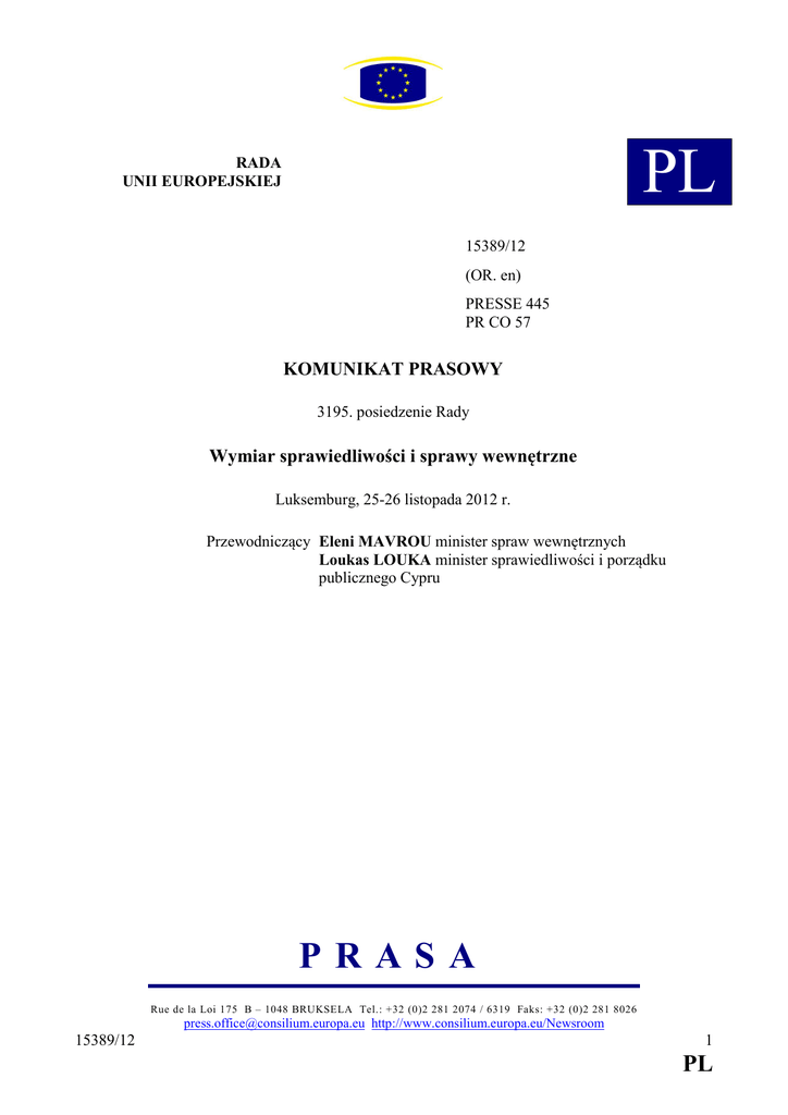 PL RADA UII EUROPEJSKIEJ 15389/12 (OR. en) PRESSE 445 PR CO 57 KOMUIKAT PRASOWY 3195. posiedzenie Rady Wymiar sprawiedliwości i sprawy wewnętrzne Luksemburg, 25-26 listopada 2012 r. Przewodniczący Eleni MAVROU minister spraw wewnętrznych Loukas LOUKA minister sprawiedliwości i porządku publicznego Cypru PRASA Rue de la Loi 175 B – 1048 BRUKSELA Tel.: +32 (0)2 281 2074 / 6319 Faks: +32 (0)2 281 8026 [email protected] http://www.consilium.europa.eu/Newsroom 15389/12 1 PL 25.-26.XI.2012 Główne wyniki posiedzenia Rady Ministrowie spraw wewnętrznych zatwierdzili ustanowienie regionalnego programu ochrony dla Syrii, będącego odpowiedzią na kryzys w tym kraju. Przeprowadzili także debatę orientacyjną na temat wniosku dotyczącego decyzji w sprawie unijnego mechanizmu ochrony ludności i przyjęli do wiadomości aktualną sytuację dotyczącą pełnego stosowania przepisów dorobku Schengen w Bułgarii i Rumunii, a także ustanowienia wspólnego europejskiego systemu azylowego (CEAS). Rada przyjęła następnie konkluzje w sprawie ochrony miękkich celów przed atakami terrorystycznymi oraz przyjęła do wiadomości sprawozdanie z wykonania dotyczące wzmocnienia związku między wewnętrznymi a zewnętrznymi aspektami przeciwdziałania terroryzmowi. Komisja przedstawiła sprawozdanie na temat nielegalnego handlu bronią palną, a Węgry poinformowały o wynikach konferencji poświęconej Grupie Salzburskiej w sprawie współpracy policyjnej. Prezydencja przekazała krótkie informacje na temat stanu zaawansowania prac nad innymi wnioskami ustawodawczymi w dziedzinie stosunków wewnętrznych. Komitet Mieszany (UE, )orwegia, Islandia, Liechtenstein i Szwajcaria), który zebrał się przy okazji posiedzenia Rady, przeanalizował również kwestię przystąpienia Bułgarii i Rumunii do strefy Schengen. )astępnie Rada zapoznała się z aktualną sytuacją w zakresie wdrażania systemu informacyjnego Schengen (SIS II) oraz z rozwojem wydarzeń i tendencjami w odniesieniu do nielegalnej imigracji, która dotyka obecnie UE. W tym kontekście komitet ten został poinformowany o greckim krajowym planie działania w zakresie reformy azylowej i zarządzania migracją. Komisja przedstawiła również swoje trzecie sprawozdanie w sprawie monitorowania sytuacji po liberalizacji systemu wizowego w państwach Bałkanów Zachodnich. Ministrowie sprawiedliwości przedstawili aktualną sytuację i przeprowadzili debatę w sprawie dwóch wniosków dotyczących dyrektyw: w sprawie sankcji karnych za wykorzystywanie informacji poufnych i manipulacje na rynku („dyrektywa o nadużyciach na rynku”) oraz w sprawie zamrożenia i konfiskaty dochodów pochodzących z działalności przestępczej w UE. Ministrowie omówili następnie zalecenia zawarte w końcowym sprawozdaniu z piątej rundy wzajemnych ocen, które zostało poświęcone przestępstwom finansowym i dochodzeniom finansowym. Rada wysłuchała prezentacji Komisji w sprawie wniosku dotyczącego dyrektywy w sprawie zwalczania nadużyć na szkodę interesów finansowych Unii za pośrednictwem prawa karnego. Ponadto Rada przyjęła do wiadomości aktualną sytuację w związku z przeglądem dyrektywy z 1995 roku w sprawie ochrony osób fizycznych w związku z przetwarzaniem danych osobowych i swobodnym przepływem takich danych (ogólne rozporządzenie o ochronie danych). Europejskie Centrum Monitorowania /arkotyków i /arkomanii (EMCDDA) przedstawiło 15389/12 2 PL 25.-26.XI.2012 sprawozdanie z 2012 roku na temat sytuacji w zakresie problemu narkotykowego w Europie. Wśród ważnych punktów przyjętych bez dyskusji (punktów A) było porozumienie polityczne z Parlamentem Europejskim co do dyrektyw w sprawie warunków przyjmowania, które to akty są częścią pakietu ustawodawczego dotyczącego wspólnego europejskiego systemu azylowego (CEAS), a także nowe przepisy mające uprościć dostęp do funduszy unijnych. Innym ważnym pozaustawodawczym dossier przyjętym jako punkt A jest pierwszy copółroczny przegląd dokumentu pt. „Działania UE w sprawie presji migracyjnej – reakcja strategiczna”, który zawiera ponad 90 działań mających za cel zwalczanie nielegalnej migracji. 15389/12 3 PL 25.-26.XI.2012 SPIS TREŚCI1 UCZESTICY ................................................................................................................................... 7 OMAWIAE PUKTY Wspólny europejski system azylowy (CEAS) ..................................................................................... 9 Unijny mechanizm ochrony ludności ................................................................................................ 10 Przystąpienie Rumunii i Bułgarii do strefy Schengen ....................................................................... 11 Syria: regionalny program ochrony ................................................................................................... 12 Przeciwdziałanie terroryzmowi: ochrona miękkich celów ................................................................ 13 Przeciwdziałanie terroryzmowi: związek między aspektami wewnętrznymi a zewnętrznymi ......... 13 Zamrażanie i konfiskata dochodów pochodzących z działalności przestępczej................................ 14 Przestępstwa finansowe i dochodzenia finansowe............................................................................. 14 Sytuacja w zakresie problemu narkotykowego.................................................................................. 15 Ochrona interesów finansowych UE.................................................................................................. 15 Przetwarzanie danych osobowych ..................................................................................................... 16 Wykorzystywanie informacji poufnych i manipulacje na rynku ....................................................... 16 Sprawy różne..........................................................