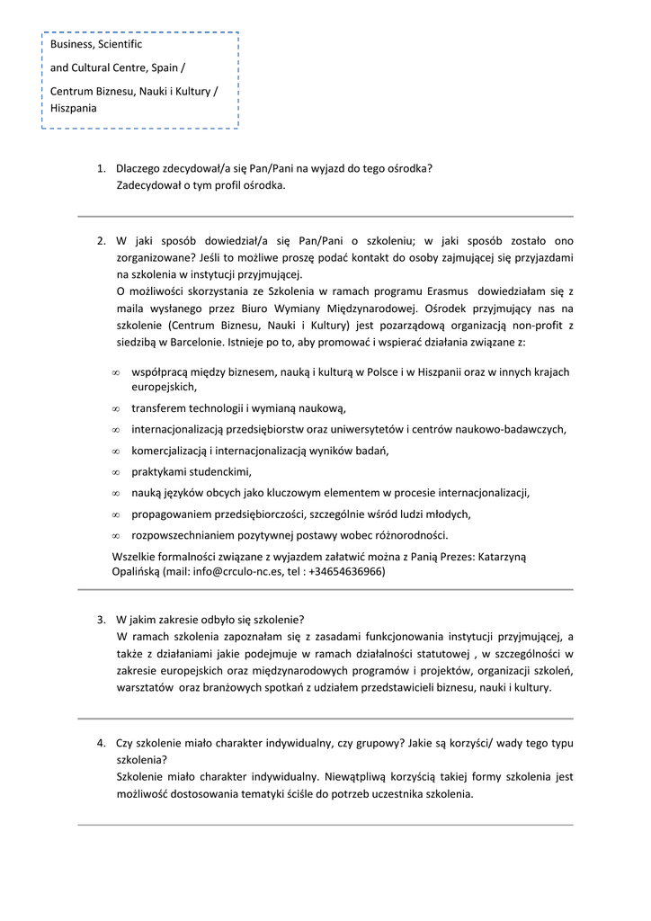Business, Scientific and Cultural Centre, Spain / Centrum Biznesu, Nauki i Kultury / Hiszpania 1. Dlaczego zdecydował/a się Pan/Pani na wyjazd do tego ośrodka? Zadecydował o tym profil ośrodka. 2. W jaki sposób dowiedział/a się Pan/Pani o szkoleniu; w jaki sposób zostało ono zorganizowane? Jeśli to możliwe proszę podać kontakt do osoby zajmującej się przyjazdami na szkolenia w instytucji przyjmującej. O możliwości skorzystania ze Szkolenia w ramach programu Erasmus dowiedziałam się z maila wysłanego przez Biuro Wymiany Międzynarodowej. Ośrodek przyjmujący nas na szkolenie (Centrum Biznesu, Nauki i Kultury) jest pozarządową organizacją non-profit z siedzibą w Barcelonie. Istnieje po to, aby promować i wspierać działania związane z: • współpracą między biznesem, nauką i kulturą w Polsce i w Hiszpanii oraz w innych krajach europejskich, • transferem technologii i wymianą naukową, • internacjonalizacją przedsiębiorstw oraz uniwersytetów i centrów naukowo-badawczych, • komercjalizacją i internacjonalizacją wyników badań, • praktykami studenckimi, • nauką języków obcych jako kluczowym elementem w procesie internacjonalizacji, • propagowaniem przedsiębiorczości, szczególnie wśród ludzi młodych, • rozpowszechnianiem pozytywnej postawy wobec różnorodności. Wszelkie formalności związane z wyjazdem załatwić można z Panią Prezes: Katarzyną Opalińską (mail: [email protected], tel : +34654636966) 3. W jakim zakresie odbyło się szkolenie? W ramach szkolenia zapoznałam się z zasadami funkcjonowania instytucji przyjmującej, a także z działaniami jakie podejmuje w ramach działalności statutowej , w szczególności w zakresie europejskich oraz międzynarodowych programów i projektów, organizacji szkoleń, warsztatów oraz branżowych spotkań z udziałem przedstawicieli biznesu, nauki i kultury. 4. Czy szkolenie miało charakter indywidualny, czy grupowy? Jakie są korzyści/ wady tego typu szkolenia? Szkolenie miało charakter indywidualny. Niewątpliwą korzyścią takiej formy szkolenia jest możliwość dostosowania tematyki ściśle do potrzeb uczestnika szkolenia. 5. W jaki sposób było prowadzone szkolenie? (warsztaty, wykłady, spotkania indywidualne itp.) Spotkania indywidualne. 6. Jakie umiejętności nabył/a Pan/Pani podczas szkolenia, które przydadzą się w pracy w Politechnice Lubelskiej? Umiejętność współpracy, poprawienie umiejętności językowych, zorganizowania sobie szkolenia, zbudowanie siatki kontaktów. 7. Jakie działania promujące internacjonalizację są prowadzone przez ośrodek, w którym odbywało się szkolenie? Centrum Biznesu, Nauki i Kultury promuje internacjonalizację poprzez: • udział w europejskich oraz międzynarodowych programach i projektach, • organizację szkoleń, warsztatów, webinarów oraz branżowych spotkań z udziałem przedstawicieli biznesu, nauki i kultury, • budowanie baz danych firm jak również instytucji i organizacji rządowych i pozarządowych wspomagających wdrażanie badań naukowych, • oraganizację wystaw oraz warsztatów arytstycznych, także dla najmłodszych, • prowadzenie kursów językowych (język polski, hiszpański, kataloński, angielski, niemiecki i rosyjski) oraz szkoleń międzykulturowych dla wszystkich grup wiekowych. 8. Jak zbudowany jest ośrodek pod względem infrastruktury? Czy jest położony na kampusie, jeżeli jest to uczelnia? Czy jest dobrze skomunikowany z centrum miasta? Ośrodek położony jest w Centrum Barcelony, niedaleko Placu Katalońskiego. 9. Koszty wyjazdu – proszę podać informacje dotyczące kosztów zakwaterowania i pobytu. W jakim stopniu stypendium wystarczyło na pokrycie kosztów wyjazdów? Na wynajęcie mieszkania przeznaczyłam 250 euro, pobyt kosztował mnie ok. 400 euro. Stypendium wystarczyło w pełni na pokrycie kosztów wyjazdu.