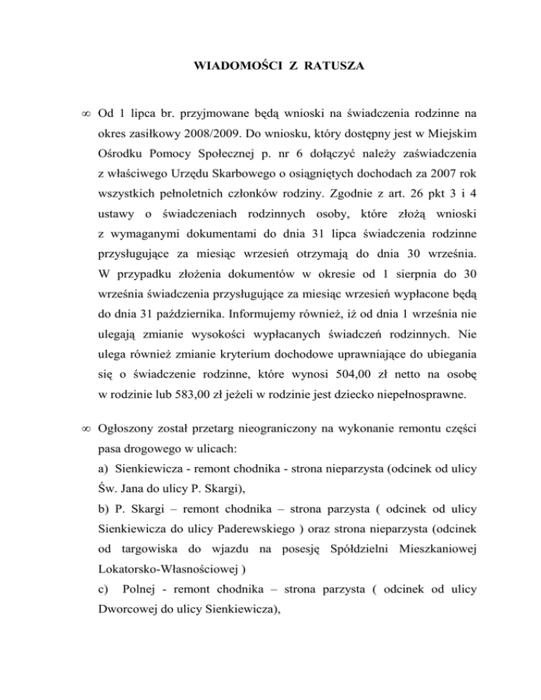 WIADOMOŚCI Z RATUSZA • Od 1 lipca br. przyjmowane będą wnioski na świadczenia rodzinne na okres zasiłkowy 2008/2009. Do wniosku, który dostępny jest w Miejskim Ośrodku Pomocy Społecznej p. nr 6 dołączyć naleŜy zaświadczenia z właściwego Urzędu Skarbowego o osiągniętych dochodach za 2007 rok wszystkich pełnoletnich członków rodziny. Zgodnie z art. 26 pkt 3 i 4 ustawy o świadczeniach rodzinnych osoby, które złoŜą wnioski z wymaganymi dokumentami do dnia 31 lipca świadczenia rodzinne przysługujące za miesiąc wrzesień otrzymają do dnia 30 września. W przypadku złoŜenia dokumentów w okresie od 1 sierpnia do 30 września świadczenia przysługujące za miesiąc wrzesień wypłacone będą do dnia 31 października. Informujemy równieŜ, iŜ od dnia 1 września nie ulegają zmianie wysokości wypłacanych świadczeń rodzinnych. Nie ulega równieŜ zmianie kryterium dochodowe uprawniające do ubiegania się o świadczenie rodzinne, które wynosi 504,00 zł netto na osobę w rodzinie lub 583,00 zł jeŜeli w rodzinie jest dziecko niepełnosprawne. • Ogłoszony został przetarg nieograniczony na wykonanie remontu części pasa drogowego w ulicach: a) Sienkiewicza - remont chodnika - strona nieparzysta (odcinek od ulicy Św. Jana do ulicy P. Skargi), b) P. Skargi – remont chodnika – strona parzysta ( odcinek od ulicy Sienkiewicza do ulicy Paderewskiego ) oraz strona nieparzysta (odcinek od targowiska do wjazdu na posesję Spółdzielni Mieszkaniowej Lokatorsko-Własnościowej ) c) Polnej - remont chodnika – strona parzysta ( odcinek od ulicy Dworcowej do ulicy Sienkiewicza), - 2 - d) Szewskiej - remont chodnika – strona nieparzysta ( odcinek od posesji na skrzyŜowaniu ulicy Gen. Hallera z ulicą Szewską do ulicy Bł. Juty). Procedura przetargowa obejmuje równieŜ wykonanie prac remontowych związanych z utwardzeniem łącznika pomiędzy ulicą Górną i ulicą Poniatowskiego. Termin składania stosownych ofert jest wyznaczony na dzień 14 lipca 2008 r. do godz. 1200 . Ustalony został równieŜ w tym przetargu termin realizacji zadania na dzień 31 października br. Osoby zainteresowane przetargiem mogą zapoznać się z jego szczegółami na stronie internetowej Urzędu www.bip.chelmza.pl /zakładka przetargi/. • Ogłoszono nabór ofert na wykonanie cząstkowych remontów nawierzchni bitumicznych na drogach gminnych w granicach administracyjnych miasta ChełmŜy. Termin składania ofert mija 4 lipca 2008 r., o godz. 1000. Zamówienie będzie realizowane do kwoty 35.000,00 zł brutto. • Rozstrzygnięto postępowanie przetargowe prowadzone w trybie przetargu nieograniczonego na wykonanie projektu budowlanego „Rewitalizacja strefy śródmiejskiej ChełmŜy w części zlokalizowanej przy Jeziorze ChełmŜyńskim ( od ulicy Tumskiej do ulicy Toruńskiej)”. PowyŜsze opracowanie wykona Biuro Architektoniczne Karola Krzątały, z siedzibą w Szczecinie, przy ulicy Ostrowickiej 4, za cenę brutto w wysokości 185.440,00 zł. Oferentowi został wyznaczony termin wykonania w/w projektu do dnia 28 sierpnia 2008 roku. • Burmistrz Miasta ogłosił przetarg ustny nieograniczony na sprzedaŜ zabudowanej i zagospodarowanej nieruchomości komunalnej połoŜonej - 3w ChełmŜy, przy ulicy Rybaki 1A za cenę wywoławczą 60.000,00 zł netto. Przetarg odbędzie się dnia 25 lipca br. o godz. 9ºº w Biurze Rady Miejskiej /budynek Urzędu Miasta ChełmŜy przy ul.Gen.J.Hallera 2, pok.nr 12/. Szczegółowe informacje o przetargu moŜna znaleźć na stronie internetowej urzędu: www.bip.chelmza.pl /zakładka przetargi/. • Na tablicy ogłoszeń Urzędu Miasta wywieszony został wykaz nieruchomości przeznaczonych gruntowych do pod sprzedaŜy budowę w garaŜy trybie murowanych, przetargu ustnego nieograniczonego. Zgodnie z ustaloną procedurą, w połowie lipca br. ukaŜe się ogłoszenie o przetargu na zbycie tych 19 działek, kaŜdej o powierzchni 23 m², połoŜonych przy ulicy Toruńskiej. • W terminie do końca lipca br. zarządcy nieruchomości zabudowanych nienaleŜących do publicznego zasobu mieszkaniowego, zobowiązani są do przekazywania gminie zestawienia czynszów najmu lokali mieszkalnych w zarządzanych budynkach. Wzór formularza, na którym naleŜy złoŜyć przedmiotowe zestawienie moŜna znaleźć w Rozporządzeniu Ministra Infrastruktury z dnia 27 grudnia 2007 roku w sprawie określenia danych dotyczących czynszów najmu lokali mieszkalnych nienaleŜących do publicznego zasobu mieszkaniowego, połoŜonego na obszarze gminy lub jego części (Dz. U. Nr 250, poz.1873). • W dniu 5 czerwca odbyło się szkolenie z zasad ochrony tajemnicy słuŜbowej dla niedawno zatrudnionych pracowników Urzędu Miasta. W ten sposób zakończone zostały procedury umoŜliwiające tym osobom dostęp do informacji zawierających tajemnicę słuŜbową. Obowiązek ten wynika z ustawy o ochronie informacji niejawnych. - 4Szkolenie zakończył Zastępca Burmistrza ChełmŜy p. Marek Kuffel, który uroczyście wręczył wszystkim szkolonym odpowiednie certyfikaty. • W ramach realizacji programu zapobiegania przestępczości i poprawy bezpieczeństwa mieszkańców ChełmŜy „Bezpieczna ChełmŜa, Wydział Spraw z Społecznych Komisariatem i Policji Obywatelskich oraz Urzędu dyrektorami Miasta, szkół wspólnie chełmŜyńskich zorganizował egzaminy uczniów na kartę rowerową i motorowerową. Egzaminy odbyły się w dniach 11, 12 i 16 czerwca na placu manewrowym, przygotowanym przez p. Zbigniewa Konieczka na terenie Szkoły Podstawowej Nr 2. W egzaminach uczestniczyło 211 uczniów z Gimnazjum, Zespołu Szkól Specjalnych oraz wszystkich szkół podstawowych z terenu ChełmŜy. Sprawdzianowi bacznie przyglądali się rodzice niektórych uczniów. Wszystkim zainteresowanym udało się zdobyć kartę rowerową lub motorowerową. • W dniu 14 czerwca 2008 r. na Jeziorze ChełmŜyńskim odbyły się VII Regionalne Zawody Wędkarskie im. Józefa Ciemiel