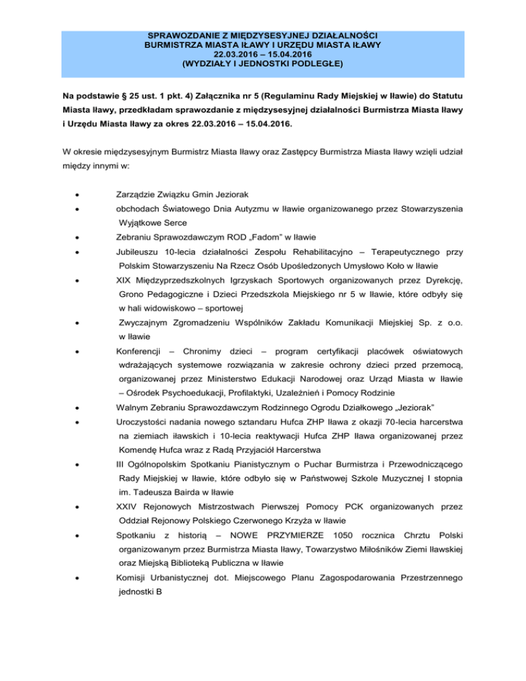 SPRAWOZDANIE Z MIĘDZYSESYJNEJ DZIAŁALNOŚCI BURMISTRZA MIASTA IŁAWY I URZĘDU MIASTA IŁAWY 22.03.2016 – 15.04.2016 (WYDZIAŁY I JEDNOSTKI PODLEGŁE) Na podstawie § 25 ust. 1 pkt. 4) Załącznika nr 5 (Regulaminu Rady Miejskiej w Iławie) do Statutu Miasta Iławy, przedkładam sprawozdanie z międzysesyjnej działalności Burmistrza Miasta Iławy i Urzędu Miasta Iławy za okres 22.03.2016 – 15.04.2016. W okresie międzysesyjnym Burmistrz Miasta Iławy oraz Zastępcy Burmistrza Miasta Iławy wzięli udział między innymi w: Zarządzie Związku Gmin Jeziorak obchodach Światowego Dnia Autyzmu w Iławie organizowanego przez Stowarzyszenia Wyjątkowe Serce Zebraniu Sprawozdawczym ROD „Fadom” w Iławie Jubileuszu 10-lecia działalności Zespołu Rehabilitacyjno – Terapeutycznego przy Polskim Stowarzyszeniu Na Rzecz Osób Upośledzonych Umysłowo Koło w Iławie XIX Międzyprzedszkolnych Igrzyskach Sportowych organizowanych przez Dyrekcję, Grono Pedagogiczne i Dzieci Przedszkola Miejskiego nr 5 w Iławie, które odbyły się w hali widowiskowo – sportowej Zwyczajnym Zgromadzeniu Wspólników Zakładu Komunikacji Miejskiej Sp. z o.o. w Iławie – Konferencji Chronimy dzieci – program certyfikacji placówek oświatowych wdrażających systemowe rozwiązania w zakresie ochrony dzieci przed przemocą, organizowanej przez Ministerstwo Edukacji Narodowej oraz Urząd Miasta w Iławie – Ośrodek Psychoedukacji, Profilaktyki, Uzależnień i Pomocy Rodzinie Walnym Zebraniu Sprawozdawczym Rodzinnego Ogrodu Działkowego „Jeziorak” Uroczystości nadania nowego sztandaru Hufca ZHP Iława z okazji 70-lecia harcerstwa na ziemiach iławskich i 10-lecia reaktywacji Hufca ZHP Iława organizowanej przez Komendę Hufca wraz z Radą Przyjaciół Harcerstwa III Ogólnopolskim Spotkaniu Pianistycznym o Puchar Burmistrza i Przewodniczącego Rady Miejskiej w Iławie, które odbyło się w Państwowej Szkole Muzycznej I stopnia im. Tadeusza Bairda w Iławie XXIV Rejonowych Mistrzostwach Pierwszej Pomocy PCK organizowanych przez Oddział Rejonowy Polskiego Czerwonego Krzyża w Iławie Spotkaniu z historią – NOWE PRZYMIERZE 1050 rocznica Chrztu Polski organizowanym przez Burmistrza Miasta Iławy, Towarzystwo Miłośników Ziemi Iławskiej oraz Miejską Biblioteką Publiczna w Iławie Komisji Urbanistycznej dot. Miejscowego Planu Zagospodarowania Przestrzennego jednostki B Spotkaniu z Wójtem Krzysztofem Harmacińskim w sprawie opracowania koncepcji dokumentacji na ścieżki rowerowe wychodzące na obszar gminy Spotkaniu z Jakubem Kowalskim i Karolem Kowalskim w sprawie umożliwienia organizacji warsztatów w Iławie na obiekcie „Pumptrack”, w celu podnoszenia umiejętności, propagowania zdrowego trybu życia i podnoszeniu świadomości bezpieczeństwa użytkowania spotkaniu z Edwardem Bojko i Lechem Jankowskim dot. przyszłości brydża w Iławie spotkaniu ze Zbigniewem Bączkiem i Ewą Wiśniewską, Dyrektor Iławskiego Centrum Kultury w Iławie w sprawie biesiad letnich w mieście spotkaniu z Sewerynem Szczepański, Piotrem Bryl i Ewą Wiśniewską, Dyrektor Iławskiego Centrum Kultury w Iławie w sprawie organizacji Święta Konstytucji 3 Maja spotkaniu z zarządem wspólnoty przy budynku ul. Kościuszki 35 dot. kontynuacji ciągów pieszo-jezdnych spotkaniu z Wiolettą Podgórską oraz dziećmi z Samorządowej szkoły Podstawowej nr 2 w Iławie w sprawie prezentacji napisanej książki spotkaniu z Wójtem Krzysztofem Harmacińskim w sprawie kalendarza świąt narodowych wizycie w Olsztynie u Wicemarszałka Województwa Warmińsko-Mazurskiego. Mirona Sycz wyjeździe do Malborka w sprawie omówienia pikniku lotników spotkaniu z Janem Kamińskim w sprawie negocjacji dot. stanu własnościowego na Ogrodach Działkowych spotkaniu z Mirosławem Milejskim w sprawie przywrócenia siedziby Energii w Iławie spotkaniu z firmą POL-MAK w sprawie omówienia budowy inwestycji towarzyszącej powstaniu zakładu bilansie w Miejskiej Bibliotece Publicznej w Iławie spotkaniu z Karolem Górskim dot. możliwości inwestowania w Iławie walnym zebraniu w Iławskim Towarzystwie Budownictwa Społecznego spotkaniu z malarką Agatą Topolewską w sprawie omówienia możliwości artystycznych i zarobkowych na rzecz Iławy spotkaniu ze Sławomirem Błaś z Krajowego Rejestru Długów w sprawie możliwości współpracy z marką spotkaniu z rada Rodziców Samorządowej Szkoły Podstawowej nr 3 w Iławie sprawie omówienia budowy galerii jazzowej przed szkołą spotkaniu ze Zbigniewem Borszewskim w sprawie działań Stowarzyszenia nad rzeką Iławką Wydział Planowania, Inwestycji i Monitoringu 1. W dn. 31.03.2016 r. zakończyły się czynności audytu zewnętrznego dla dwóch projektów współfinansowanych ze środków UE, dla których kończy się 5-letni okres trwałości projektu. Przedsięwzięcia te, to: 1) Zagospodarowanie turystyczne nabrzeży lokalnych akwenu w Iławie – Etap II. Budowa Centrum Turystyczno-Rekreacyjnego w Iławie 2) Budowa Obwodnicy Północnej w Iławie. Audyty wykonywał Biegły rewident Pan Maciej Słaby – z Jaworzyny Śląskiej. Wynagrodzenie audytora za dwa projekty wyniosło 3.850,00 zł brutto. 2. W dn. 31.03.2016 r. został ogłoszony przetarg nieograniczony na wykonanie wielobranżowej dokumentacji projektowej, audytu energetycznego, audytu instalacji oświetlenia wraz z obliczeniami efektu ekologicznego dla zadania inwestycyjnego pn. „Termomodernizacja budynków użyteczności publicznej Gminy Miejskiej Iława” dla Samorządowej Szkoły Podstawowej 2 oraz 4. Termin składania ofert upłynął w dniu 11.04.2016 r. Obecnie trwa procedura wyłonienia wykonawców na poszczególne dokumentacje. 3. W dn. 01.04.2016 r. oraz 11.04.2016 r. odbyły się rady budowy związane z przebudową plaży miejskiej przy ul. Kajki w Iławie. Prace idą zgodnie z harmonogramem. Planowany termin zakończenia robót budowlanych to 1 czerwiec 2016 r. Po tym terminie odbędą się niezbęd