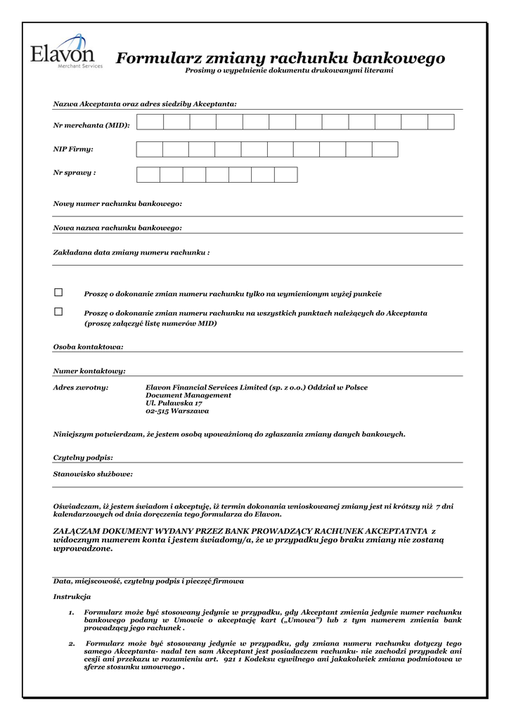 Formularz zmiany rachunku bankowego Prosimy o wypelnienie dokumentu drukowanymi literami Nazwa Akceptanta oraz adres siedziby Akceptanta: Nr merchanta (MID): NIP Firmy: Nr sprawy : Nowy numer rachunku bankowego: Nowa nazwa rachunku bankowego: Zakładana data zmiany numeru rachunku : □ □ Proszę o dokonanie zmian numeru rachunku tylko na wymienionym wyżej punkcie Proszę o dokonanie zmian numeru rachunku na wszystkich punktach należących do Akceptanta (proszę załączyć listę numerów MID) Osoba kontaktowa: Numer kontaktowy: Adres zwrotny: Elavon Financial Services Limited (sp. z o.o.) Oddział w Polsce Document Management Ul. Puławska 17 02-515 Warszawa Niniejszym potwierdzam, że jestem osobą upoważnioną do zgłaszania zmiany danych bankowych. Czytelny podpis: Stanowisko służbowe: Oświadczam, iż jestem świadom i akceptuję, iż termin dokonania wnioskowanej zmiany jest ni krótszy niż 7 dni kalendarzowych od dnia doręczenia tego formularza do Elavon. ZAŁĄCZAM DOKUMENT WYDANY PRZEZ BANK PROWADZĄCY RACHUNEK AKCEPTATNTA z widocznym numerem konta i jestem świadomy/a, że w przypadku jego braku zmiany nie zostaną wprowadzone. Data, miejscowość, czytelny podpis i pieczęć firmowa Instrukcja 1. Formularz może być stosowany jedynie w przypadku, gdy Akceptant zmienia jedynie numer rachunku bankowego podany w Umowie o akceptację kart („Umowa”) lub z tym numerem zmienia bank prowadzący jego rachunek . 2. Formularz może być stosowany jedynie w przypadku, gdy zmiana numeru rachunku dotyczy tego samego Akceptanta- nadal ten sam Akceptant jest posiadaczem rachunku- nie zachodzi przypadek ani cesji ani przekazu w rozumieniu art. 921 1 Kodeksu cywilnego ani jakakolwiek zmiana podmiotowa w sferze stosunku umownego .