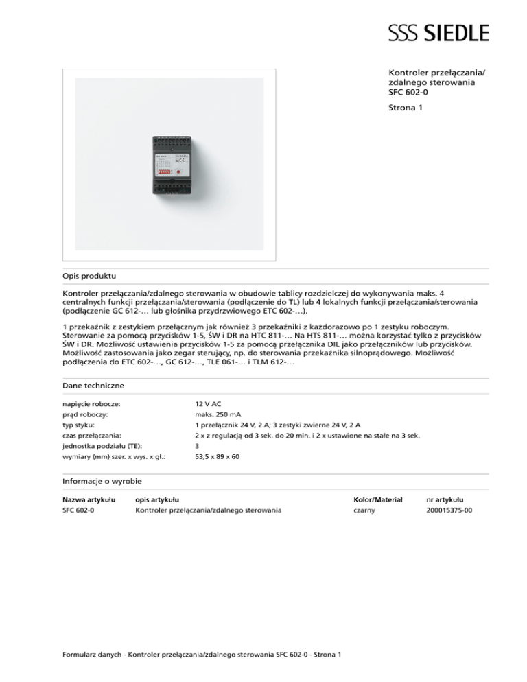 Kontroler przełączania/ zdalnego sterowania SFC 602-0 Strona 1 Opis produktu Kontroler przełączania/zdalnego sterowania w obudowie tablicy rozdzielczej do wykonywania maks. 4 centralnych funkcji przełączania/sterowania (podłączenie do TL) lub 4 lokalnych funkcji przełączania/sterowania (podłączenie GC 612-… lub głośnika przydrzwiowego ETC 602-…). 1 przekaźnik z zestykiem przełącznym jak również 3 przekaźniki z każdorazowo po 1 zestyku roboczym. Sterowanie za pomocą przycisków 1-5, ŚW i DR na HTC 811-… Na HTS 811-… można korzystać tylko z przycisków ŚW i DR. Możliwość ustawienia przycisków 1-5 za pomocą przełącznika DIL jako przełączników lub przycisków. Możliwość zastosowania jako zegar sterujący, np. do sterowania przekaźnika silnoprądowego. Możliwość podłączenia do ETC 602-…, GC 612-…, TLE 061-… i TLM 612-… Dane techniczne napięcie robocze: 12 V AC prąd roboczy: maks. 250 mA typ styku: 1 przełącznik 24 V, 2 A; 3 zestyki zwierne 24 V, 2 A czas przełączania: 2 x z regulacją od 3 sek. do 20 min. i 2 x ustawione na stałe na 3 sek. jednostka podziału (TE): 3 wymiary (mm) szer. x wys. x gł.: 53,5 x 89 x 60 Informacje o wyrobie Nazwa�artykułu opis�artykułu Kolor/Materiał nr�artykułu SFC 602-0 Kontroler przełączania/zdalnego sterowania czarny 200015375-00 Formularz danych - Kontroler przełączania/zdalnego sterowania SFC 602-0 - Strona 1 Kontroler przełączania/ zdalnego sterowania SFC 602-0 Strona 2 Osprzęt Nazwa�artykułu opis�artykułu Kolor/Materiał nr�artykułu ZAP 3-0 Osprzęt-Maskowanie zaciskowe czarny 200013442-01 Formularz danych - Kontroler przełączania/zdalnego sterowania SFC 602-0 - Strona 2 Kontroler przełączania/ zdalnego sterowania SFC 602-0 Strona 3 Formularz danych - Kontroler przełączania/zdalnego sterowania SFC 602-0 - Strona 3 Kontroler przełączania/ zdalnego sterowania SFC 602-0 Strona 4 SFC 602-0 Sterownik przełączania/ zdalnego sterowania Informacja o produktach SFC 602-... Deklaracja Zgodności Formularz danych - Kontroler przełączania/zdalnego sterowania SFC 602-0 - Strona 4 429 kB Pobieranie 13 kB Pobieranie