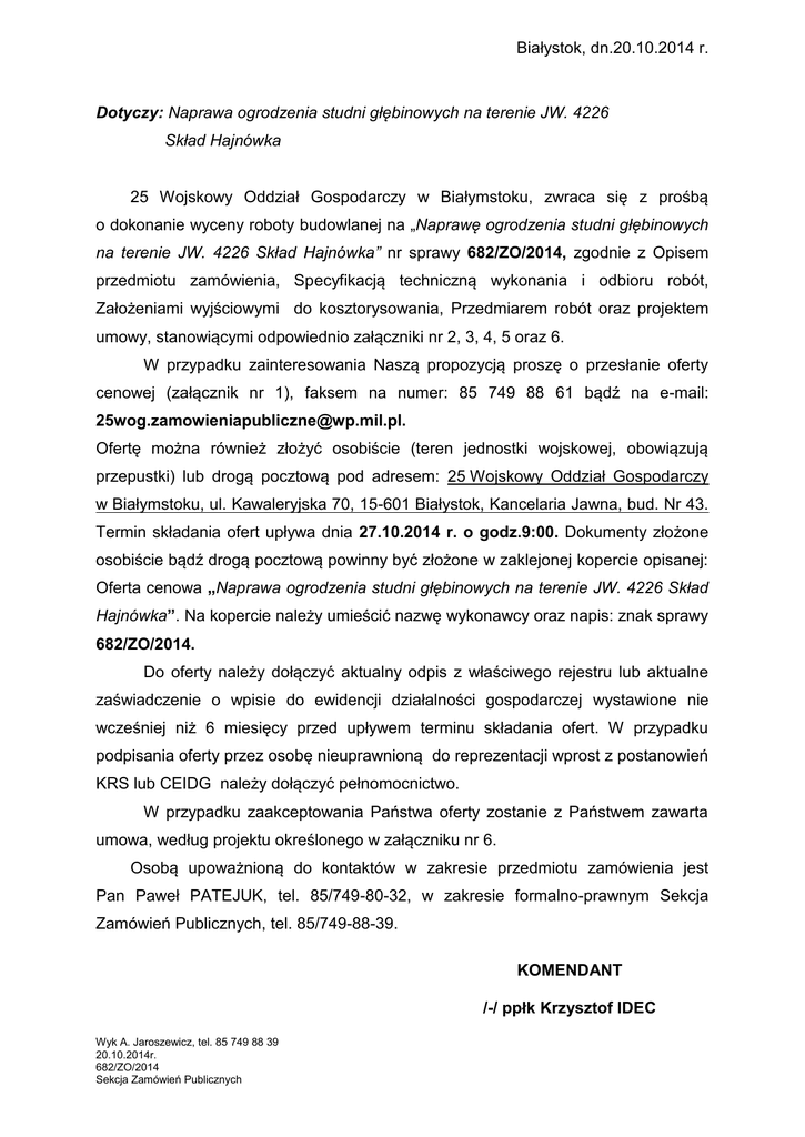 Białystok, dn.20.10.2014 r. Dotyczy: Naprawa ogrodzenia studni głębinowych na terenie JW. 4226 Skład Hajnówka 25 Wojskowy Oddział Gospodarczy w Białymstoku, zwraca się z prośbą o dokonanie wyceny roboty budowlanej na „Naprawę ogrodzenia studni głębinowych na terenie JW. 4226 Skład Hajnówka” nr sprawy 682/ZO/2014, zgodnie z Opisem przedmiotu zamówienia, Specyfikacją techniczną wykonania i odbioru robót, Założeniami wyjściowymi do kosztorysowania, Przedmiarem robót oraz projektem umowy, stanowiącymi odpowiednio załączniki nr 2, 3, 4, 5 oraz 6. W przypadku zainteresowania Naszą propozycją proszę o przesłanie oferty cenowej (załącznik nr 1), faksem na numer: 85 749 88 61 bądź na e-mail: [email protected]. Ofertę można również złożyć osobiście (teren jednostki wojskowej, obowiązują przepustki) lub drogą pocztową pod adresem: 25 Wojskowy Oddział Gospodarczy w Białymstoku, ul. Kawaleryjska 70, 15-601 Białystok, Kancelaria Jawna, bud. Nr 43. Termin składania ofert upływa dnia 27.10.2014 r. o godz.9:00. Dokumenty złożone osobiście bądź drogą pocztową powinny być złożone w zaklejonej kopercie opisanej: Oferta cenowa „Naprawa ogrodzenia studni głębinowych na terenie JW. 4226 Skład Hajnówka”. Na kopercie należy umieścić nazwę wykonawcy oraz napis: znak sprawy 682/ZO/2014. Do oferty należy dołączyć aktualny odpis z właściwego rejestru lub aktualne zaświadczenie o wpisie do ewidencji działalności gospodarczej wystawione nie wcześniej niż 6 miesięcy przed upływem terminu składania ofert. W przypadku podpisania oferty przez osobę nieuprawnioną do reprezentacji wprost z postanowień KRS lub CEIDG należy dołączyć pełnomocnictwo. W przypadku zaakceptowania Państwa oferty zostanie z Państwem zawarta umowa, według projektu określonego w załączniku nr 6. Osobą upoważnioną do kontaktów w zakresie przedmiotu zamówienia jest Pan Paweł PATEJUK, tel. 85/749-80-32, w zakresie formalno-prawnym Sekcja Zamówień Publicznych, tel. 85/749-88-39. KOMENDANT /-/ ppłk Krzysztof IDEC Wyk A. Jaroszewicz, tel. 85 749 88 39 20.10.2014r. 682/ZO/2014 Sekcja Zamówień Publicznych