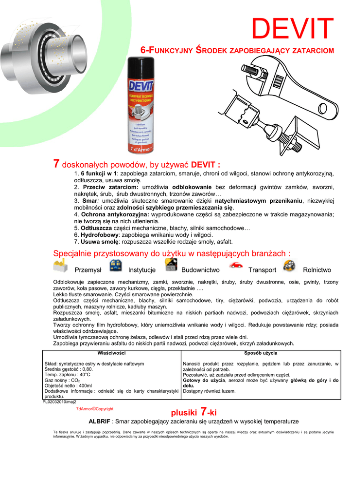 DEVIT 6-FUNKCYJNY ŚRODEK ZAPOBIEGAJĄCY ZATARCIOM 7 doskonałych powodów, by używać DEVIT : 1. 6 funkcji w 1: zapobiega zatarciom, smaruje, chroni od wilgoci, stanowi ochronę antykorozyjną, odtłuszcza, usuwa smołę. 2. Przeciw zatarciom: umożliwia odblokowanie bez deformacji gwintów zamków, sworzni, nakrętek, śrub, śrub dwustronnych, trzonów zaworów… 3. Smar: umożliwia skuteczne smarowanie dzięki natychmiastowym przenikaniu, niezwykłej mobilności oraz zdolności szybkiego przemieszczania się. 4. Ochrona antykorozyjna: wyprodukowane części są zabezpieczone w trakcie magazynowania; nie tworzą się na nich utlenienia. 5. Odtłuszcza części mechaniczne, blachy, silniki samochodowe… 6. Hydrofobowy: zapobiega wnikaniu wody i wilgoci. 7. Usuwa smołę: rozpuszcza wszelkie rodzaje smoły, asfalt. Specjalnie przystosowany do użytku w następujących branżach : Przemysł Instytucje Budownictwo Transport Rolnictwo Odblokowuje zapieczone mechanizmy, zamki, sworznie, nakrętki, śruby, śruby dwustronne, osie, gwinty, trzony zaworów, koła pasowe, zawory kurkowe, cięgła, przekładnie …. Lekko tłuste smarowanie. Czyści smarowane powierzchnie. Odtłuszcza części mechaniczne, blachy, silniki samochodowe, tiry, ciężarówki, podwozia, urządzenia do robót publicznych, maszyny rolnicze, kadłuby maszyn. Rozpuszcza smołę, asfalt, mieszanki bitumiczne na niskich partiach nadwozi, podwoziach ciężarówek, skrzyniach załadunkowych. Tworzy ochronny film hydrofobowy, który uniemożliwia wnikanie wody i wilgoci. Redukuje powstawanie rdzy; posiada właściwości odrdzewiające. Umożliwia tymczasową ochronę żelaza, odlewów i stali przed rdzą przez wiele dni. Zapobiega przywieraniu asfaltu do niskich partii nadwozi, podwozi ciężarówek, skrzyń załadunkowych. Właściwości Sposób użycia Skład: syntetyczne estry w destylacie naftowym Średnia gęstość : 0,80. Temp. zapłonu : 40°C Gaz nośny : CO2 Objetość netto : 400ml Dodatkowe informacje : odnieść się do karty charakterystyki produktu. Nanosić produkt przez rozpylanie, pędzlem lub przez zanurzanie, w zależności od potrzeb. Pozostawić, aż zadziała przed odkręceniem części. Gotowy do użycia, aerozol może być używany główką do góry i do dołu. Dostępny również luzem. PL02032010/maj2 7dArmor©Copyright plusiki 7-ki ALBRIF : Smar zapobiegający zacieraniu się urządzeń w wysokiej temperaturze Ta fiszka anuluje i zastępuje poprzednią. Dane zawarte w naszych opisach technicznych są oparte na naszej wiedzy oraz aktualnym doświadczeniu i są podane jedynie informacyjnie. W żadnym wypadku, nie odpowiadamy za przypadki nieodpowiedniego użycia naszych wyrobów.