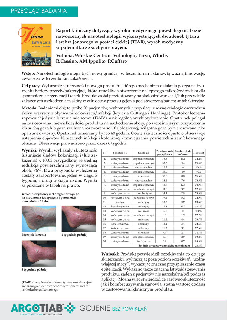 PRZEGLĄD BADANIA Raport kliniczny dotyczący wyrobu medycznego powstałego na bazie nowoczesnych nanotechnologii wykorzystujących dwutlenek tytanu i srebra jonowego w postaci ciekłej (TIAB), wyrób medyczny w pojemniku ze suchym sprayem. Vulnera, Włoskie Centrum Vulnologii, Turyn, Włochy R.Cassino, AM.Ippolito, P.Cuffaro Wstęp: Nanotechnologie mogą być „nową granicą” w leczeniu ran i stanowią ważną innowację, zwłaszcza w leczeniu ran zakażonych. Cel pracy: Wykazanie skuteczności nowego produktu, którego mechanizm działania polega na tworzeniu bariery przeciwbakteryjnej, która umożliwia stworzenie najlepszego mikrośrodowiska dla spontanicznej regeneracji tkanek. Produkt został przetestowany na skolonizowanych i/lub przewlekle zakażonych uszkodzeniach skóry w celu oceny procesu gojenia pod stworzoną barierą antybakteryjną. Metoda: Badaniami objęto próbę 20 pacjentów, wybranych z populacji z różną etiologią owrzodzeń skóry, wszyscy z objawami kolonizacji/infekcji (kryteria Cuttinga i Hardinga). Protokół leczenia zapewniał jedynie leczenie miejscowe (TiAB*), a nie ogólną antybiotykoterapię. Opatrunek polegał na zastosowaniu niewielkiej ilości produktu na uszkodzenia skóry, po wcześniejszym oczyszczeniu ich suchą gazą lub gazą zwilżoną roztworem soli fizjologicznej; wilgotna gaza była stosowana jako opatrunek wtórny. Opatrunek zmieniany był co 48 godzin. Ocenę skuteczności oparto o obserwację ustąpienia objawów klinicznych infekcji i kolonizacji/zmniejszenia powierzchni zainfekowanego obszaru. Obserwacje prowadzono przez okres 6 tygodni. Wyniki: Wyniki wykazały skuteczność (usunięcie śladów kolonizacji i/lub zakażenia) w 100% przypadków, ze średnią redukcją powierzchni rany wynoszącą około 76%. Dwa przypadki wyleczenia zostały zaraportowane: jeden w ciągu 5 tygodni, a drugi w ciągu 25 dni. Wyniki są pokazane w tabeli na prawo. Wrzód naczyniowy u chorego cierpiącego na zaburzenia krzepnięcia i przewlekłą niewydolność żylną. Nr 1. 2. 3. 4. 5. 6. kończyna dolna zapalenie naczyń kończyna dolna kończyna dolna kończyna dolna choroba żylna mieszana choroba żylna 36.3 33.5 27.2 23.9 37.6 28.6 10.1 9.4 0 4.9 8.8 7.6 42.6 12.4 9. kończyna dolna choroba żylna 14.4 2.9 8. 13. 14. kończyna dolna kończyna dolna krętarz kość krzyżowa kończyna dolna 19. 16.5 mieszana 21.6 4.4 odleżyny 11.3 3.1 odleżyny mieszana kończyna dolna 5.2 mieszana kończyna dolna kończyna dolna 19.2 3.2 23.5 odleżyny kość krzyżowa 11.8 odleżyny kość krzyżowa 17. 20. zapalenie naczyń zapalenie naczyń kończyna dolna 18. zapalenie naczyń kończyna dolna 15. 16. (TIAB*) kompleks dwutlenku tytanu kowalencyjnie związanego z jednowartościowymi jonami srebra i chlorku benzalkoniowego. zapalenie naczyń zapalenie naczyń 11. 3 tygodnie później zapalenie naczyń kończyna dolna Powierzchnia Powierzchnia Rezultat początkowa końcowa kończyna dolna 10. 2 tygodnie później kończyna dolna Etiologia 7. 12. Początek leczenia Lokalizacja zapalenie naczyń limfatyczna 5.7 17.8 11.2 8.5 1.9 12.4 7.4 6.7 6.9 0 3.4 2.1 2.0 0.7 Średnie procentowe zmniejszenie obszaru 72.2% 71.9% 100% 79.5 76.6% 73.5% 70.9% 72.9% 79.9% 72.9% 75.8% 37.1% 100% 77.7% 79.7% 72.6% 72.6% 71.7% 70.2% 89.9% 75.8% Wnioski: Produkt potwierdził oczekiwania co do jego skuteczności, wykraczając poza poziom oczekiwań „uzdrawiającej mocy”, wykazując znaczne przyspieszenie czasu epitelizacji. Wykazano także znaczną łatwość stosowania produktu, żaden z pacjentów nie narzekał na ból podczas aplikacji. Można więc stwierdzić, że zarówno skuteczność jak i komfort używania stanowią istotną wartość dodaną w zastosowaniu klinicznym produktu. GOJENIE BEZ POWIKŁAŃ