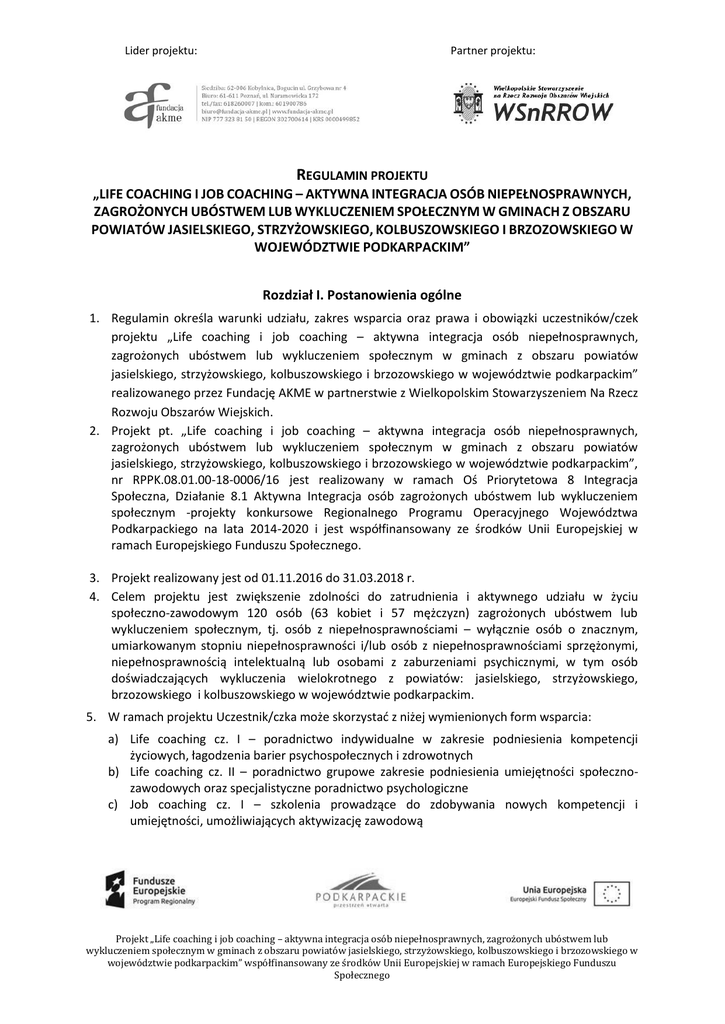 Lider projektu: Partner projektu: REGULAMIN PROJEKTU „LIFE COACHING I JOB COACHING – AKTYWNA INTEGRACJA OSÓB NIEPEŁNOSPRAWNYCH, ZAGROŻONYCH UBÓSTWEM LUB WYKLUCZENIEM SPOŁECZNYM W GMINACH Z OBSZARU POWIATÓW JASIELSKIEGO, STRZYŻOWSKIEGO, KOLBUSZOWSKIEGO I BRZOZOWSKIEGO W WOJEWÓDZTWIE PODKARPACKIM” Rozdział I. Postanowienia ogólne 1. Regulamin określa warunki udziału, zakres wsparcia oraz prawa i obowiązki uczestników/czek projektu „Life coaching i job coaching – aktywna integracja osób niepełnosprawnych, zagrożonych ubóstwem lub wykluczeniem społecznym w gminach z obszaru powiatów jasielskiego, strzyżowskiego, kolbuszowskiego i brzozowskiego w województwie podkarpackim” realizowanego przez Fundację AKME w partnerstwie z Wielkopolskim Stowarzyszeniem Na Rzecz Rozwoju Obszarów Wiejskich. 2. Projekt pt. „Life coaching i job coaching – aktywna integracja osób niepełnosprawnych, zagrożonych ubóstwem lub wykluczeniem społecznym w gminach z obszaru powiatów jasielskiego, strzyżowskiego, kolbuszowskiego i brzozowskiego w województwie podkarpackim”, nr RPPK.08.01.00-18-0006/16 jest realizowany w ramach Oś Priorytetowa 8 Integracja Społeczna, Działanie 8.1 Aktywna Integracja osób zagrożonych ubóstwem lub wykluczeniem społecznym -projekty konkursowe Regionalnego Programu Operacyjnego Województwa Podkarpackiego na lata 2014-2020 i jest współfinansowany ze środków Unii Europejskiej w ramach Europejskiego Funduszu Społecznego. 3. Projekt realizowany jest od 01.11.2016 do 31.03.2018 r. 4. Celem projektu jest zwiększenie zdolności do zatrudnienia i aktywnego udziału w życiu społeczno-zawodowym 120 osób (63 kobiet i 57 mężczyzn) zagrożonych ubóstwem lub wykluczeniem społecznym, tj. osób z niepełnosprawnościami – wyłącznie osób o znacznym, umiarkowanym stopniu niepełnosprawności i/lub osób z niepełnosprawnościami sprzężonymi, niepełnosprawnością intelektualną lub osobami z zaburzeniami psychicznymi, w tym osób doświadczających wykluczenia wielokrotnego z powiatów: jasielskiego, strzyżowskiego, brzozowskiego i kolbuszowskiego w województwie podkarpackim. 5. W ramach projektu Uczestnik/czka może skorzystać z niżej wymienionych form wsparcia: a) Life coaching cz. I – poradnictwo indywidualne w zakresie podniesienia kompetencji życiowych, łagodzenia barier psychospołecznych i zdrowotnych b) Life coaching cz. II – poradnictwo grupowe zakresie podniesienia umiejętności społecznozawodowych oraz specjalistyczne poradnictwo psychologiczne c) Job coaching cz. I – szkolenia prowadzące do zdobywania nowych kompetencji i umiejętności, umożliwiających aktywizację zawodową Projekt „Life coaching i job coaching – aktywna integracja osób niepełnosprawnych, zagrożonych ubóstwem lub wykluczeniem społecznym w gminach z obszaru powiatów jasielskiego, strzyżowskiego, kolbuszowskiego i brzozowskiego w województwie podkarpackim” współfinansowany ze środków Unii Europejskiej w ramach Europejskiego Funduszu Społecznego Lider projektu: Partner projektu: d) Job coaching cz. II – poradnictwo indywidualne w zakresie podniesienia umiejętności społeczno-zawodowych umożliwiających powrót na rynek pracy oraz specjalistyczne poradnictwo prawne 6. Udział w projekcie jest bezpłatny. Rozdział II. Słownik pojęć Ilekroć w regulaminie jest mowa o: 1. Realizatorze projektu – Fundację AKME 2. Programie – oznacza Regionalny Program Operacyjny Województwa Podkarpackiego Oś Priorytetowa 8 Integracja Społeczna, Działanie 8.1 Aktywna Integracja osób zagrożonych ubóstwem lub wykluczeniem społecznym -projekty konkursowe 3. Projekcie – oznacza Projekt „Life coaching i job coaching – aktywna integracja osób niepełnosprawnych, zagrożonych ubóstwem lub wykluczeniem społecznym w gminach z obszaru powiatów jasielskiego, strzyżowskiego, kolbuszowskiego i brzozowskiego w województwie podkarpackim” 4. Uczestniku Projektu – oznacza osobę, która przeszła pozytywnie procedurę rekrutacyjną i podpisała deklarację uczestnictwa w projekcie 5. Kandydacie – oznacza osobę, która złożyła komplet dokumentów rekrutacyjnych i bierze udział w procesie rekrutacyjnym do Projektu. Rozdział III. Warunki udziału Projekt skierowany jest do osób spełniających łącznie poniższe warunki: a) jest mieszkańcem jednego z powiatów województwa podkarpackiego: jasielskiego, strzyżowskiego, brzozowskiego, kolbuszowskiego b) jest osobą z niepełnosprawnościami w stopniu znacznym lub umiarkowanym i/lub osobą z niepełno sprawnościami sprzężonymi, z niepełnosprawnością intelektualną lub z zaburzeniami psychicznymi, w tym osobą doświadczającą wykluczenia wielokrotnego c) jest osobą w wieku 18-64 lata d) jest osobą bierna zawodowo, osoba bezrobotną lub poszukującą pracy. Warunkiem udziału w projekcie jest złożenie formularza rekrutacyjnego wraz z załącznikami oraz przejście procedury rekrutacji, przy czym Realizator projektu zastrzega sobie prawo dokonania takiego doboru Uczestników/czek, aby możliwe było zrealizowanie określonych we wniosku o dofinansowanie rezultatów i wskaźników. Projekt „Life coaching i job coaching – aktywna integracja osób niepełnosprawnych, zagrożonych ubóstwem lub wykluczeniem społecznym w gminach z obszaru powiatów jasielskiego, strzyżowskiego, kolbuszowskiego i brzozowskiego w województwie podkarpackim” współfinansowany ze środków Unii Europejskiej w ramach Europejskiego Funduszu Społecznego Lider projektu: Partner projektu: Rozdział IV. Rekrutacja 1. Rekrutacja do projektu odbywać się będzie z zachowaniem zasad równego dostępu i równego traktowania wszystkich osób zainteresowanych udziałem w projekcie. 2. Rekrutacja i formy wsparcia realizowane będą zgodnie z zasadą niedyskryminacji ze względu na płeć, rasę lub pochodzenie etniczne, narodowość, obywatelstwo, religię (wyznanie) lub światopogląd,