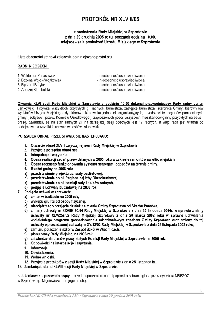 PROTOKÓŁ NR XLVIII/05 z posiedzenia Rady Miejskiej w Szprotawie z dnia 29 grudnia 2005 roku, początek godzina 10.00, miejsce - sala posiedzeń Urzędu Miejskiego w Szprotawie Lista obecności stanowi załącznik do niniejszego protokołu RADNI NIEOBECNI: 1. Waldemar Panasewicz 2. Bożena Wójcik-Wojtkowiak 3. Ryszard Barylak 4. Andrzej Stambulski - nieobecność usprawiedliwiona nieobecność usprawiedliwiona nieobecność usprawiedliwiona nieobecność usprawiedliwiona Otwarcia XLVI sesji Rady Miejskiej w Szprotawie o godzinie 10.00 dokonał przewodniczący Rady radny Julian Jankowski. Przywitał wszystkich przybyłych tj.: radnych, burmistrza, zastępcę burmistrza, skarbnika Gminy, kierowników wydziałów Urzędu Miejskiego, dyrektorów i kierownika jednostek organizacyjnych, przedstawicieli organów pomocniczych gminy ( sołtysów i przew. Komitetu Osiedlowego ), zaproszonych gości, wszystkich mieszkańców gminy przybyłych na sesję i prasę. Stwierdził, że na stan radnych 21 na dzisiejszej sesji obecnych jest 17 radnych, a więc rada jest władna do podejmowania wszelkich uchwał, wniosków i stanowisk. PORZĄDEK OBRAD PRZEDSTAWIA SIĘ NASTĘPUJĄCO: 1. Otwarcie obrad XLVIII zwyczajnej sesji Rady Miejskiej w Szprotawie 2. Przyjęcie porządku obrad sesji 3. Interpelacje i zapytania 4. Ocena realizacji zadań przewidzianych w 2005 roku w zakresie remontów świetlic wiejskich. 5. Ocena rocznego funkcjonowania systemu segregacji odpadów na terenie gminy. 6. Budżet gminy na 2006 rok: a) przedstawienie projektu uchwały budżetowej, b) przedstawienie opinii Regionalnej Izby Obrachunkowej c) przedstawienie opinii komisji rady i klubów radnych, d) podjęcie uchwały budżetowej na 2006 rok. 7. Podjęcie uchwał w sprawach: a) zmian w budżecie na 2005 rok, b) wykupu gruntu od osoby fizycznej, c) nieodpłatnego przejęcia działek na mienie Gminy Szprotawa od Skarbu Państwa, d) zmiany uchwały nr XXVIII/190/04 Rady Miejskiej w Szprotawie z dnia 30 listopada 2004r. w sprawie zmiany uchwały nr XLV/259/02 Rady Miejskiej Szprotawy z dnia 20 marca 2002 roku w sprawie uchwalenia wieloletniego programu gospodarowania mieszkaniowym zasobem Gminy Szprotawa oraz zmiany do tej uchwały wprowadzonej uchwałą nr XV/92/03 Rady Miejskiej w Szprotawie z dnia 28 listopada 2003 roku, e) zamiaru połączenia szkół w Zespół Szkół w Wiechlicach, f) planu pracy Rady Miejskiej na 2006 rok, g) zatwierdzenia planów pracy stałych Komisji Rady Miejskiej w Szprotawie na 2006 rok. 8. Odpowiedzi na interpelacje i zapytania. 9. Informacje. 10. Oświadczenia. 11. Wolne wnioski. 12. Przyjęcie protokołów z sesji Rady Miejskiej w Szprotawie z dnia 25 listopada br.. 13. Zamknięcie obrad XLVIII sesji Rady Miejskiej w Szprotawie. r. J. Jankowski - przewodniczący – przed rozpoczęciem obrad poprosił o zabranie głosu przez dyrektora MSPZOZ w Szprotawie p. Migniewicza – na jego prośbę. 1 Protokół nr XLVIII/05 z posiedzenia RM w Szprotawie z dnia 29 grudnia 2005 roku Edward Migniewicz – dyrektor MSPZOZ - poinformował że w wyniku braku porozumienia między Narodowym Funduszem Zdrowia, a lekarzami rodzinnymi, jest sytuacja praktycznie pewna, że od 2 stycznia gabinety lekarzy rodzinnych nie będą otwarte. Nakłada to dodatkowe obowiązki na innych świadczeniodawców. Powiedział, że zaraz jedzie do NFZ w celu ustalenia wszystkich uzgodnień. Stwierdził, że nie wie jak długo będzie trwała ta sytuacja, jednak na dzień dzisiejszy ZOZ uruchomi dodatkowo poradnię ogólną dla nagłych zachorowań. Poradnia ta będzie czynna od godziny 9.00 do 15.00 na bazie poradni chirurgicznej w szpitalu z wejściem od poradni K. Jeżeli będzie większa liczba pacjentów lekarz izby przyjęć także będzie udzielał pomocy w nagłych zachorowaniach. Mowa jest tutaj tylko o nagłych zachorowaniach, bo szpital nie jest przygotowany np. dokumentacyjnie do innych profilaktycznych zabiegów typu szczepienia, które standardowo wykonują lekarze rodzinni. Poprosił o rozpowszechnienie tej informacji, że lekarze rodzinni nie otworzą swoich gabinetów. r. Julian Jankowski przewodniczący -zapytał czy są uwagi do porządku obrad. r. Tadeusz Kosmatka- powiedział, że składa wniosek w związku ze stołówkami. Uważa, że Rada powinna zająć stanowisko i ustalenia w tej kwestii, chodzi o to aby radni mogli się w tym temacie wypowiedzieć, a jeżeli mieliby się wypowiedzieć to musi być punkt obrad w tym temacie. Powtórzył, że składa wniosek, aby ten punkt ująć w porządku dzisiejszej sesji. Najlepiej byłoby to umieścić na samym początku, żeby osoby zainteresowane nie musiały długo czekać. r. Zbigniew Teler- powiedział, że w imieniu Komisji Gospodarki stawia wniosek o zdjęcie z porządku obrad w pkt 7 ppkt. e tj.: podjęcie uchwały w sprawie zamiaru połączenia szkół w Zespół Szkół w Wiechlicach. Na dzień dzisiejszy komisja nie wyklucza takiej możliwości, uważa jednak, że nie można kierować się emocjami. Jest bardzo dużo ważnych tematów do rozwiązania w dniu dzisiejszym, a ten temat należy przeanalizować dogłębnie przez Komisję Społeczną lub przez Komisję Doraźną powołaną przez Wysoką Radę. Termin ustawowy do podjęcia uchwały w tym temacie jest do końca lutego, jest więc dwa m-ce czasu na podjęcie tej uchwały. Nie tylko podjęcie uchwały załatwia ten temat, ale są także pewne procedury z tym związane. r. Andrzej Skawiński – wiceprzewodniczący - skierował zapytanie do r, Kosmatki o to jaki punkt ma zostać wprowadzony do sesji, aby to uściślił, czy to ma być ocena czegoś, czy to ma być informacja na jakiś temat, czy to ma być podjęcie uchwały w jakiejś sprawie. Zapytał jak ten punkt ma brzmieć dokładnie. r. Tadeusz Kosmatka- stwierdził, że chodzi o to, by rada zajęła się sprawą planowanej likwidacji stołówek w szkołach. Stwierdził, że odbyło się niewiążące spotkanie w tej sprawie, jednak nie wszyscy radni w