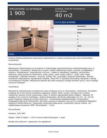 Kraków, Kraków-Krowodrza, Poznańska MIESZKANIE na WYNAJEM 1 900 40 m2 1473/3814/OMW Secondary ApartmentRetailBuilding 2016 3 5 2 Open 1 Opis Victoria Estate prezentuje nowoczesny apartament w nowej inwestycji przy ulicy Poznańskiej Krowodrza! Nieruchomość: Mieszkanie zlokalizowane na III piętrze V- piętrowego apartamentowca zlokalizowanego przy ul. Poznańskiej - Krowodrza. Składa się z kuchni, dwóch oddzielnych pokoi, łazienki, przedpokoju i balkonu. Umeblowane i wyposażone: kuchnia - meble w zabudowie, lodówka, zamrażarka, piekarnik, płyta grzewcza indukcyjna, okap; pokój - sofa, szafa; pokój II - szafa, sofa, regał; przedpokój - wieszak; łazienka - prysznic, pralka, WC, umywalka, grzejnik drabinkowy. Istnieje możliwość doposażenia. Ogrzewanie miejskie. Okna PCV z wystawą wschodnią. Budynek z windą, na strzeżonym osiedlu. Mieszkanie idealne dla osób ceniących wysoki komfort życia i rytm ścisłego centrum Krakowa! Lokalizacja: Mieszkanie zlokalizowane w północnej części Krakowa przy ul. Poznańskiej - Krowodrza. W pobliżu znajdują się liczne punkty handlowo-usługowe: Żabka, bank, fryzjer, kosmetyczka, punkty medyczne, poczta, liczne restauracje i bary; w bliskim sąsiedztwie Nowy Kleparz - bazarek. W zasięgu 2 km centrum handlowe - Galeria Krakowska. Do Rynku Głównego 2,5 km - ok. 10 min jazdy. Dogodny dojazd do uczelni wyższych - Uniwersytetu Jagiellońskiego, Uniwersytetu Pedagogicznego oraz Politechniki. Dla osób ceniących aktywny tryb życia w niedalekiej odległości siłownia Fitness Platinium. Doskonale rozwinięte połączenie z pozostałą częścią miasta - do najbliższego przystanku MPK "Wrocławska" - 3 min. Komunikacja: Autobus: 130, 904 Opłaty: 1900 zł najem + 310 zł czynsz administracyjny + prąd Serdecznie polecam i zapraszam do oglądania! Victoria Estate Paulina Zajdel tel. +48 789 453 049 email: [email protected] Victoria Estate Powered by TCPDF (www.tcpdf.org)