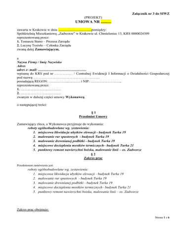 Załącznik nr 3 do SIWZ (PROJEKT) UMOWA NR .......... zawarta w Krakowie w dniu .....................................pomiędzy: Spółdzielnią Mieszkaniową „Zadworze” w Krakowie ul. Chmieleniec 13, KRS 0000024309 reprezentowaną przez: 1. Tomasza Stano – Prezesa Zarządu 2. Lucynę Trzósło – Członka Zarządu zwaną dalej Zamawiającym, a Nazwa Firmy / Imię Nazwisko Adres adres e- mail: ...................................................... wpisaną do KRS pod nr …………… / Centralnej Ewidencji I Informacji o Działalności Gospodarczej pod nazwą ……………………………………………….. posiadającą REGON: ……………..………. i NIP: ……………………., reprezentowaną przez: 1. ……………………………. 2. ……………………………. zwanym w dalszej części umowy Wykonawcą. o następującej treści: §1 Przedmiot Umowy Zamawiający zleca, a Wykonawca przyjmuje do wykonania: roboty ogólnobudowlane wg. zestawienia: 1. miejscowa likwidacja ubytków elewacji - budynek Turka 19 2. malowanie rur spustowych - budynek Turka 19 3. malowanie drewnianej podbitki - budynek Turka 19 4. miejscowe docieplenia mostków termicznych– budynek Turka 21 5. punktowy remont nawierzchni boiska, malowanie linii – os. Zadworze §2 Zakres prac Przedmiotem zamówienia jest: roboty ogólnobudowlane wg. zestawienia: 1. miejscowa likwidacja ubytków elewacji - budynek Turka 19 2. malowanie rur spustowych - budynek Turka 19 3. malowanie drewnianej podbitki - budynek Turka 19 4. miejscowe docieplenia mostków termicznych– budynek Turka 21 5. punktowy remont nawierzchni boiska, malowanie linii – os. Zadworze Zakres prac obejmuje: Strona 1 z 6 Wykonanie niezbędnych zabezpieczeń BHP na stanowiskach roboczych oraz bezpośredniej strefy przy budynkowej oraz wywieszenie znaków ostrzegawczo informacyjnych wokół strefy zagrożenia, wykonanie zadaszenia nad chodnikiem do budynku – dla wszystkich robót. Ad. 1. Montaż i demontaż rusztowania, usunięcie odspojonego tynku w miejscach wskazanych przez zamawiającego, zagruntowanie podłoża, wykonanie tynku zewnętrznego dobranego kolorystycznie do elewacji budynku, prace porządkowe Ad. 2. Prace należy wykonać z podnośnika samochodowego. Czyszczenie rur spustowych, miejscowe naprawy i w razie konieczności wymiany uszkodzonych elementów, poprawa kotwienia rur do elewacji, montaż kolców przeciw ptakom w części poziomej, usunięcie łuszczącej się farby, malowanie farbą podkładową, malowanie farbą nawierzchniową, kolor brązowy – przed przystąpieniem do prac należy przedstawić zamawiającemu do zatwierdzenia Ad. 3. Prace należy wykonać z podnośnika samochodowego. miejscowe naprawy i w razie konieczności wymiany uszkodzonych elementów, czyszczenie elementów podbitki, malowanie drewnochronem lub innym środkiem do drewna. Ad. 4. Prace należy wykonać z podnośnika samochodowego. Oczyszczenie szczelin dylatacyjnych, zagruntowanie podłoża, wprowadzenie środka izolującego pod ciśnieniem do szczeliny dylatacyjnej, montaż listwy maskującej, prace miejscowe w innych miejscach wskazanych przez Zamawiajacego Ad. 5. Wycięcie asfaltu w miejscach pęknięć, zagruntowanie podłoża, dogęszczenie podbudowy (w razie konieczności wymiana lub uzupełnienie) ułożenie nowej warstwy asfaltu z zagęszczeniem, porządkowanie terenu, wywóz i utylizacja odpadów, malowanie nowych linii na boisku sportowym z zastosowaniem urzadzeń i farb specjalistycznych przewidzianych do wykonywania tego typu prac. Zamawiający dopuszcza do użycia tylko te wyroby i materiały, które: posiadają certyfikat na znak bezpieczeństwa wykazujący, że zapewniono zgodność z kryteriami technicznymi określonymi na podstawie Polskich Norm, aprobat technicznych oraz właściwych przepisów. Zamawiający zastrzega sobie możliwość ograniczenia zakresu prac w ramach zawartej umowy. Zamawiający nie dopuszcza możliwości powierzenia wykonywania prac będących przedmiotem umowy. innym podmiotom (podwykonawcom) §3 Termin wykonania prac Termin realizacji zamówienia strony ustalają od dnia ,.................. do dnia 30.09.2016 r. §4 Obowiązki Wykonawcy 1) Wykonawca zobowiązuje się: a) wykonać swoje obowiązki wynikające z niniejszej umowy z zachowaniem należytej staranności, przy użyciu własnego materiału, sprzętu, transportu; b) Zastosowania materiałów spełniających wszelkie normy bezpieczeństwa a także jakości; c) do przestrzegania terminowości zleconych czynności wynikających z przyjętych harmonogramów; Strona 2 z 6 2) 3) 4) 5) 6) 7) d) utrzymywania czystości i porządku w otoczeniu budynków, na klatkach schodowych oraz w pomieszczeniach wykorzystywanych do realizacji przedmiotu zamówienia. Wykonawca jest zobowiązany do zapewnienia wykonywania zleconych prac przez osoby posiadające do tego wymagane kwalifikacje i uprawnienia i ponosi za to całkowitą odpowiedzialność. Wykonawca jest zobowiązany do zapewnienia wymaganych zabezpieczeń dla osób wykonujących prace Wykonawca udziela 60 miesięcznej gwarancji na cały zakres wykonanych robót oraz na dostarczony sprzęt i materiały. Wykonawca zobowiązuje się do usunięcia usterek powstałych w okresie gwarancyjnym w terminie 7 dni roboczych od uzyskania zgłoszenia od Zamawiającego wysłanego na adres poczty elektronicznej Wykonawcy. Wykonawca jest zobowiązany: a) Wykonać przedmiot umowy zgodnie z zakresem określonym w § 2 i § 3 oraz złożoną ofertą. b) Utrzymać porządek na terenie nieruchomości w trakcie trwania robót. c) Dostarczyć Zamawiającemu wszystkich atestów i certyfikatów wraz z protokołem odbioru robót. d) Zabezpieczyć mienie oraz osoby przed szkodami, które mogą wyniknąć w trakcie realizacji prac z winy Wykonawcy, a w przypadku ich powstania naprawienie spowodowanych szkód. e) Zapewnić wymagany stan bezpieczeństwa i spełnienie przepisów przeciwpożarowych w zakresie prowadz