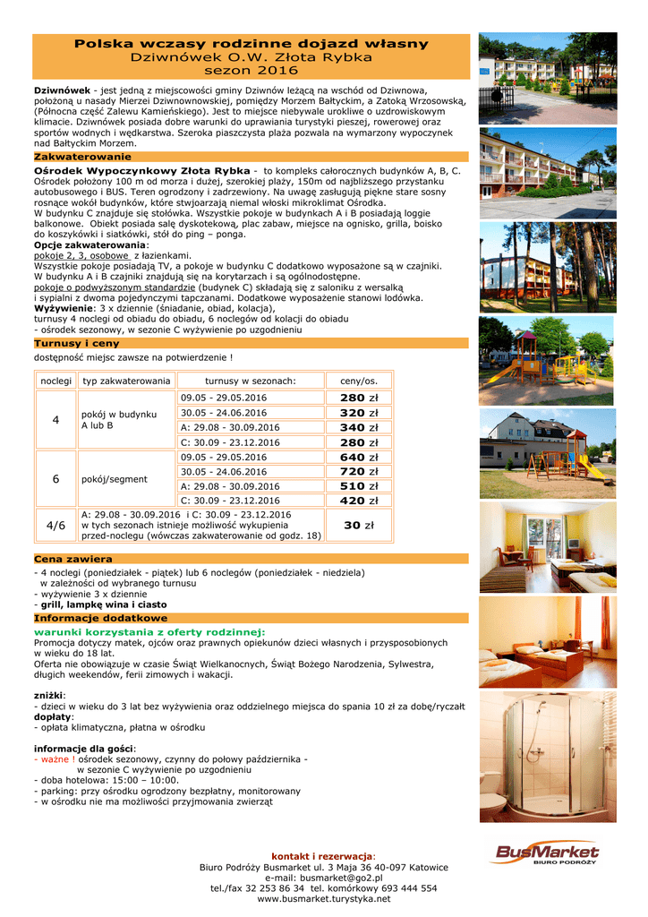 Polska wczasy rodzinne dojazd własny Dziwnówek O.W. Złota Rybka sezon 2016 Dziwnówek - jest jedną z miejscowości gminy Dziwnów leżącą na wschód od Dziwnowa, położoną u nasady Mierzei Dziwnownowskiej, pomiędzy Morzem Bałtyckim, a Zatoką Wrzosowską, (Północna część Zalewu Kamieńskiego). Jest to miejsce niebywale urokliwe o uzdrowiskowym klimacie. Dziwnówek posiada dobre warunki do uprawiania turystyki pieszej, rowerowej oraz sportów wodnych i wędkarstwa. Szeroka piaszczysta plaża pozwala na wymarzony wypoczynek nad Bałtyckim Morzem. Zakwaterowanie Ośrodek Wypoczynkowy Złota Rybka - to kompleks całorocznych budynków A, B, C. Ośrodek położony 100 m od morza i dużej, szerokiej plaży, 150m od najbliższego przystanku autobusowego i BUS. Teren ogrodzony i zadrzewiony. Na uwagę zasługują piękne stare sosny rosnące wokół budynków, które stwjoarzają niemal włoski mikroklimat Ośrodka. W budynku C znajduje się stołówka. Wszystkie pokoje w budynkach A i B posiadają loggie balkonowe. Obiekt posiada salę dyskotekową, plac zabaw, miejsce na ognisko, grilla, boisko do koszykówki i siatkówki, stół do ping – ponga. Opcje zakwaterowania: pokoje 2, 3, osobowe z łazienkami. Wszystkie pokoje posiadają TV, a pokoje w budynku C dodatkowo wyposażone są w czajniki. W budynku A i B czajniki znajdują się na korytarzach i są ogólnodostępne. pokoje o podwyższonym standardzie (budynek C) składają się z saloniku z wersalką i sypialni z dwoma pojedynczymi tapczanami. Dodatkowe wyposażenie stanowi lodówka. Wyżywienie: 3 x dziennie (śniadanie, obiad, kolacja), turnusy 4 noclegi od obiadu do obiadu, 6 noclegów od kolacji do obiadu - ośrodek sezonowy, w sezonie C wyżywienie po uzgodnieniu Turnusy i ceny dostępność miejsc zawsze na potwierdzenie ! noclegi 4 typ zakwaterowania pokój w budynku A lub B turnusy w sezonach: 09.05 - 29.05.2016 280 zł 30.05 - 24.06.2016 320 zł A: 29.08 - 30.09.2016 340 zł C: 30.09 - 23.12.2016 280 640 720 510 420 09.05 - 29.05.2016 6 pokój/segment 30.05 - 24.06.2016 A: 29.08 - 30.09.2016 C: 30.09 - 23.12.2016 4/6 ceny/os. A: 29.08 - 30.09.2016 i C: 30.09 - 23.12.2016 w tych sezonach istnieje możliwość wykupienia przed-noclegu (wówczas zakwaterowanie od godz. 18) zł zł zł zł zł 30 zł aa Cena zawiera - 4 noclegi (poniedziałek - piątek) lub 6 noclegów (poniedziałek - niedziela) w zależności od wybranego turnusu - wyżywienie 3 x dziennie - grill, lampkę wina i ciasto Informacje dodatkowe warunki korzystania z oferty rodzinnej: Promocja dotyczy matek, ojców oraz prawnych opiekunów dzieci własnych i przysposobionych w wieku do 18 lat. Oferta nie obowiązuje w czasie Świąt Wielkanocnych, Świąt Bożego Narodzenia, Sylwestra, długich weekendów, ferii zimowych i wakacji. zniżki: - dzieci w wieku do 3 lat bez wyżywienia oraz oddzielnego miejsca do spania 10 zł za dobę/ryczałt dopłaty: - opłata klimatyczna, płatna w ośrodku informacje dla gości: - ważne ! ośrodek sezonowy, czynny do połowy października w sezonie C wyżywienie po uzgodnieniu - doba hotelowa: 15:00 – 10:00. - parking: przy ośrodku ogrodzony bezpłatny, monitorowany - w ośrodku nie ma możliwości przyjmowania zwierząt kontakt i rezerwacja: Biuro Podróży Busmarket ul. 3 Maja 36 40-097 Katowice e-mail: [email protected] tel./fax 32 253 86 34 tel. komórkowy 693 444 554 www.busmarket.turystyka.net