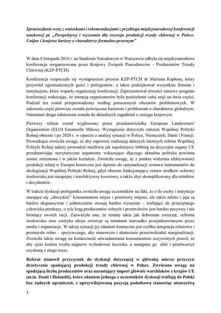 Sprawozdanie wraz z wnioskami i rekomendacjami z przebiegu międzynarodowej konferencji naukowej pt. „Perspektywy i wyzwania dla rozwoju produkcji trzody chlewnej w Polsce. Unijne i krajowe bariery o charakterze formalno-prawnym” W dniu 8 listopada 2016 r. na Stadionie Narodowym w Warszawie odbyła się międzynarodowa konferencja zorganizowana przez Krajowy Związek Pracodawców - Producentów Trzody Chlewnej (KZP-PTCH). Konferencja rozpoczęła się wystąpieniem prezesa KZP-PTCH dr Mariana Kapłona, który przywitał zgromadzonych gości i prelegentów, a także podziękował wszystkim firmom i instytucjom, które wsparły organizację konferencji. Zaprezentował również ramowy program konferencji wskazując, że intencją organizatorów było podzielenie całej sesji na dwie części. Podział ten został przeprowadzony według poruszonych obszarów problemowych. W założeniu część pierwsza została poświęcona barierom i problemom o charakterze globalnym. Natomiast druga odniesiona została do aktualnych zagadnień o zasięgu krajowym. Pierwszy referat został wygłoszony przez przedstawicielkę European Landowners' Organization (ELO) Emanuelle Mikosz. Wystąpienie dotyczyło założeń Wspólnej Polityki Rolnej obecnie i po 2020 r. w oparciu o analizę sytuacji w Polsce, Niemczech, Danii i Francji. Prowadząca zwróciła uwagę, że aby zapewnić realizację dalszych istotnych reform Wspólnej Polityki Rolnej należy prowadzić możliwie jak najsilniejszy lobbing na decyzyjne organy UE przedstawiając merytoryczne argumenty wskazujące dlaczego aktualna polityka powinna zostać zmieniona i w jakim kształcie. Zwróciła uwagę, że z punktu widzenia efektywności produkcji rolnej w Europie konieczne jest dążenie do optymalizacji zestawu instrumentów do ekologizacji Wspólnej Polityki Rolnej, gdyż obecnie funkcjonujący zestaw środków ochrony środowiska jest niespójny i nieefektywny kosztowo, a także zbyt skomplikowany dla rolników i decydentów. W trakcie dyskusji prelegentka zwróciła uwagę uczestników na fakt, że o ile osoby i instytucje starające się „obrzydzić” konsumentom mięso i przetwory mięsne, ale także mleko i jaja są bardzo ekspansywne i jednocześnie stosują bardzo wyraziste – trafiające do przeciętnego człowieka przekazy, o tyle krąg producentów rolnych i przetwórców jest bardzo pasywny i nie broniący swoich racji. Zauważyła ona, że tematy takie jak dobrostan zwierząt, ochrona środowiska oraz estetyka uboju zwierząt są tematami nierzadko przejaskrawianymi przez media i organizacje. W takiej sytuacji jej zdaniem konieczna jest szybka integracja rolnictwa i przemysłu rolno – spożywczego, aby stanowczo i skutecznie przeciwdziałać marginalizacji. Zwróciła także uwagę na konieczność uświadamiania konsumentom oczywistych prawd, że aby zjeść kotleta trzeba najpierw wyhodować tucznika, a następnie go ubić i przetworzyć uzyskaną z niego tusze. Referat stanowił przyczynek do dyskusji dotyczącej w główniej mierze przyczyn drastycznie spadającej produkcji trzody chlewnej w Polsce. Zwrócono uwagę na spadającą liczbę producentów oraz narastający import głównie warchlaków z krajów UE (m.in. Danii i Holandii), które zdaniem jednego z uczestników dyskusji trafiają do Polski bez żadnych ograniczeń, z uprzywilejowaną pozycją podatkową stanowiąc nieuczciwą 1 konkurencję wobec miejscowych farmerów prowadzących produkcję w cyklu zamkniętym. Padły konkretne liczby – zabierający głos w dyskusji stwierdził, że do Polski rocznie trafia 6 mln warchlaków co sprawia, że stada podstawowe polskich producentów nie są w stanie się trwale odbudować. Krytyce poddano również forsowaną przez UE koncepcje „zazieleniania”, która dla rolników stanowić będzie kosztowny sposób odłogowania gruntu. Zdaniem uczestników dyskusji w przypadku niektórych gospodarstw, „zazielenienie” będzie oznaczać wzrost kosztów funkcjonowania i spadek ich konkurencyjności. Kolejny referat zaprezentował Carlos Piñeiro z Hiszpanii dyrektor fundacji PigCHAMP PRO Europa. Wystąpienie zatytułowane: „Nowe trendy w organizacji produkcji, kontroli chorób i zarządzaniu fermami trzody chlewnej a konkurencyjność producentów z UE” poświęcone zostało analizie sektora trzody chlewnej w Hiszpanii na tle Europy i świata w kontekście, czynników które przesądziły o bezprecedensowym rozwoju tego segmentu hiszpańskiej gospodarki. Prelegent zwrócił szczególną uwagę na metodologię wykorzystania zagregowanych danych produkcyjnych i kosztowych jako narzędzia zwiększania efektywności produkcji. Zwrócił również uwagę, że ważnym elementem rozwoju potencjału hodowlanego jest dobór odpowiedniej strategii biznesowej, wskazując na cztery funkcjonujące w Hiszpanii rozwiązania modelowe. Po pierwsze wybór niszowych rynków, na które przygotowywana jest wysokojakościowa, zróżnicowana oferta produktowa dedykowana wyspecjalizowanym klientom (np. produkcja ras lokalnych - w oparciu, o które wytwarzane są specyficzne lokalne produkty). Po drugie wielkotowarowa produkcja w oparciu o umowy strategiczne zapewniające długoterminowy wzrost produkcji i dywersyfikacji ryzyka. Po trzecie idea spółdzielni produkcyjnych dających możliwość optymalizacji zasobów i wykorzystywania wspólnej infrastruktury w tym badawczo-rozwojowej w celu poprawy pozycji rynkowej całej grupy. Ostatnim najbardziej zaawansowanym organizacyjnie modelem jest połączenie produkcji z przetwórstwem i dystrybucją produktów końcowych w formie pełnej integracji pionowej w ramach, której producenci stają się udziałowcami firm przetwórczych i dystrybucyjnych, które stanowią zaplecze kapitałowe w przypadku spadających cen trzody. Zainicjowana przez moderatora konferencji dr Mariana Kapłona dyskusja odnosiła się w głównej mierze do czynników sukcesu hiszpańskich producentów trzody chlewnej. Zw