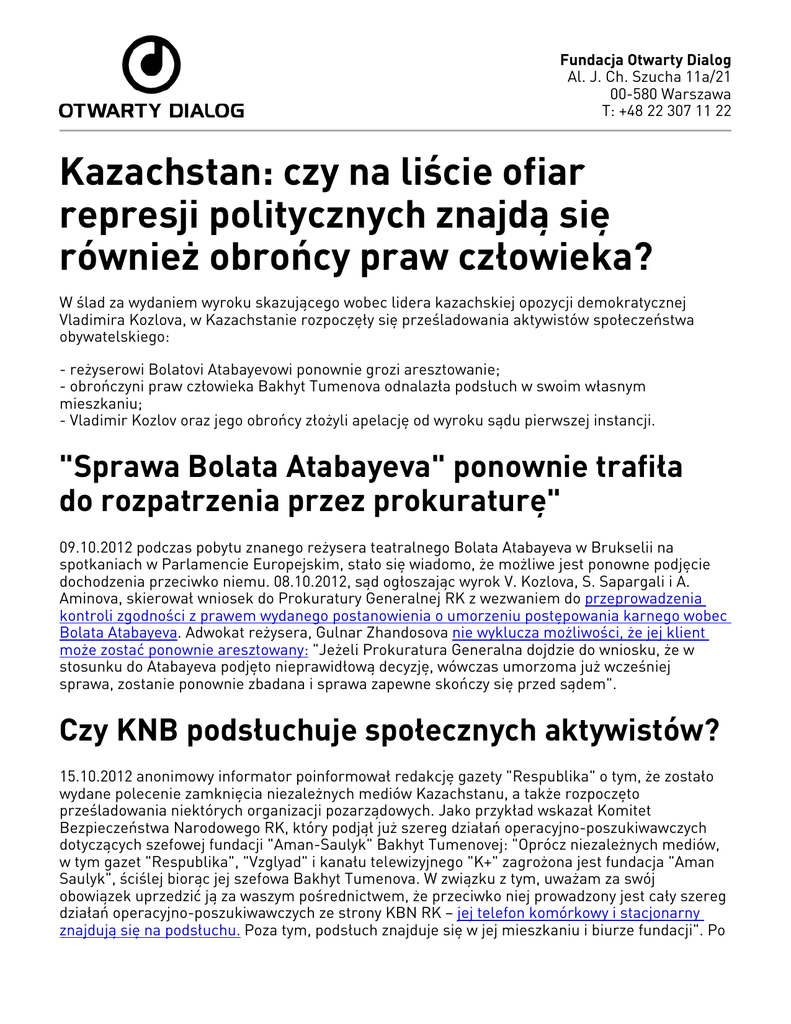 Fundacja Otwarty Dialog Al. J. Ch. Szucha 11a/21 00-580 Warszawa T: +48 22 307 11 22 Kazachstan: czy na liście ofiar represji politycznych znajdą się również obrońcy praw człowieka? W ślad za wydaniem wyroku skazującego wobec lidera kazachskiej opozycji demokratycznej Vladimira Kozlova, w Kazachstanie rozpoczęły się prześladowania aktywistów społeczeństwa obywatelskiego: - reżyserowi Bolatovi Atabayevowi ponownie grozi aresztowanie; - obrończyni praw człowieka Bakhyt Tumenova odnalazła podsłuch w swoim własnym mieszkaniu; - Vladimir Kozlov oraz jego obrońcy złożyli apelację od wyroku sądu pierwszej instancji. "Sprawa Bolata Atabayeva" ponownie trafiła do rozpatrzenia przez prokuraturę" 09.10.2012 podczas pobytu znanego reżysera teatralnego Bolata Atabayeva w Brukselii na spotkaniach w Parlamencie Europejskim, stało się wiadomo, że możliwe jest ponowne podjęcie dochodzenia przeciwko niemu. 08.10.2012, sąd ogłoszając wyrok V. Kozlova, S. Sapargali i A. Aminova, skierował wniosek do Prokuratury Generalnej RK z wezwaniem do przeprowadzenia kontroli zgodności z prawem wydanego postanowienia o umorzeniu postępowania karnego wobec Bolata Atabayeva. Adwokat reżysera, Gulnar Zhandosova nie wyklucza możliwości, że jej klient może zostać ponownie aresztowany: "Jeżeli Prokuratura Generalna dojdzie do wniosku, że w stosunku do Atabayeva podjęto nieprawidłową decyzję, wówczas umorzoma już wcześniej sprawa, zostanie ponownie zbadana i sprawa zapewne skończy się przed sądem". Czy KNB podsłuchuje społecznych aktywistów? 15.10.2012 anonimowy informator poinformował redakcję gazety "Respublika" o tym, że zostało wydane polecenie zamknięcia niezależnych mediów Kazachstanu, a także rozpoczęto prześladowania niektórych organizacji pozarządowych. Jako przykład wskazał Komitet Bezpieczeństwa Narodowego RK, który podjął już szereg działań operacyjno-poszukiwawczych dotyczących szefowej fundacji "Aman-Saulyk" Bakhyt Tumenovej: "Oprócz niezależnych mediów, w tym gazet "Respublika", "Vzglyad" i kanału telewizyjnego "K+" zagrożona jest fundacja "Aman Saulyk", ściślej biorąc jej szefowa Bakhyt Tumenova. W związku z tym, uważam za swój obowiązek uprzedzić ją za waszym pośrednictwem, że przeciwko niej prowadzony jest cały szereg działań operacyjno-poszukiwawczych ze strony KBN RK – jej telefon komórkowy i stacjonarny znajdują się na podsłuchu. Poza tym, podsłuch znajduje się w jej mieszkaniu i biurze fundacji". Po opublikowaniu informacji, Bakhyt Tumenova poddała szczegółowej kontroli swoje mieszkanie i odnalazła szereg urządzeń, które mogły być wykorzystywane do podsłuchu. Obrończyni praw człowieka zwróciła się do policji oraz lokalnego wydziału KBN RK, jednak jej zgłoszenie nie wywołało żadnej reakcji z ich strony. Bakhyt Tumenova przypomniała sobie również o kilku dziwnych wydarzeniach, mających miejsce w ciągu ostatnich miesięcy, a które mogły jej zdaniem, wskazywać na zwiększenie zainteresowania ze strony służb specjalnych: "Gdzieś w połowie lipca zdawało mi się, że jestem obserwowana. Nawet moja córka powiedziała do mnie: "Mamo, wydaje mi się, że chodzą za tobą wciąż ci sami ludzie". Pewnego razu wyszliśmy z domu razem z mężem, skręciliśmy na lewo, potem rozmyśliliśmy się i poszliśmy na prawo. Od razu rzuciło się nam w oczy zachowanie dwóch młodych ludzi, którzy szli za nami. Oni też gwałtownie zmienili kierunek, tak samo jak my", — opowiadała Bakhyt Tumenova. Takie działania władz można traktować jako utrudnianie prowadzenia działalności społecznej i niezgodną z prawem ingerencję w życie prywatne człowieka. Fakty wykorzystywania podsłuchu działaczy społecznych w Kazachstanie mają już swoje dalsze, dobrze znane następstwa: właśnie na "podsłuchach" budowano bazę dowodową w czasie procesu przeciwko liderom opozycji. Czy to znaczy, że należy oczekiwać skierowania oskarżeń pod adresem obrończyni praw człowieka Bakhyt Tumenovej? To pytanie na chwilę obecną pozostaje otwarte. Została złożona apelacja V. Kozlova Vladimir Kozlov oraz jego obrońcy złożyli apelację od wyroku sądu pierwszej instancji, zgodnie z którym lider niezarejestrowanej partii "Alga!" został skazany na 7,5 roku pozbawienia wolności i konfiskatę mienia. Obrońca skazanego Aleksey Plugov złożył apelację 19.10.2012 roku, a Vladimir Kozlov i Venera Sersenbina – 23.10.2012, czyli w ostatni dzień składania apelacji. Dokładna data rozpatrzenia wzniosków o apelację na razie nie jest jeszcze znana, jednak zgodnie z ustawodawstwem RK, sprawa powinna zostać rozpatrzona przez instancję odwoławczą najpóźniej w ciągu miesiąca od dnia złożenia apelacji. Chociaż wyrok został ogłoszony 08.10.2012, to obrońcy i opozycyjny polityk otrzymali wyrok dopiero 15.10.2012. Zgodnie z Kodeksem Postępowania Karnego Republiki Kazachstanu, wnioski apelacyjne i kasacyjne składa się w terminie 15 dni od dnia ogłoszenia wyroku, a skazani przebywający w areszcie tymczasowym mogą sładać takie wnioski w tym samym terminie, lecz liczonym od dnia doręczenia im kopii wyroku. "Faktycznie więc zabrano obrońcom tydzień i byli oni zmuszeni do napisania apelacji w bardzo krótkim terminie", - ponformowała Aliya Turusbekova, żona Vladimira Kozlova. facebook.com/OpenDialogFoundation | [email protected] | www.odfoundation.eu
