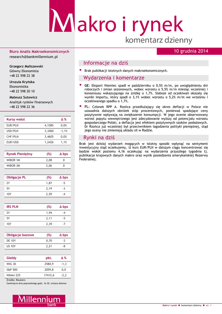 10 grudnia 2014 Biuro Analiz Makroekonomicznych [email protected] Informacje na dziś Grzegorz Maliszewski Główny Ekonomista +48 22 598 22 38 Brak publikacji istotnych danych makroekonomicznych. Wydarzenia i komentarze Urszula Kryńska Ekonomistka +48 22 598 20 10 Mateusz Sutowicz Analityk rynków finansowych +48 22 598 22 36 Kursy walut Δ% EUR/PLN 4,1585 0,0% USD/PLN 3,3460 -1,1% CHF/PLN 3,4605 0,0% EUR/USD 1,2426 1,1% Rynek Pieniężny (%) Δ bps WIBOR 1M 2,08 0 WIBOR 3M 2,06 0 Obligacje PL (%) Δ bps 2Y 1,87 -5 5Y 2,19 -3 10Y 2,59 -4 IRS PLN (%) Δ bps 2Y 1,94 -4 5Y 2,11 -5 10Y 2,39 -7 Obligacje bazowe (%) Δ bps DE 10Y 0,70 -3 US 10Y 2,21 -8 Giełdy pkt. Δ% WIG 30 2580,9 -1,3 S&P 500 2059,8 0,0 Nikkei 225 17412,6 -2,2 GE: Eksport Niemiec spadł w październiku o 0,5% m/m, po uwzględnieniu dni roboczych i zmian sezonowych, wobec wzrostu o 5,5% m/m miesiąc wcześniej i konsensusu wskazującego na zniżkę o 1,7%. Słabsze od oczekiwań okazały się wyniki importu, który spadł o 3,1% wobec wzrostu o 5,2% m/m we wrześniu i oczekiwanego spadku o 1,7%. PL: Członek RPP A. Rzońca przedłużający się okres deflacji w Polsce nie uzasadnia dalszych obniżek stóp procentowych, ponieważ spadające ceny pozytywnie wpływają na zwiększenie konsumpcji. W jego ocenie obserwowany wzrost popytu wewnętrznego jest zdecydowanie wyższy od potencjału wzrostu gospodarczego Polski, a deflacja jest efektem pozytywnych szoków podażowych. Dr Rzońca już wcześniej był przeciwnikiem łagodzenia polityki pieniężnej, stąd jego oceny nie zmieniają układu sił w Radzie. Rynki na dziś Brak jest dzisiaj wydarzeń mogących w istotny sposób wpłynąć na sentyment inwestycyjny stąd oczekujemy, iż kurs EUR/PLN w dalszym ciągu koncentrować się będzie wokół poziomu 4,16 oczekując na wydarzenia przyszłego tygodnia tj. publikacje krajowych danych makro oraz wynik posiedzenia amerykańskiej Rezerwy Federalnej. Źródło: Reuters Zamknięcia dnia poprzedniego godz. 16.30, zmiana dzienna `Makro i rynek komentarz dzienny str. 1 Rynek krajowy Kursy walutowe EUR/PLN i EUR/USD 4,25 1,35 1,33 4,20 1,31 1,29 1,27 4,15 1,25 1,23 4,10 1,21 EURPLN EURUSD /prawa skala/ Tak jak oczekiwaliśmy ubogie kalendarium wczorajszego dnia skutkowało stabilizacją notowań pary EUR/PLN wokół poziomu 4,16. Stosunkowo niewiele działo się także w notowaniach kursu USD/PLN, czy CHF/PLN. Spokojny przebieg miały ponadto notowania walut regionu Europy Środkowo-Wschodniej, gdzie zmiany węgierskiego forinta, rumuńskiego leja, czy czeskiej korony były kosmetyczne. Zdecydowanie ciekawiej prezentowały się notowania polskiego długu, który zyskiwał na wartości wzdłuż całej krzywej reagując głównie na sytuację na rynkach bazowych. Wczoraj o 4 bps do 2,59% zmalała dochodowość papierów z długiego końca krzywej. Zniżka rentowności polskich 2-latek wyniosła natomiast 5 bps do poziomu 1,87%. Drożejący krótki koniec krzywej to także wpływ spadku krzywej IRS mierzącej oczekiwania, co do perspektyw polityki pieniężnej. Źródło: Reuters Rynki zagraniczne Wczorajsza sesja była niemal kopią tej z ubiegłego czwartku, gdy kurs EUR/USD z poziomu 1,2310 wzrósł do 14-dniowej średniej ruchomej zlokalizowanej na poziomie 1,2435, która skutecznie chroni eurodolara przed nadmierną zwyżką. Podobnie było w trakcie wtorkowych notowań. W rezultacie kurs EUR/USD chwilowo dotarł tym samym do linii trendu poprowadzonej po szczytach z lipca, sierpnia i października. Euro zyskiwało na wartości względem dolara pomimo ponownie napiętej sytuacji w Grecji. Minister finansów Niemiec przyznał, że Ateny poprosiły o wydłużenie linii pomocowej. Dodatkowo perspektywa wcześniejszych wyborów prezydenckich sprawiła, że grecka giełda straciła 12.8% tj. najwięcej w ciągu jednego dnia od 1987 roku. Spokojny przebieg miały natomiast wczorajsze notowania pary EUR/CHF, która oscylowała około 20 pipsów powyżej bronionego przez SNB poziomu 1,20. Nerwowości w wycenie franka nie wywołała ankieta przeprowadzona przez agencję Bloomberg, z której wynika, iż większość ankietowanych ekonomistów spodziewa się wprowadzenia przez SNB ujemnych stóp procentowych, gdy kurs EUR/CHF będzie zagrożony między innymi w przypadku wprowadzenia przez ECB programu QE. Ponadto jeden z członków Rady SNB, F.Zurbruegg, jest zdania, że dzięki stałej nadpłynności w szwajcarskim systemie finansowym ujemne stopy miałyby większy wpływ na gospodarkę Szwajcarii niż ma to miejsce w strefie euro. Na rynku obligacji bazowych doszło wczoraj do wyraźnego wzrostu wartości amerykańskich 10-latek, co można częściowo wiązać z wtorkową przeceną akcji na giełdach USA. Wczoraj ponownie do najniższego w historii poziomu tj. 0,70% zniżkowały natomiast rentowności niemieckich 10-latek. Rentowności polskich obligacji [%] 3,5 3,1 2,7 2,3 1,9 1,5 Spread PL 10Y vs. DE 10Y 2Y 5Y 10Y Źródło: Reuters Rentowności obligacji USA i Niemiec [%] 2,60 2,10 1,60 1,10 0,60 10Y DE 10Y US Źródło: Reuters Ceny surowców [USD] 1300 100 95 1250 90 85 1200 80 75 1150 70 65 1100 60 Złoto /lewa skala/ Ropa naftowa Brent Źródło: Reuters `Makro i rynek komentarz dzienny str. 2 Kalendarium Kraj Okres Poprzednie dane Aktualne dane Konsensus (prognoza Millenium) Data Godz. Wskaźnik/Wydarzenie 12/05 08:00 Zamówienia fabryczne WDA r/r Niemcy Październik -1.0% 2.4% 0.0% 12/05 11:00 EU 3Q 0.8% 0.8% 0.8% 12/05 12/05 14:30 14:30 PKB SA r/r Zmiana zatrudnienia poza sektorem rolniczym Stopa bezrobocia USA USA Listopad Listopad 214K 5.8% 321K 5.8% 230K 5.8% 12/05 14:30 Bilans handlowy USA Październik -$43.0B -$43.4B -$41.2B 12/05 16:00 Zamówienia fabryczne USA Październik -0.6% -0.7% 0.0% 12/08 08:00 Produkcja przemysłowa WDA r/r Niemcy Październik -0.1% 0.8% 0.9% 12/08 10:30 Indeks nastrojów konsumenckich Sentix EU -11.9 -2.5 -9.0 12/09 08:00 Bilans handlowy Niemcy Październik 21.9B 20.6B 18.9B 12/10 13:00 Liczba