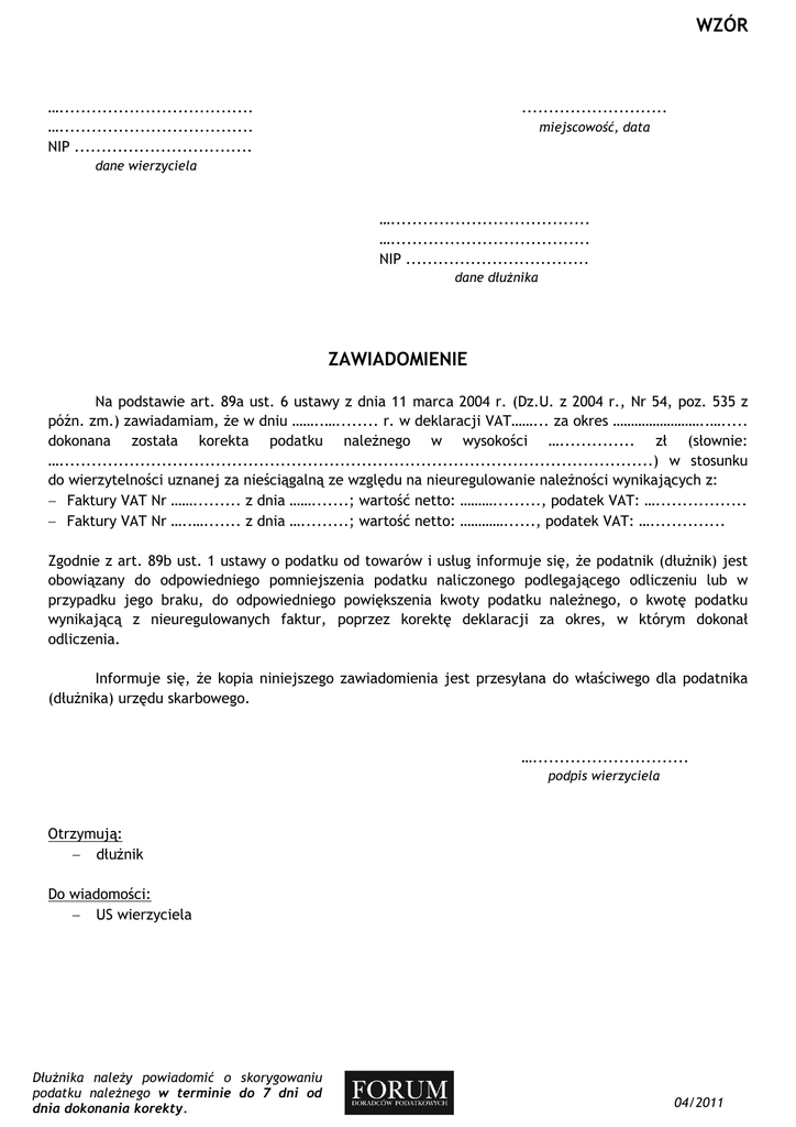 WZÓR ….................................... ….................................... NIP ................................. ........................... miejscowość, data dane wierzyciela …..................................... …..................................... NIP .................................. dane dłuŜnika ZAWIADOMIENIE Na podstawie art. 89a ust. 6 ustawy z dnia 11 marca 2004 r. (Dz.U. z 2004 r., Nr 54, poz. 535 z późn. zm.) zawiadamiam, Ŝe w dniu ……..…........ r. w deklaracji VAT……... za okres ……………………..…..... dokonana została korekta podatku naleŜnego w wysokości ….............. zł (słownie: …..............................................................................................................) w stosunku do wierzytelności uznanej za nieściągalną ze względu na nieuregulowanie naleŜności wynikających z: − Faktury VAT Nr ……......... z dnia …….......; wartość netto: ………........., podatek VAT: …................. − Faktury VAT Nr …..…....... z dnia ….........; wartość netto: …………......, podatek VAT: ….............. Zgodnie z art. 89b ust. 1 ustawy o podatku od towarów i usług informuje się, Ŝe podatnik (dłuŜnik) jest obowiązany do odpowiedniego pomniejszenia podatku naliczonego podlegającego odliczeniu lub w przypadku jego braku, do odpowiedniego powiększenia kwoty podatku naleŜnego, o kwotę podatku wynikającą z nieuregulowanych faktur, poprzez korektę deklaracji za okres, w którym dokonał odliczenia. Informuje się, Ŝe kopia niniejszego zawiadomienia jest przesyłana do właściwego dla podatnika (dłuŜnika) urzędu skarbowego. …............................. podpis wierzyciela Otrzymują: − dłuŜnik Do wiadomości: − US wierzyciela DłuŜnika naleŜy powiadomić o skorygowaniu podatku naleŜnego w terminie do 7 dni od dnia dokonania korekty. 04/2011