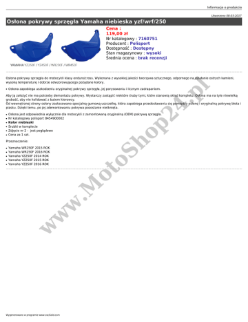 Informacje o produkcie Utworzono 08-03-2017 Osłona pokrywy sprzęgła Yamaha niebieska yzf/wrf/250 Cena : 119,00 zł Nr katalogowy : 7160751 Producent : Polisport Dostępność : Dostępny Stan magazynowy : wysoki Średnia ocena : brak recenzji Osłona zapobiega uszkodzeniu oryginalnej pokrywy sprzęgła, jej porysowaniu i licznym zadrapaniom. 4. p ● l Osłona pokrywy sprzęgła do motocykli klasy enduro/cross. Wykonana z wysokiej jakości tworzywa sztucznego, odpornego na działanie ostrych kamieni, wysoką temperaturę i dobrze odwzorowującego pożądane kolory. Aby ją założyć nie ma potrzeby demontażu pokrywy. Wystarczy zastąpić niektóre śruby tymi, które stanowią skład kompletu. Osłona ma na tyle niewielką grubość, aby nie kolidować z butem kierowcy. Od wewnętrznej strony osłony zastosowano specjalną gumową uszczelkę, która zapobiega przedostawaniu się pomiędzy osłonę i oryginalną pokrywę błota i piasku. Dzięki temu, po jej zdemontowaniu pokrywa pozostanie nietknięta. ● ● ● ● ● Osłona jest odpowiednia wyłącznie dla motocykli z zamontowaną oryginalną (OEM) pokrywą sprzęgła. Nr katalogowy polisport 8454900002 Kolor niebieski Śrubki w komplecie Zdjęcie nr 2 - jest poglądowe Cena za 1 szt. ho p2 ● Przeznaczenie: ● ● ● w w w .M ● Yamaha WR250F 2015 ROK Yamaha WR250F 2016 ROK Yamaha YZ250F 2014 ROK Yamaha YZ250F 2015 ROK Yamaha YZ250F 2016 ROK ot oS ● Wygenerowano w programie www.oscGold.com