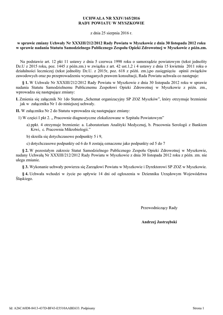 UCHWAŁA NR XXIV/165/2016 RADY POWIATU W MYSZKOWIE z dnia 25 sierpnia 2016 r. w sprawie zmiany Uchwały Nr XXXIII/212/2012 Rady Powiatu w Myszkowie z dnia 30 listopada 2012 roku w sprawie nadania Statutu Samodzielnego Publicznego Zespołu Opieki Zdrowotnej w Myszkowie z późn.zm. Na podstawie art. 12 pkt 11 ustawy z dnia 5 czerwca 1998 roku o samorządzie powiatowym (tekst jednolity Dz.U z 2015 roku, poz. 1445 z późn.zm.) w związku z art. 42 ust.1,2 i 4 ustawy z dnia 15 kwietnia 2011 roku o działalności leczniczej (tekst jednolity Dz.U. z 2015r, poz. 618 z późń. zm.),po zasięgnięciu opinii związków zawodowych oraz po przeprowadzeniu wymaganych prawem konsultacji, Rada Powiatu uchwala co następuje: § 1. W Uchwale Nr XXXIII/212/2012 Rady Powiatu w Myszkowie z dnia 30 listopada 2012 roku w sprawie nadania Statutu Samodzielnemu Publicznemu Zespołowi Opieki Zdrowotnej w Myszkowie z późn. zm., wprowadza się następujące zmiany: I. Zmienia się załącznik Nr 1do Statutu „Schemat organizacyjny SP ZOZ Myszków”, który otrzymuje brzmienie jak w załączniku Nr 1 do niniejszej uchwały. II. W załączniku Nr 2 do Statutu wprowadza się następujące zmiany: 1) W części I pkt 2. „ Pracownie diagnostyczne zlokalizowane w Szpitalu Powiatowym” a) ppkt. 4 otrzymuje brzmienie: a. Laboratorium Analityki Medycznej, b. Pracownia Serologii z Bankiem Krwi, c. Pracownia Mikrobiologii.” b) skreśla się dotychczasowe podpunkty 5 i 9, c) dotychczasowe podpunkty od 6 do 8 zostają oznaczone jako podpunkty od 5 do 7 § 2. W pozostałym zakresie Statut Samodzielnego Publicznego Zespołu Opieki Zdrowotnej w Myszkowie, nadany Uchwałą Nr XXXIII/212/2012 Rady Powiatu w Myszkowie z dnia 30 listopada 2012 roku z późn. zm. nie ulega zmianie. § 3. Wykonanie uchwały powierza się Zarządowi Powiatu w Myszkowie i Dyrektorowi SP ZOZ w Myszkowie. § 4. Uchwała wchodzi w życie po upływie 14 dni od ogłoszenia w Dzienniku Urzędowym Województwa Śląskiego. Przewodniczący Rady Andrzej Jastrzębski Id: A26CA0D8-8413-437D-BF43-E5510AABE633. Podpisany Strona 1 SCHEMAT ORGANIZACYJNY SP ZOZ MYSZKÓW Dyrektor D Asystent Dyrektora ds. Finansowych i Zarządzania DA Rada Społeczna RS Naczelny Lekarz Szpitala DL Przedsiębiorstwo Podmiotu Leczniczego Lecznictwo Stacjonarne Szpital Powiatowy LS Główny Księgowy DK Przedsiębiorstwo Podmiotu Leczniczego: Lecznictwo Ambulatoryjne - Przychodnie i DPD LP Przełożona Pielęgniarek PP Izba Przyjęć SIP Pielęgniarka Epidemiologiczna PE Dział Księgowości KK Oddział Chorób Wewnętrznych SOW Dział Eksploatacyjno – Techniczny DT Przychodnia Rejonowo Specjalistyczna Nr 1 P1 Oddział Pediatryczny SOP Przychodnia Rejonowo Specjalistyczna Nr 2 P2 Zaopatrzenie TZ Zamówienia Publiczne DZ Załącznik Nr 1 Oddział Chirurgii Ogólnej SOO Inspektor ds. BHP DB Inspektor ds. PPOŻ i Obrony Cywilnej DC Dział Organizacji Nadzoru i Rozliczeń DO Statystyka Medyczna OM Oddział Neonatologiczny SON Oddział Ginekologiczno – Położniczy SOG Dział Kadr DP Przychodnia Rejonowo Specjalistyczna Nr 3 P3 Radca Prawny DR Przychodnia Rejonowo Specjalistyczna w Koziegłowach P4 Sekretariat DS Oddział Chirurgii Urazowo – Ortopedycznej SOU Poradnie przyszpitalne P5 Kontrola Zarządcza DKZ Oddział Rehabilitacji SRH Dział Pomocy Doraźnej DPD Informatycy DI Blok Operacyjny SOB Kuchnia DW Dział Anestezjologii SOA Apteka Zakładowa SAZ Kapelan DKA Sterylizatornia SPS Pracownie Diagnostyczne SPD - USG - EKG - Endoskopii - Holtera - Przepływów naczyniowych - Tomografii komputerowej Pełnomocnik d/s Zintegrowanego Systemu Zarządzania DZSZ Zakład Diagnostyki Laboratoryjnej z pracowniami: Laboratorium Analityki Medycznej, Pracownia Serologii z Id: A26CA0D8-8413-437D-BF43-E5510AABE633. Bankiem Krwi, PracowniaPodpisany Mikrobiologii. Strona 2