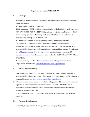 Regulamin promocji „WEEKEND” I. Definicje 1. Wyrażeniom pisanym w treści Regulaminu wielką literą należy nadawać znaczenie wskazane poniżej: 1.1. Regulamin – niniejszy regulamin. 1.2. Organizator – CEBP 24.12 sp. z o.o. z siedzibą w Krakowie przy ul. Kwiatowej 3, NIP: 6793096735, REGON: 122994233, wpisana do rejestru przedsiębiorców KRS prowadzonego przez Sąd Rejonowy dla Krakowa Śródmieścia w Krakowie, XI Wydział Gospodarczy pod nr 0000487975. 1.3. Promocja – opisana w niniejszym Regulaminie promocja pod nazwą „WEEKEND” organizowana przez Organizatora, umożliwiająca każdemu Zamawiającemu, składającemu w dniach 20 stycznia 2017 r. od godziny 14:30 – 22 stycznia 2017 r. do godziny 23:59 zamówienie w księgarni internetowej Organizatora www.blizejprzedszkola.pl/wydawnictwo, otrzymanie rabatu w wysokości 15% poprzez wpisanie w formularzu zamówienia w okienko KUPON RABATOWY hasła WEEKEND. 1.4. Zamawiający – osoba dokonująca zamówienia w księgarni internetowej Organizatora pod adresem www.blizejprzedszkola.pl/wydawnictwo. II. Zasady ogólne Promocji 1. Uczestnikiem Promocji może być każdy Zamawiający, który dokona w dniach 20 stycznia 2017 r. od godziny 14:30 – 22 stycznia 2017 r. do godziny 23:59 zakupów w księgarni internetowej www.blizejprzedszkola/wydawnictwo. 2. Warunkiem otrzymania rabatu w wysokości 15% podczas składania zamówienia jest wpisanie w formularzu zamówienia w okienko KUPON RABATOWY hasła WEEKEND (ważna wielkość liter). Rabat zostanie naliczony automatycznie po kliknięciu w przycisk ZAPISZ. 3. Promocja obowiązuje do 22 stycznia 2017 r. lub do wcześniejszego wyczerpania zapasów. III. Postanowienia końcowe 1. Uczestnik, biorąc udział w Promocji, akceptuje niniejszy Regulamin. 2. Wszelkie reklamacje należy zgłaszać do Organizatora na adres e-mail [email protected]. Organizator ustosunkuje się do reklamacji bez zbędnej zwłoki, jednak nie później niż w ciągu 14 dni. 3. Organizator zastrzega sobie prawo do zmian w Regulaminie. W przypadku wprowadzenia zmian, Organizator prześle zaktualizowany regulamin Promocji na adres e-mail podany przez Zamawiającego podczas składania Zamówienia. 4. Regulamin dostępny jest na stronie www.blizejprzedszkola/rabaty. W sprawach nieujętych w niniejszym Regulaminie, obowiązuje regulamin księgarni internetowej dostępny na stronie http://blizejprzedszkola.pl/wydawnictwo/?regulamin,4.