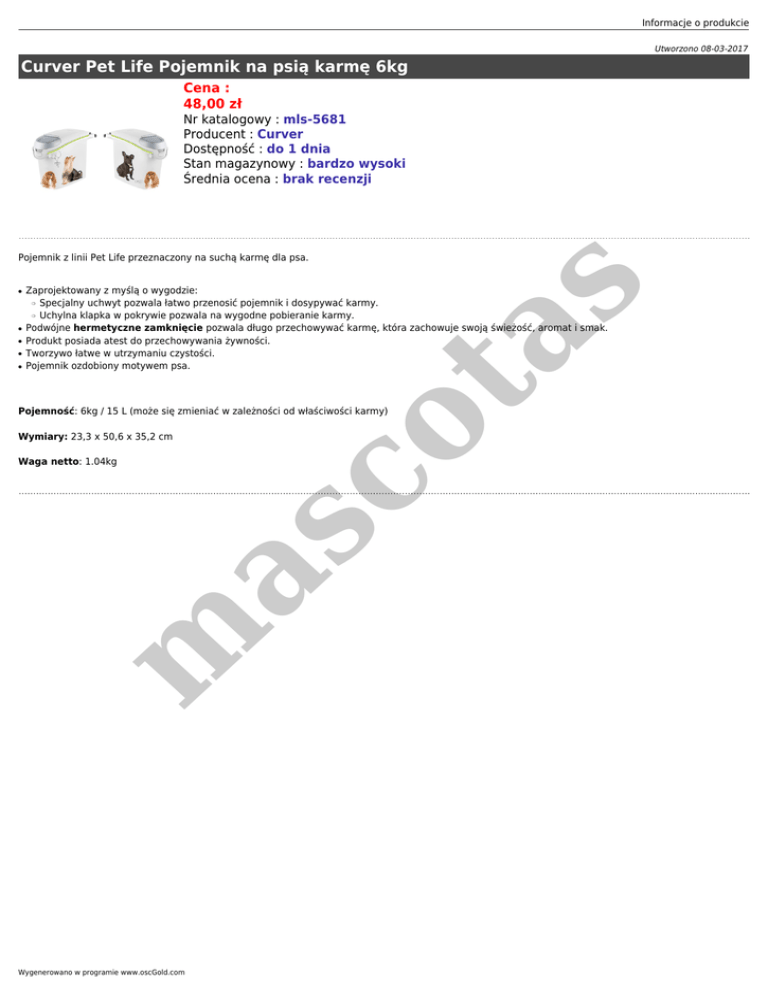 Informacje o produkcie Utworzono 08-03-2017 Curver Pet Life Pojemnik na psią karmę 6kg Cena : 48,00 zł Nr katalogowy : mls-5681 Producent : Curver Dostępność : do 1 dnia Stan magazynowy : bardzo wysoki Średnia ocena : brak recenzji ● s Pojemnik z linii Pet Life przeznaczony na suchą karmę dla psa. Zaprojektowany z myślą o wygodzie: Specjalny uchwyt pozwala łatwo przenosić pojemnik i dosypywać karmy. Uchylna klapka w pokrywie pozwala na wygodne pobieranie karmy. Podwójne hermetyczne zamknięcie pozwala długo przechowywać karmę, która zachowuje swoją świeżość, aromat i smak. Produkt posiada atest do przechowywania żywności. Tworzywo łatwe w utrzymaniu czystości. Pojemnik ozdobiony motywem psa. ❍ ● ● ● co ta ❍ ● Pojemność: 6kg / 15 L (może się zmieniać w zależności od właściwości karmy) Wymiary: 23,3 x 50,6 x 35,2 cm m as Waga netto: 1.04kg Wygenerowano w programie www.oscGold.com
