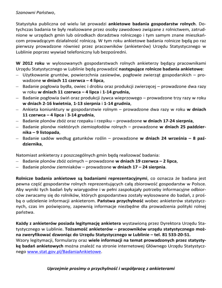 Szanowni Państwo, Statystyka publiczna od wielu lat prowadzi ankietowe badania gospodarstw rolnych. Dotychczas badania te były realizowane przez osoby zawodowo związane z rolnictwem, zatrudnione w urzędach gmin lub ośrodkach doradztwa rolniczego i tym samym znane mieszkaocom prowadzącym działalnośd rolniczą. W tym roku ankietowe badania rolnicze będą po raz pierwszy prowadzone również przez pracowników (ankieterów) Urzędu Statystycznego w Lublinie poprzez wywiad telefoniczny lub bezpośredni. W 2012 roku w wylosowanych gospodarstwach rolnych ankieterzy będący pracownikami Urzędu Statystycznego w Lublinie będą prowadzid następujące rolnicze badania ankietowe: Użytkowanie gruntów, powierzchnia zasiewów, pogłowie zwierząt gospodarskich – prowadzone w dniach 11 czerwca – 4 lipca, Badanie pogłowia bydła, owiec i drobiu oraz produkcji zwierzęcej – prowadzone dwa razy w roku w dniach 11 czerwca – 4 lipca i 1-14 grudnia, Badanie pogłowia świo oraz produkcji żywca wieprzowego – prowadzone trzy razy w roku w dniach 2-16 kwietnia, 1-13 sierpnia i 1-14 grudnia, Ankieta koniunktury w gospodarstwie rolnym – prowadzone dwa razy w roku w dniach 11 czerwca – 4 lipca i 3-14 grudnia, Badanie plonów zbóż oraz rzepaku i rzepiku – prowadzone w dniach 17-24 sierpnia, Badanie plonów niektórych ziemiopłodów rolnych – prowadzone w dniach 25 października – 9 listopada, Badanie sadów według gatunków roślin – prowadzone w dniach 24 września – 8 października, Natomiast ankieterzy z poszczególnych gmin będą realizowad badania: Badanie plonów zbóż ozimych – prowadzone w dniach 19 czerwca – 2 lipca, Badanie plonów ziemniaków – prowadzone w dniach 17 – 24 sierpnia. Rolnicze badania ankietowe są badaniami reprezentacyjnymi, co oznacza że badana jest pewna częśd gospodarstw rolnych reprezentujących całą zbiorowośd gospodarstw w Polsce. Aby wyniki tych badao były wiarygodne i w pełni zaspokajały potrzeby informacyjne odbiorców zwracamy się do rolników, których gospodarstwa zostały wylosowane do badao, z prośbą o udzielenie informacji ankieterom. Paostwa przychylnośd wobec ankieterów statystycznych, czas im poświęcony, zapewnią informacje niezbędne dla prowadzenia polityki rolnej paostwa. Każdy z ankieterów posiada legitymację ankietera wystawioną przez Dyrektora Urzędu Statystycznego w Lublinie. Tożsamośd ankieterów – pracowników urzędu statystycznego można zweryfikowad dzwoniąc do Urzędu Statystycznego w Lublinie – tel. 81 533-20-51. Wzory legitymacji, formularzy oraz wiele informacji na temat prowadzonych przez statystykę badao ankietowych można znaleźd na stronie internetowej Głównego Urzędu Statystycznego www.stat.gov.pl/BadaniaAnkietowe. Uprzejmie prosimy o przychylność i współpracę z ankieterami