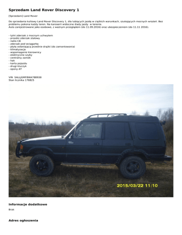 Sprzedam Land Rover Discovery 1 [Sprzedam] Land Rover Do sprzedania kultowy Land Rover Discovery 1, dla lubiących jazdę w ciężkich warunkach, szukających mocnych wrażeń. Bez problemu pokona każdy teren. Na karoserii widoczne ślady jazdy w terenie. Auto zarejestrowane jako osobowe, z ważnym przeglądem (do 11.09.2016) oraz ubezpieczeniem (do 11.11 2016). - tylni zderzak z mocnym uchwytem przedni zderzak stalowy radio CB zderzak pod wciągarkę płytę osłaniającą przednie drążki (do zamontowania) klimatyzacja wspomaganie kierownicy elektryczne szyby centralny zamek hak karta pojazdu drugi kluczyk opony AT VIN SALLJGMF8WA788938 Stan licznika 176825 Informacje dodatkowe Brak Adres ogłoszenia http://ogloszenia4x4.pl/sprzedam-land-rover-discovery-1,o144 Kontakt Mail: [email protected] Telefon: 692712013 Lokalizacja Wiśniowa, Łebcz Pomorskie (Polska) Ogłoszenie dodano: 2016-02-13 11:22:03 Ogłoszenie wygasa: 2016-05-13 11:22:03 Powered by TCPDF (www.tcpdf.org)