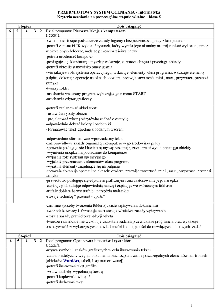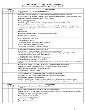 PRZEDMIOTOWY SYSTEM OCENIANIA - Informatyka Kryteria oceniania na poszczególne stopnie szkolne – klasa 5 6 Stopień Opis osiągnięć 5 4 3 2 Dział programu: Pierwsze lekcje z komputerem UCZEŃ: -świadomie stosuje podstawowe zasady higieny i bezpieczeństwa pracy z komputerem -potrafi zapisać PLIK wykonać rysunek, który wyraża jego aktualny nastrój zapisać wykonaną pracę w określonym folderze, nadając plikowi właściwą nazwę -potrafi uruchomić komputer -posługuje się klawiaturą i myszką: wskazuje, zaznacza chwyta i przeciąga obiekty -potrafi określić stanowisko pracy ucznia -wie jaka jest rola systemu operacyjnego, wskazuje elementy okna programu, wskazuje elementy pulpitu, dokonuje operacje na oknach: otwiera, przewija zawartość, mini., max., przywraca, przenosi zamyka -tworzy folder -uruchamia wskazany program wybierając go z menu START -uruchamia edytor graficzny -potrafi zaplanować układ tekstu - ustawić atrybuty obrazu - projektować własną wizytówkę zadbać o estetykę -odpowiednio dobrać kolory i ozdobniki - formatować tekst zgodnie z podanym wzorem -odpowiednio sformatować wprowadzony tekst -zna prawidłowe zasady organizacji komputerowego środowiska pracy -sprawnie posługuje się klawiaturą myszą: wskazuje, zaznacza chwyta i przeciąga obiekty -wymienia urządzenia podłączone do komputerze -wyjaśnia rolę systemu operacyjnego -wyjaśnić przeznaczenie elementów okna programu -wyjaśnia elementy znajdujące się na pulpicie -sprawnie dokonuje operacji na oknach: otwiera, przewija zawartość, mini., max., przywraca, przenosi zamyka -prawidłowo posługuje się edytorem graficznym i zna zastosowanie jego narzędzi -zapisuje plik nadając odpowiednią nazwę i zapisując we wskazanym folderze -trafnie dobiera barwy trafnie i narzędzia malarskie -stosuje technikę ” przenieś - upuść” -zna inne sposoby tworzenia folderu( czasie zapisywania dokumentu) -swobodnie tworzy i formatuje tekst stosuje właściwe zasady wpisywania -stosuje zasady prawidłowej edycji tekstu -twórczo i samodzielnie wykonuje wszystkie zadania przewidziane programem oraz wykazuje operatywność w wykorzystywaniu wiadomości i umiejętności do rozwiązywania nowych zadań 6 Stopień Opis osiągnięć 5 4 3 2 Dział programu: Opracowanie tekstów i rysunków UCZEŃ: -używa symboli i znaków graficznych w celu ilustrowania tekstu -zadba o estetyczny wygląd dokumentu oraz rozplanowanie poszczególnych elementów na stronach (obiektów WordArt, tabeli, listy numerowanej) -potrafi ilustrować tekst grafiką -wstawia tabelę wypełnia ją treścią -potrafi kopiować i wklejać -potrafi drukować tekst 1 -potrafi ilustrować tekst grafiką -rozmieścić ilustracje na stronie -przygotować dokument do wydruku -stosuje zasady prawidłowej edycji -ustalić wielkości obrazków zapisać wybrane zdjęcie w wyznaczonym miejscu -prawidłowo ustawić wielkości marginesów zgodnie z przyjętym planem dokumentu 6 -potrafi zastosować autokształty -dba o estetykę dokumentu -wstawia tabelę do tekstu, wypełnia ją treścią , formatuje i rozmieszcza treść w tabeli, wstawia obrazki -zadbać o estetyczny wygląd dokumentu oraz rozplanowanie poszczególnych elementów na stronach (obiektów WordArt, tabeli, listy numerowanej) -twórczo i samodzielnie wykonuje wszystkie zadania przewidziane programem oraz wykazuje operatywność w wykorzystywaniu wiadomości i umiejętności do rozwiązywania nowych zadań Stopień Opis osiągnięć 5 4 3 2 Dział programu: Tworzenie rysunków i motywów UCZEŃ: -potrafi uruchomić Logomocję -zna procedury pierwotne -pisać proste bezparametrowe procedury -zmienić kolor tła strony -potrafi narysować okrąg i jego średnicę - narysować okrąg z zamalowanym wnętrzem -potrafi tworzyć procedury pierwotne, rysuje wiele kwadratów oraz proste figury złożone z kwadratów -zmodyfikować procedurę 6 - zmodyfikować procedurę(zmiana wielkości boku i koloru pisaka, losowe wybieranie koloru pisaka) -pisze bezparametrową procedurę rysowania współśrodkowych kółek -pisze procedury z parametrem -rozwiązuje zadania konkursowe. Stopień Opis osiągnięć Dział programu: Dźwięki i obrazy 5 4 3 2 UCZEŃ: - potrafi narysować postać, korzystając z Edytora postaci Logomocji -powielić narysowaną postać -zapisać (na podstawie zapisu nutowego) melodię, korzystając z modułu do komponowania melodii wybrać instrument z listy -zmienić tempo grania melodii -potrafi zmodyfikować projekt w Logomocji wstawić żółwia, którego postać jest fotografią uruchamiać program z płyty CD posługiwać się głównym menu programu multimedialnego -utworzyć kilkustronicowy album w Lokomocji -wstawiać na stronę różne obiekty (żółwie, przyciski, pola tekstowe, obiekty multimedialne), przygotować prezentację na zadany temat, tworzyć różnorodne slajdy prezentacji -potrafi zmodyfikować narysowaną postać uruchomić animacji, dokonać korekty czasu wyświetlania poszczególnych klatek - zmienić wygląd przycisku służącego do odgrywania melodii skomponować własną melodię utworzyć żółwia w Edytorze postaci Logomocji -korzystać z możliwości multimedialnych programu -potrafi zadbać o estetykę – odpowiednio rozmieścić obiekty na stronie, przypisywać elementom slajdu efekty specjalne uatrakcyjniające prezentację, -przypisać zdarzenie gdyWciśnięty dla przycisku -rozwiązuje zadania samodzielnie wprowadzając własne pomysły -przygotowuje zadania konkursowe 2 6 Stopień Opis osiągnięć 5 4 3 2 Dział programu: Lekcje z siecią UCZEŃ: - potrafi wyjaśnić istotę działania sieci telefonii komórkowej oraz sieci komputerowej, , Otwiera stronę internetową o podanym adresie - reguły dobrego zachowania w sieci -wskazać podobieństwa, jakie zachodzą między tymi sieciami; -wyjaśnić rolę adresu komputera i numeru telefonu w sieci -odnaleźć w Internecie informacje na podany temat -posługując się wyszukiw