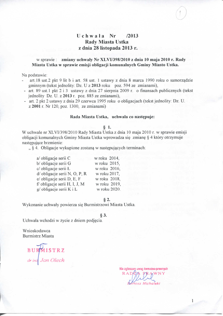U c h w a l a Nr /2013 Rady Miasta Ustka z dnia 28 listopada 2013 r. w sprawie : zmiany uchwaly Nr XLVI/398/2010 z dnia 10 maja 2010 r. Rady Miasta Ustka w sprawie emisji obligacji komunalnych Gminy Miasto Ustka. Na podstawie: art. 18 ust.2 pkt 9 lit b i art. 58 ust. 1 ustawy z dnia 8 marca 1990 roku o samorz^dzie gminnym (tekst jednolity: Dz. U z 2013 roku poz. 594 ze zmianami), - art. 89 ust.l pkt 2 i 3 ustawy z dnia 27 sierpnia 2009 r. o finansach publicznych (tekst jednolity Dz. U . z 2013 r. poz. 885 ze zmianami), - art. 2 pkt 2 ustawy z dnia 29 czerwca 1995 roku o obligacjach (tekst jednolity: Dz. U . z 2001 r. Nr 120, poz. 1300, ze zmianami) Rada Miasta Ustka, uchwala co nast^puje: § 1W uchwale nr XLVI/398/2010 Rady Miasta Ustka z dnia 10 maja 2010 r. w sprawie emisji obligacji komunalnych Gminy Miasta Ustka wprowadza si? zmian? § 4 ktory otrzymuje nast?pujqce brzmienie: „ § 4. Obhgacje wykupione zostan^ w nast^pujqcych terminach: a/obligacje serii C b/ obligacje serii G c/ obligacje serii L d/ obligacje serii N , O, P, R e/obligacje serii D, E, F f/ obligacje serii H , I, J, M g/ obligacje serii K i L wroku 2014, w roku 2015, w roku 2016, w roku 2017, wroku 2018, w roku 2019, w roku 2020. §2. Wykonanie uchwaly powierza si? Burmistrzowi Miasta Ustka. §3. Uchwala wchodzi w zycie z dniem podj?cia. Wnioskodawca Burmistrz Miasta BUWMISTRZ dr inA Jan Olech Nie zgtaszam uwag tormalnchprawnych rtosz Michalski 1 Uzasadnienie Od 01 stycznia 2014 r. wejdzie w zycie zapis art.243 ustawy z dnia 27 sierpnia 2009 r. o finansach pubHcznych, na mocy ktorego wyliczany b?dzie indywidualny wskaznik zadhizenia i splaty zobowi^zari kazdej gminy. Podejmuj^c uchwal? nr XLVI/398/2010 z dnia 10 maja 2010 r. obowi^ywal przepis , ze zadhjzenie gminy moze wynosic do 60 % a splata zobowi^zah do 15 % planowanych dochodow w danym roku budzetowym. W uchwale tej zapisano, ze serie obligacji komunalnych wykupione zostanq w nast^puj^cych latach i kwotach: 1/ w2012r. 500 000 zl, • 21 w2013 r. 500 000 zi, 3/ w2014r. 2 000 000 zl, 4/ w2015 r. 2 000 000 zl, 5/ w2016r. 2 000 000 zl, 6/ w2017r. 2 000 000 zl. Lqcznie 9 000 000 zl Przypadaj^ce do splaty serie z 2012 i 2013 r. zostaty splacone. Wieloletnia Prognoza Finansowa zostala wprowadzona w zycie na rok budzetowy 2011 tj. po emisji obligacji z 2010 r. na mocy w/w uchwaly. W zwiqzku z indywidualnym wskaznikiem zadhazenia i splaty zobowi^zah zachodzi koniecznosc dokonania zmian w latach i kwotach splaty obligacji: 1/ w2014r. 500 000 zl, 21 w2015r. 500 000 zl, 3/ w2016r. 500 000 zl, 4/ w2017r. 2 000 000 zl, 5/ w2018r. 1 500 000 zl, 6/ w2019r. 2 000 000 zl, II w 2020 r. 1 000 000 zl. Wydluzenie splaty zobowi^zah o 3 lata w kwocie 4 500 000 zl zwi^kszy koszty obsKigi tych obligacji o ok. 400 000 zl. na warunkach zawartej umowy tj. WIBOR 6 m-czny oraz marza banku 0,97 %.