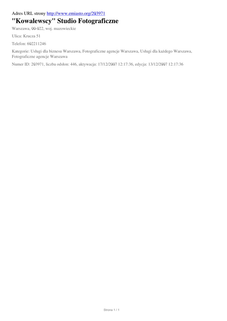 Adres URL strony http://www.emiasto.org/203971 "Kowalewscy" Studio Fotograficzne Warszawa, 00-022, woj. mazowieckie Ulica: Krucza 51 Telefon: 602211246 Kategorie: Usługi dla biznesu Warszawa, Fotograficzne agencje Warszawa, Usługi dla każdego Warszawa, Fotograficzne agencje Warszawa Numer ID: 203971, liczba odsłon: 446, aktywacja: 17/12/2007 12:17:36, edycja: 13/12/2007 12:17:36 Strona 1 / 1