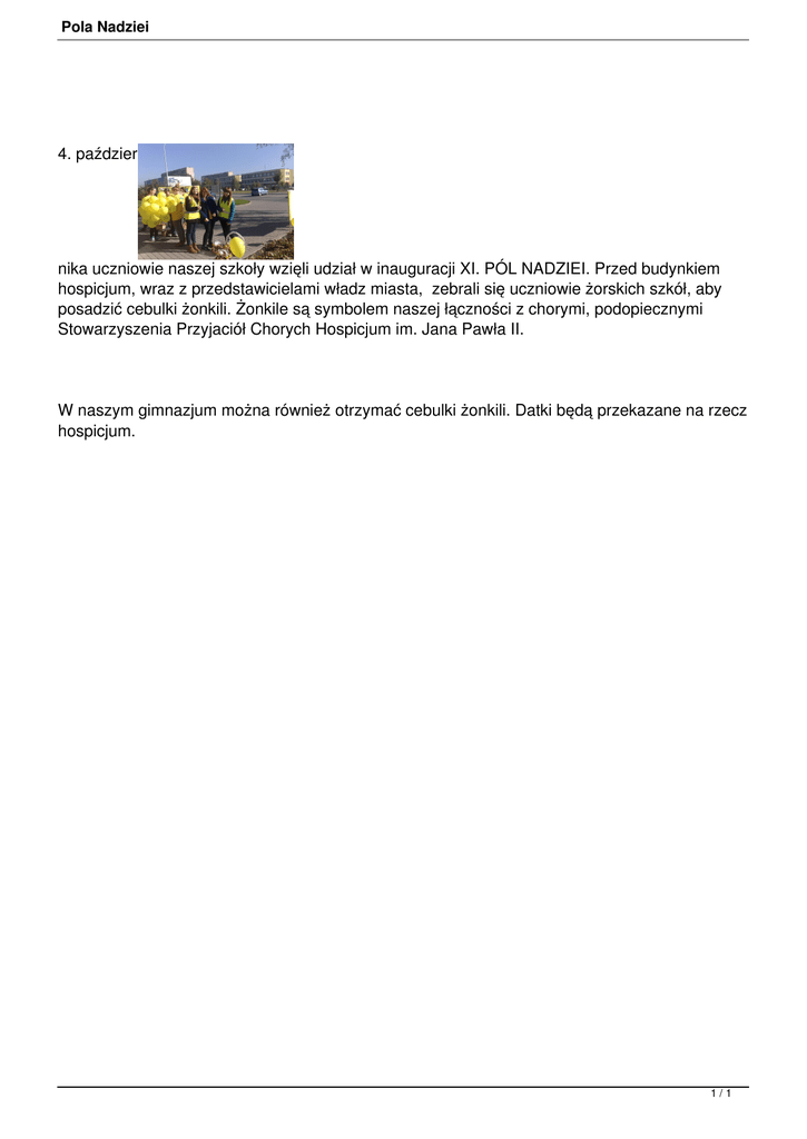 Pola Nadziei 4. paździer nika uczniowie naszej szkoły wzięli udział w inauguracji XI. PÓL NADZIEI. Przed budynkiem hospicjum, wraz z przedstawicielami władz miasta, zebrali się uczniowie żorskich szkół, aby posadzić cebulki żonkili. Żonkile są symbolem naszej łączności z chorymi, podopiecznymi Stowarzyszenia Przyjaciół Chorych Hospicjum im. Jana Pawła II. W naszym gimnazjum można również otrzymać cebulki żonkili. Datki będą przekazane na rzecz hospicjum. 1/1