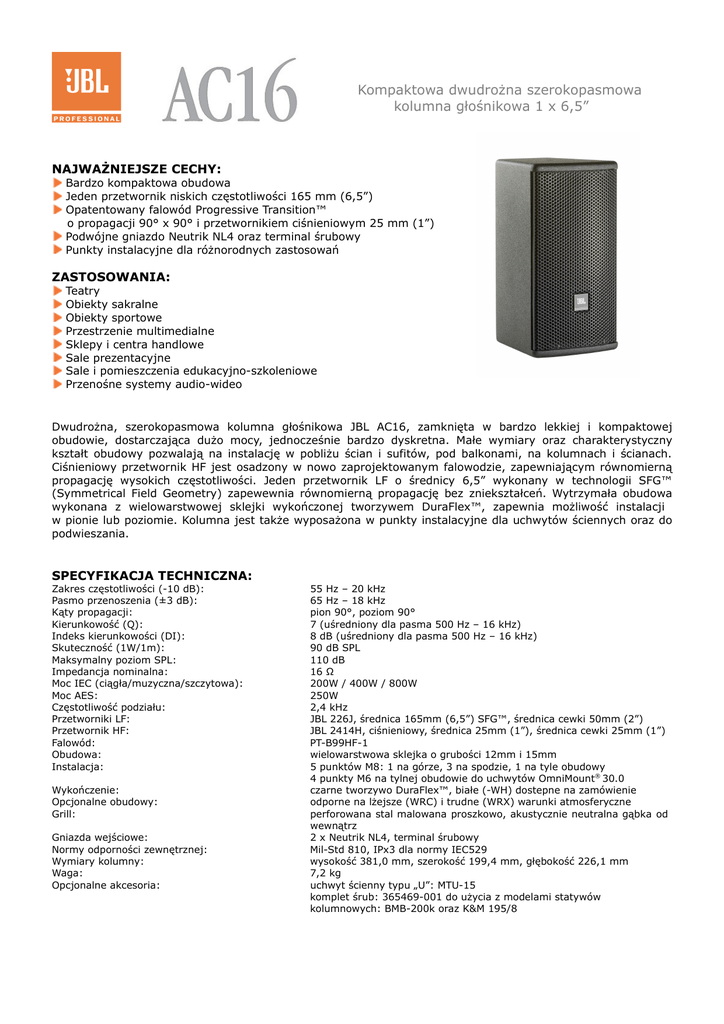 Kompaktowa dwudrożna szerokopasmowa kolumna głośnikowa 1 x 6,5” NAJWAŻNIEJSZE CECHY: Bardzo kompaktowa obudowa Jeden przetwornik niskich częstotliwości 165 mm (6,5”) Opatentowany falowód Progressive Transition™ o propagacji 90° x 90° i przetwornikiem ciśnieniowym 25 mm (1”) Podwójne gniazdo Neutrik NL4 oraz terminal śrubowy Punkty instalacyjne dla różnorodnych zastosowań ZASTOSOWANIA: Teatry Obiekty sakralne Obiekty sportowe Przestrzenie multimedialne Sklepy i centra handlowe Sale prezentacyjne Sale i pomieszczenia edukacyjno-szkoleniowe Przenośne systemy audio-wideo Dwudrożna, szerokopasmowa kolumna głośnikowa JBL AC16, zamknięta w bardzo lekkiej i kompaktowej obudowie, dostarczająca dużo mocy, jednocześnie bardzo dyskretna. Małe wymiary oraz charakterystyczny kształt obudowy pozwalają na instalację w pobliżu ścian i sufitów, pod balkonami, na kolumnach i ścianach. Ciśnieniowy przetwornik HF jest osadzony w nowo zaprojektowanym falowodzie, zapewniającym równomierną propagację wysokich częstotliwości. Jeden przetwornik LF o średnicy 6,5” wykonany w technologii SFG™ (Symmetrical Field Geometry) zapewewnia równomierną propagację bez zniekształceń. Wytrzymała obudowa wykonana z wielowarstwowej sklejki wykończonej tworzywem DuraFlex™, zapewnia możliwość instalacji w pionie lub poziomie. Kolumna jest także wyposażona w punkty instalacyjne dla uchwytów ściennych oraz do podwieszania. SPECYFIKACJA TECHNICZNA: Zakres częstotliwości (-10 dB): Pasmo przenoszenia (±3 dB): Kąty propagacji: Kierunkowość (Q): Indeks kierunkowości (DI): Skuteczność (1W/1m): Maksymalny poziom SPL: Impedancja nominalna: Moc IEC (ciągła/muzyczna/szczytowa): Moc AES: Częstotliwość podziału: Przetworniki LF: Przetwornik HF: Falowód: Obudowa: Instalacja: Wykończenie: Opcjonalne obudowy: Grill: Gniazda wejściowe: Normy odporności zewnętrznej: Wymiary kolumny: Waga: Opcjonalne akcesoria: 55 Hz – 20 kHz 65 Hz – 18 kHz pion 90°, poziom 90° 7 (uśredniony dla pasma 500 Hz – 16 kHz) 8 dB (uśredniony dla pasma 500 Hz – 16 kHz) 90 dB SPL 110 dB 16 Ω 200W / 400W / 800W 250W 2,4 kHz JBL 226J, średnica 165mm (6,5”) SFG™, średnica cewki 50mm (2”) JBL 2414H, ciśnieniowy, średnica 25mm (1”), średnica cewki 25mm (1”) PT-B99HF-1 wielowarstwowa sklejka o grubości 12mm i 15mm 5 punktów M8: 1 na górze, 3 na spodzie, 1 na tyle obudowy 4 punkty M6 na tylnej obudowie do uchwytów OmniMount® 30.0 czarne tworzywo DuraFlex™, białe (-WH) dostepne na zamówienie odporne na lżejsze (WRC) i trudne (WRX) warunki atmosferyczne perforowana stal malowana proszkowo, akustycznie neutralna gąbka od wewnątrz 2 x Neutrik NL4, terminal śrubowy Mil-Std 810, IPx3 dla normy IEC529 wysokość 381,0 mm, szerokość 199,4 mm, głębokość 226,1 mm 7,2 kg uchwyt ścienny typu „U”: MTU-15 komplet śrub: 365469-001 do użycia z modelami statywów kolumnowych: BMB-200k oraz K&M 195/8