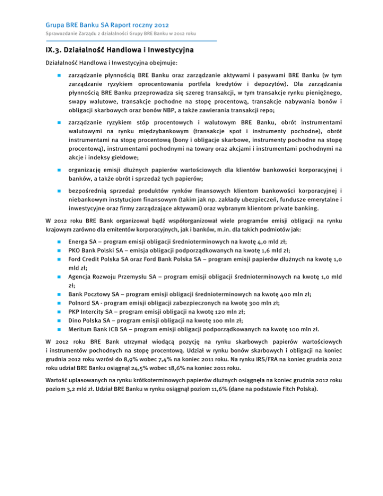 Grupa BRE Banku SA Raport roczny 2012 Sprawozdanie Zarządu z działalności Grupy BRE Banku w 2012 roku IX.3. Działalność Handlowa i Inwestycyjna Działalność Handlowa i Inwestycyjna obejmuje: zarządzanie płynnością BRE Banku oraz zarządzanie aktywami i pasywami BRE Banku (w tym zarządzanie ryzykiem oprocentowania portfela kredytów i depozytów). Dla zarządzania płynnością BRE Banku przeprowadza się szereg transakcji, w tym transakcje rynku pieniężnego, swapy walutowe, transakcje pochodne na stopę procentową, transakcje nabywania bonów i obligacji skarbowych oraz bonów NBP, a także zawierania transakcji repo; zarządzanie ryzykiem stóp procentowych i walutowym BRE Banku, obrót instrumentami walutowymi na rynku międzybankowym (transakcje spot i instrumenty pochodne), obrót instrumentami na stopę procentową (bony i obligacje skarbowe, instrumenty pochodne na stopę procentową), instrumentami pochodnymi na towary oraz akcjami i instrumentami pochodnymi na akcje i indeksy giełdowe; organizację emisji dłużnych papierów wartościowych dla klientów bankowości korporacyjnej i banków, a także obrót i sprzedaż tych papierów; bezpośrednią sprzedaż produktów rynków finansowych klientom bankowości korporacyjnej i niebankowym instytucjom finansowym (takim jak np. zakłady ubezpieczeń, fundusze emerytalne i inwestycyjne oraz firmy zarządzające aktywami) oraz wybranym klientom private banking. W 2012 roku BRE Bank organizował bądź współorganizował wiele programów emisji obligacji na rynku krajowym zarówno dla emitentów korporacyjnych, jak i banków, m.in. dla takich podmiotów jak: Energa SA – program emisji obligacji średnioterminowych na kwotę 4,0 mld zł; PKO Bank Polski SA – emisja obligacji podporządkowanych na kwotę 1,6 mld zł; Ford Credit Polska SA oraz Ford Bank Polska SA – program emisji papierów dłużnych na kwotę 1,0 mld zł; Agencja Rozwoju Przemysłu SA – program emisji obligacji średnioterminowych na kwotę 1,0 mld zł; Bank Pocztowy SA – program emisji obligacji średnioterminowych na kwotę 400 mln zł; Polnord SA - program emisji obligacji zabezpieczonych na kwotę 300 mln zł; PKP Intercity SA – program emisji obligacji na kwotę 120 mln zł; Dino Polska SA – program emisji obligacji na kwotę 100 mln zł; Meritum Bank ICB SA – program emisji obligacji podporządkowanych na kwotę 100 mln zł. W 2012 roku BRE Bank utrzymał wiodącą pozycję na rynku skarbowych papierów wartościowych i instrumentów pochodnych na stopę procentową. Udział w rynku bonów skarbowych i obligacji na koniec grudnia 2012 roku wzrósł do 8,9% wobec 7,4% na koniec 2011 roku. Na rynku IRS/FRA na koniec grudnia 2012 roku udział BRE Banku osiągnął 24,5% wobec 18,6% na koniec 2011 roku. Wartość uplasowanych na rynku krótkoterminowych papierów dłużnych osiągnęła na koniec grudnia 2012 roku poziom 3,2 mld zł. Udział BRE Banku w rynku osiągnął poziom 11,6% (dane na podstawie Fitch Polska). Grupa BRE Banku SA Raport roczny 2012 Sprawozdanie Zarządu z działalności Grupy BRE Banku w 2012 roku Na dynamicznie rosnącym rynku obligacji przedsiębiorstw BRE Bank uplasował się na drugiej pozycji z 16,3% udziałem. Zrealizowano szereg nowych emisji o znacznej wartości, tj. Echo-Investment, Polnord, Katowicki Holding Węglowy, Magellan oraz Energa. Wartość wyemitowanych i niewykupionych obligacji przedsiębiorstw na koniec grudnia 2012 roku osiągnęła około 5,1 mld zł wobec 4,6 mld zł na koniec 2011 roku. Udział Grupy w rynku papierów dłużnych banków (z wyłączeniem obligacji „drogowych” emitowanych przez BGK) wyniósł 29,8% wobec 22,0% na koniec 2011 roku, a wartość wyemitowanych i niewykupionych papierów wyniosła około 5,8 mld zł w porównaniu z 3,4 mld zł na koniec 2011 roku. Największymi emisjami w minionym roku były emisje listów zastawnych o łącznej wartości 790 mln zł dla BRE Banku Hipotecznego, aranżowane przez BRE Bank. Inne duże transakcje, w których BRE Bank brał udział, to emisja obligacji BGK o wartości 1,0 mld zł oraz emisje obligacji podporządkowanych dla PKO BP w kwocie około 1,6 mld zł. Ponadto, BRE Bank wyemitował 450 mln zł trzyletnich obligacji, które zostały uplasowane na rynku krajowym. Dodatkowo, BRE Bank powrócił na międzynarodowe rynki papierów dłużnych poprzez, zakończoną sukcesem, emisję pierwszej transzy euroobligacji o wartości nominalnej 500 mln euro w ramach programu emisji euroobligacji (EMTN). Program zwiększenia sprzedaży produktów bankowości inwestycyjnej W 2012 roku przeprowadzono wiele zmian mających na celu zwiększenie sprzedaży produktów rynku finansowego. W ramach przeprowadzonych działań, do kluczowych i mających wpływ na wielkość zrealizowanych transakcji oraz dochód wygenerowany w ramach współpracy z klientami należą: Wdrożenie nowej struktury sprzedażowej polegającej między innymi na wydzieleniu nowego stanowiska specjalisty ds. rynków finansowych, obok istniejącego stanowiska dealera walutowego. Dzięki nowemu stanowisku, realizowana jest strategia wzrostu sprzedaży transakcji pochodnych, zabezpieczających ryzyka finansowe klientów. Efektem jest wzrost sprzedaży oraz wzrost liczby klientów aktywnie zawierających transakcje pochodne o 28,0%; Wdrożenie nowego modelu obsługi klientów uwzględniającego specyfikę poszczególnych segmentów klientów korporacyjnych: K1, K2 i K3. W ramach inicjatywy został stworzony „desk” dedykowany do obsługi klientów z segmentu K3 i korzystających z platformy iBRE FX oraz dokonano odpowiedniej przebudowy zespołów obsługujących klientów z segmentów K1 i K2. W efekcie, nastąpił znaczący wzrost zarówno średniomiesięcznych przychodów BRE Banku w ciągu pół roku (o około 40%), jak i liczby klientów; Wdrożona została nowa platforma iBRE FX z wieloma innowacyjnymi funkcjonalnościami oraz wzmożone zostały działania, mające n