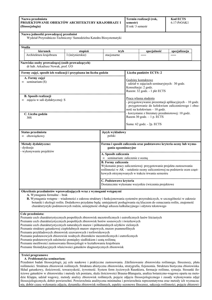 Nazwa przedmiotu PROJEKTOWANIE OBIEKTÓW ARCHITEKTURY KRAJOBRAZU I (fitosocjologia) Termin realizacji (rok, semestr) II rok/ 3 semestr Kod ECTS 6.17-PrOAK1 Nazwa jednostki prowadzącej przedmiot Wydział Przyrodniczo-Techniczny/ Samodzielna Katedra Biosystematyki Studia kierunek Architektura krajobrazu stopień I (inżynierskie) tryb stacjonarne specjalność ----- specjalizacja ----- Nazwisko osoby prowadzącej (osób prowadzących) dr hab. Arkadiusz Nowak, prof. UO Formy zajęć, sposób ich realizacji i przypisana im liczba godzin • A. Formy zajęć seminarium (S) • B. Sposób realizacji zajęcia w sali dydaktycznej: S Liczba punktów ECTS: 2 Godziny kontaktowe - udział w zajęciach seminaryjnych: 30 godz. Konsultacje: 2 godz. Razem: 32 godz. - 1 pkt ECTS Praca własna studenta - przygotowywanie prezentacji aplikacyjnych – 10 godz. - przygotowanie do kolokwium zaliczeniowego i obecność na kolokwium – 10 godz. - korzystanie z literatury przedmiotowej: 10 godz. Razem 30 godz. – 1 p. ECTS C. Liczba godzin 30S Suma: 62 godz. - 2p. ECTS Status przedmiotu • obowiązkowy Język wykładowy polski Metody dydaktyczne: - dyskusja - wykonywanie projektów Forma i sposób zaliczenia oraz podstawowe kryteria oceny lub wymagania egzaminacyjne A. Sposób zaliczenia • seminarium: zaliczenie z oceną B. Formy zaliczenia Wykonanie pracy zaliczeniowej: przygotowanie projektu zastosowania roślinności w AK - ustalenie oceny zaliczeniowej na podstawie ocen cząstkowych otrzymywanych w trakcie trwania semestru C. Podstawowe kryteria Dostatecznie wykonane wszystkie ćwiczenia projektowe Określenie przedmiotów wprowadzających wraz z wymogami wstępnymi A. Wymagania formalne – brak B. Wymagania wstępne – wiadomości z zakresu struktury i funkcjonowania systemów przyrodniczych, w szczególności w zakresie botaniki i ekologii roślin. Dodatkowo przydatne będą: umiejętność posługiwania się kluczem do oznaczania roślin, znajomość charakterystyki podstawowych rodzin, umiejętność obsługi arkusza kalkulacyjnego i edytora tekstowego Cele przedmiotu: Poznanie cech charakterystycznych pospolitych zbiorowisk mezotroficznych i eutroficznych lasów liściastych Poznanie cech charakterystycznych pospolitych zbiorowisk borów sosnowych i świerkowych Poznanie cech charakterystycznych naturalnych muraw i półnaturalnych użytków zielonych Poznanie struktury gatunkowej ciepłolubnych muraw stepowych, muraw psammofilnych Poznanie przykładowych zbiorowisk szuwarowych i torfowiskowych Poznanie podstawowych zbiorowisk wodnych zbiorników mezotroficznych i eutroficznych Poznanie podstawowych zależności pomiędzy siedliskiem i szatą roślinną Poznanie możliwości zastosowania fitosocjologii w kształtowaniu krajobrazu Poznanie fitoindykacyjnych właściwości gatunków diagnostycznych zbiorowisk Treści programowe A. Problematyka seminarium: Przedmiot badań fitosocjologii, jej cele naukowe i praktyczne zastosowania. Zdefiniowanie zbiorowiska roślinnego, fitocenozy, płatu roślinności. Struktura zbiorowisk roślinnych. Struktura abiotyczna zbiorowiska, stratygrafia, fizjonomia. Struktura biotyczna zbiorowiska. Skład gatunkowy, ilościowość, towarzyskość, żywotność. System form życiowych Raunkiera, formacje roślinne, synuzja. Stosunki ilościowe gatunków w zbiorowisku i metody ich pomiaru, skala ilościowości Brauna-Blanqueta, analiza botaniczno-wagowa oparta na metodzie Klappa, udział wagowy, metody analizy zbiorowisk roślinnych, pojęcie zdjęcia fitosocjologicznego i zasady wykonywania zdjęć fitosocjologicznych, dobór powierzchni. Powierzchnia analityczna minimalna i powierzchnia reprezentatywna oraz metody ich wyznaczania, dobór czasu wykonania zdjęcia, dynamika zbiorowisk roślinnych, aspekty sezonowe fitocenoz, sukcesja roślinności, pojęcie zbiorowi- ska klimaksowego i kręgu dynamicznego zbiorowisk roślinnych, klasyfikacja i definicje zbiorowisk roślinnych z punktu widzenia roli człowieka w ich powstawaniu i przeobrażaniu, cechy syntetyczne zbiorowisk roślinnych, stałość, wierność oraz syntetycznie ujęta ilościowość gatunków w zbiorowisku, współczynnik pokrycia gatunku, metody określania stałości fitosocjologicznej i przeciętnego pokrycia gatunku, teoria gatunków charakterystycznych, stopniowanie wierności fitosocjologicznej, gatunki charakterystyczne, wyróżniające i towarzyszące, definicja charakterystycznej kombinacji gatunków i pojęcie zespołu roślinnego, wyższe jednostki systematyczne w fitosocjologii, analizy numeryczne oraz możliwość wykorzystania komputerów w syntezie danych fitosocjologicznych, współczynniki podobieństwa, synantropizacja szaty roślinnej i jej wskaźniki, zastosowania fitosocjologii w architekturze krajobrazu Wykaz literatury A. Literatura wymagana do ostatecznego zaliczenia zajęć (zdania egzaminu): A.1. wykorzystywana podczas zajęć 1. Matuszkiewicz W. Przewodnik do oznaczania zbiorowisk roślinnych Polski. PWN Warszawa 2000. 2. Wysocki C., Sikorski P. Fitosocjologia. stosowana. Wydawnictwo SGGW 2014 (lub inne wydanie) 3. Szafer W. Szata roślinna Polski. PWN Warszawa 1972 (lub inne wydanie) 4. Falińska K. Ekologia roślin, PWN Warszawa 1997 A.2. studiowana samodzielnie przez studenta B. Literatura uzupełniająca 1. Dzwonko Z. Przewodnik do badań fitosocjologicznych. Vademecum geobotanicum. Sorus i Instytut Botaniki UJ. Kraków-Poznań 2007 2. Matuszkiewicz J.M. Zespoły leśne Polski. PWN Warszawa 3. Tomanek J. Botanika leśna. PWRiL Warszawa 1994 Odniesienie do Efekty kształcenia efektów kształ- Po ukończeniu studiów student/studentka: cenia dla kierunku K1A_W08 Wiedza: - opisuje podstawowe pojęcia z dziedziny fitosocjologii oraz podstawowe cechy analityczne zbiorowisk roślinnych K1A_W01 K1A_W02 - omawia cechy syntetyczne zbiorowisk roślinnych oraz hierarchiczny układ syntaksonów w klasyfikacji fitosocjologicznej. K1A_W01 K1A_W01 - definiuje i odtwarza wiedzę dotyczącą