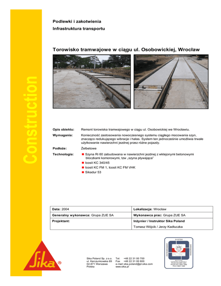 Podlewki i zakotwienia Infrastruktura transportu Construction Torowisko tramwajowe w ciągu ul. Osobowickiej, Wrocław Opis obiektu: Remont torowiska tramwajowego w ciągu ul. Osobowickiej we Wrocławiu. Wymagania: Konieczność zastosowania nowoczesnego systemu ciągłego mocowania szyn, znacząco redukującego wibracje i hałas. System ten jednocześnie umożliwia trwałe użytkowanie nawierzchni jezdnej przez różne pojazdy. Podłoże: Żelbetowe Technologia: Szyna Ri 60 zabudowana w nawierzchni jezdnej z wklejonymi betonowymi bloczkami komorowymi, tzw „szyna pływająca” Icosit KC 340/45 Icosit KC FM 1, Icosit KC FM VHK Sikadur 53 Data: 2004 Lokalizacja: Wrocław Generalny wykonawca: Grupa ZUE SA Wykonawca prac: Grupa ZUE SA Projektant: Inżynier / Instruktor Sika Poland Tomasz Wójcik / Jerzy Kadłuczka Sika Poland Sp. z o.o. ul. Karczunkowska 89 02-871 Warszawa Polska Tel. +48 22 31 00 700 Fax +48 22 31 00 800 e-mail [email protected] www.sika.pl