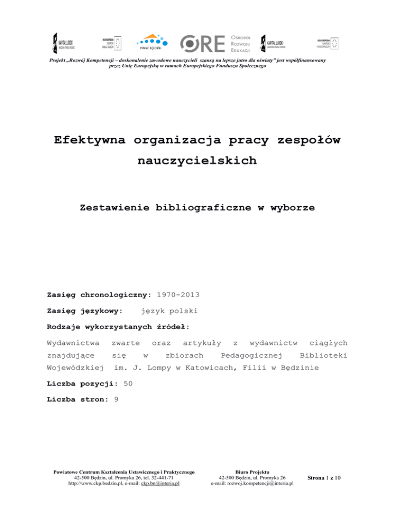 Projekt „Rozwój Kompetencji – doskonalenie zawodowe nauczycieli szansą na lepsze jutro dla oświaty” jest współfinansowany przez Unię Europejską w ramach Europejskiego Funduszu Społecznego Efektywna organizacja pracy zespołów nauczycielskich Zestawienie bibliograficzne w wyborze Zasięg chronologiczny: 1970-2013 Zasięg językowy: język polski Rodzaje wykorzystanych źródeł: Wydawnictwa zwarte oraz znajdujące się Wojewódzkiej im. J. Lompy w Katowicach, Filii w Będzinie w artykuły zbiorach z wydawnictw Pedagogicznej ciągłych Biblioteki Liczba pozycji: 50 Liczba stron: 9 Powiatowe Centrum Kształcenia Ustawicznego i Praktycznego 42-500 Będzin, ul. Promyka 26, tel. 32-441-71 http://www.ckp.bedzin.pl, e-mail: [email protected] Biuro Projektu 42-500 Będzin, ul. Promyka 26 e-mail: [email protected] Strona 1 z 10 Projekt „Rozwój Kompetencji – doskonalenie zawodowe nauczycieli szansą na lepsze jutro dla oświaty” jest współfinansowany przez Unię Europejską w ramach Europejskiego Funduszu Społecznego Efektywna organizacja pracy zespołów nauczycielskich 1. Bullough, Robert V. Początkujący nauczyciel : studium przypadku / Robert V. Bullough. - Gdańsk : Gdańskie Wydawnictwo Psychologiczne, 2009. - 184 s. : il. ; 26 cm. Bibliogr.. - ISBN 9788374892117 2. Płeć Chomczyńska-Rubacha, Mariola. Red. i rodzaj w edukacji / red. Mariola Chomczyńska-Rubacha. - Łódź : Wyższa Szkoła Humanistyczno-Ekonomiczna, 2004. - 224 s. : wykr. ; 24 cm. Bibliogr. s. 211-224. - ISBN 83-7405-161-2 3. Day, Christopher (1943-). Nauczyciel z pasją : jak zachować entuzjazm i zaangażowanie w pracy / Christopher Day. - Gdańsk : Gdańskie Wydawnictwo Psychologiczne, 2008. 224 s. : il. ; 22 cm. - (Biblioteka Wychowawcy). - Bibliogr. s. 209- 224.. - ISBN 978-83-7489-137-0 4. Day, Christopher (1943-). Od teorii do praktyki : rozwój zawodowy nauczyciela / Christopher Day. Wyd. 2 w jęz. pol. - Gdańsk : Gdańskie Wydawnictwo Psychologiczne, 2008. 334 s. : il. ; 23 cm. - (Interdyscyplinarna seria akademicka). - Bibliogr. s. 295-322. Indeksy.. - ISBN 978-83-7489-136-3 5. Ekiert-Oldroyd, Dorota Nowatorstwo pedagogiczne nauczycieli : teoria, praktyka, perspektywy / Dorota Ekiert-Grabowska. - Katowice : UŚ, 1989. - 193, [2] s. : err. ; 24 cm. - (Prace Naukowe Uniwersytetu Śląskiego w Katowicach, ISSN 0208-6336 ; nr 1021). - Bibliogr. s. 151-157. - Rez., summ. - ISBN 83-226-0252-9 6. Elsner, Danuta Jak organizować wewnątrzszkolne doskonalenie nauczycieli? / Danuta Elsner i Krystyna Knafel. - Chorzów : "Mentor", 2000. - 196 s. : il. ; 24 cm. Bibliogr. - Streszcz. ang. - ISBN 83-905964-5-8 Powiatowe Centrum Kształcenia Ustawicznego i Praktycznego 42-500 Będzin, ul. Promyka 26, tel. 32-441-71 http://www.ckp.bedzin.pl, e-mail: [email protected] Biuro Projektu 42-500 Będzin, ul. Promyka 26 e-mail: [email protected] Strona 2 z 10 Projekt „Rozwój Kompetencji – doskonalenie zawodowe nauczycieli szansą na lepsze jutro dla oświaty” jest współfinansowany przez Unię Europejską w ramach Europejskiego Funduszu Społecznego 7. Gaś, Zbigniew Bronisław (1952-). Doskonalący się nauczyciel : psychologiczne aspekty rozwoju profesjonalnego nauczycieli / Zbigniew B. Gaś. - Lublin : Wydaw. Uniwersytetu Marii CurieSkłodowskiej, 2001. - 206, [1] s. ; 24 cm. - Bibliogr. - ISBN 83-227-1774-1 8. Jak Gęsicki, Janusz nie zwariować w szkole / Janusz Gęsicki. - Warszawa : Wydawnictwa Szkolne i Pedagogiczne, 1999. - 165, [1] s. : rys. ; 20 cm. - (Psychologia, ISSN Pedagogika). - Bibliogr. s. 63-64, 132-133, 165-[166]. - ISBN 83-0207242-7 9. Gogol-Drożniakiewicz, Barbara Działalność społeczno-wychowawcza nauczycieli wychowania muzycznego w pracy pozalekcyjnej i pozaszkolnej / BarbaraGogol-Drożniakiewicz. - Bydgoszcz : Wyższa Szkoła Pedagogiczna, 1993. - 160, [2] s. : rys. ; 21 cm. - Bibliogr. s. 148-154.. - ISBN 83-7096-010-3 10. Hörner, Wolfgang (1944-). Red. Nauczyciel i kształcenie nauczycieli : zmiany i wyzwania / pod red. Wolfganga Hörnera i Mirosława S. Szymańskiego ;teksty niem. w tł. Mirosława S. Szymańskiego i Doroty Sztobryn . - Warszawa : Wydawnictwo Akademickie Żak, 2005. - 289, [1] s. : il. ; 21 cm. -. - ISBN 83-89501-48-1 11. Jankiewicz, Eugeniusz (1947-). Red. Nasze czasy wołają o świętych nauczycieli : 70. Ogólnopolska Pielgrzymka Nauczycieli Eugeniusz i Wychowawców, Jasna Jankiewicz]. - Zielona Góra, 30czerwca-1 Góra : lipca Ogólnopolskie 2007 / [red. Stowarzyszenie Nauczycieli "Warsztaty w Drodze", 2007. - 117 s. : il. ; 21 cm. - ISBN 97883-916341-3-4 12. Jankiewicz, Eugeniusz (1947-). Red. Nauczyciel człowiekiem dialogu : 69. Ogólnopolska Pielgrzymka Nauczycieli i Wychowawców, Krajowe Jasna Góra, Duszpasterstwo 1-2 lipca 2006 /[red. Nauczycieli]. - Zielona Eugeniusz Jankiewicz Góra Ogólnopolskie : ; Stowarzyszenie Nauczycieli "Warsztaty w Drodze", 2006. - 78 s. ; 21 cm. ISBN 83-916341-7-5 Powiatowe Centrum Kształcenia Ustawicznego i Praktycznego 42-500 Będzin, ul. Promyka 26, tel. 32-441-71 http://www.ckp.bedzin.pl, e-mail: [email protected] Biuro Projektu 42-500 Będzin, ul. Promyka 26 e-mail: [email protected] Strona 3 z 10 Projekt „Rozwój Kompetencji – doskonalenie zawodowe nauczycieli szansą na lepsze jutro dla oświaty” jest współfinansowany przez Unię Europejską w ramach Europejskiego Funduszu Społecznego 13. Jones, Jeff Jak wspierać rozwój zawodowy nauczycieli / Jeff Jones, Mazda Jenkin, Sue Lord. - Warszawa : Wydawnictwo Szkolne i Pedagogiczne, 2008. - 192 s. : il. ; 24 cm. - ISBN 9788302102424 14. Twórczy Juszczyk, Stanisław (1951-). Red. rozwój nauczyciela : praca zespołowa / pod red. Stanisława Juszczyka. - Kraków : "Impuls", 1996. - 166 s. : il. ; 24 cm. - (Praca Naukowa / Wyższa Szkoła Edukacji Wczesnoszkolnej w Mysłowicach ; nr 1). Bibliogr. przy pracach.. - ISBN 83-86994-10-X 15. ABC Kobyliński, Władysław organizacji pracy nauczyciela / Władysław Kobyliński. - Warszawa : Wydawnictwa Szkolne 