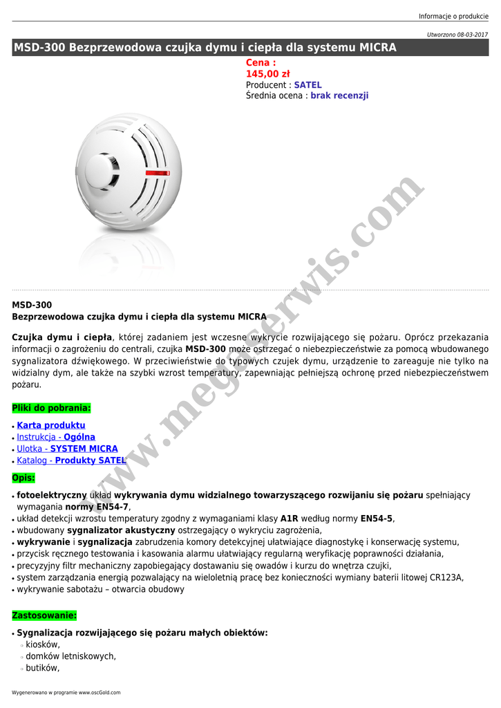 Informacje o produkcie Utworzono 08-03-2017 MSD-300 Bezprzewodowa czujka dymu i ciepła dla systemu MICRA Cena : 145,00 zł rw is .c om Producent : SATEL Średnia ocena : brak recenzji eg as e MSD-300 Bezprzewodowa czujka dymu i ciepła dla systemu MICRA Czujka dymu i ciepła, której zadaniem jest wczesne wykrycie rozwijającego się pożaru. Oprócz przekazania informacji o zagrożeniu do centrali, czujka MSD-300 może ostrzegać o niebezpieczeństwie za pomocą wbudowanego sygnalizatora dźwiękowego. W przeciwieństwie do typowych czujek dymu, urządzenie to zareaguje nie tylko na widzialny dym, ale także na szybki wzrost temperatury, zapewniając pełniejszą ochronę przed niebezpieczeństwem pożaru. ● ● ● Karta produktu Instrukcja - Ogólna Ulotka - SYSTEM MICRA Katalog - Produkty SATEL w ● ● ● ● ● ● ● fotoelektryczny układ wykrywania dymu widzialnego towarzyszącego rozwijaniu się pożaru spełniający wymagania normy EN54-7, układ detekcji wzrostu temperatury zgodny z wymaganiami klasy A1R według normy EN54-5, wbudowany sygnalizator akustyczny ostrzegający o wykryciu zagrożenia, wykrywanie i sygnalizacja zabrudzenia komory detekcyjnej ułatwiające diagnostykę i konserwację systemu, przycisk ręcznego testowania i kasowania alarmu ułatwiający regularną weryfikację poprawności działania, precyzyjny filtr mechaniczny zapobiegający dostawaniu się owadów i kurzu do wnętrza czujki, system zarządzania energią pozwalający na wieloletnią pracę bez konieczności wymiany baterii litowej CR123A, wykrywanie sabotażu – otwarcia obudowy w ● w Opis: ● .m Pliki do pobrania: Zastosowanie: ● Sygnalizacja rozwijającego się pożaru małych obiektów: kiosków, domków letniskowych, butików, ❍ ❍ ❍ Wygenerowano w programie www.oscGold.com ❍ ❍ garaży wolnostojących warsztatów Zawartość zestawu: ● ● ● ● ● Czujka, Osłona przeciwpyłowa, Bateria litowa CR123A, Elementy montażowe, Instrukcja obsługi ● ● ● ● ● ● rw ● eg as e ● .m ● w ● Maksymalny pobór prądu - 20 mA Bateria - CR123A 3 V Masa - 170 g Czas pracy na baterii - około 3 lata Zakres temperatur pracy - 0 °C...55 °C Wymiary obudowy - o108 x 61 mm Pasmo częstotliwości pracy - 433,05 ÷ 434,79 MHz Zasięg komunikacji radiowej (w terenie otwartym) - do 200 m Pobór prądu w stanie gotowości - 50 µA Klasa wg EN 54-5 (czujnik termiczny) - A1R Maksymalna statyczna temperatura zgłoszenia alarmu - 65 °C Minimalna statyczna temperatura zgłoszenia alarmu - 54 °C w ● w ● is .c om Parametry: