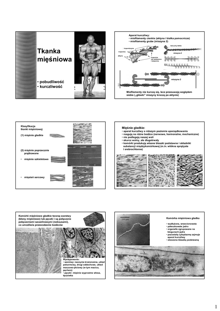 Aparat kurczliwy: • miofilamenty cienkie (aktyna i białka pomocnicze) • miofilamenty grube (miozyna 2) łańcuchy lekkie Tkanka mięśniowa tropomiozyna troponina miozyna 2 aktyna troponina lub kaldesmon i kalponina miozyna 2 • pobudliwość • kurczliwość Miofilamenty nie kurczą się, lecz przesuwają względem siebie („główki” miozyny kroczą po aktynie) Klasyfikacja tkanki mięśniowej: Mięśnie gładkie: • aparat kurczliwy o niższym poziomie uporządkowania • reagują na różne bodźce (nerwowe, hormonalne, mechaniczne) • nie podlegają naszej woli • skurcz wolny, ale długotrwały • komórki produkują własne blaszki podstawne i składniki substancji międzykomórkowej (m.in. włókna sprężyste i srebrochłonne) (1) mięśnie gładkie (2) mięśnie poprzecznie prążkowane • mięśnie szkieletowe • mięsień sercowy Komórki mięśniowe gładkie tworzą warstwy (błony mięśniowe) lub pęczki i są połączone połączeniami szczelinowymi (neksusami), co umożliwia przewodzenie bodźców Komórka mięśniowa gładka • wydłużona, wrzecionowata • pałeczkowate jadro • organelle zgrupowane na biegunach jądra • pozostałą cytoplazmę zajmuje aparat kurczliwy • otoczona blaszką podstawną Występowanie: • warstwy: naczynia krwionośne, układ pokarmowy, drogi oddechowe, układ moczowo-płciowy (w tym macica, pęcherz) • pęczki: mięśnie wyprostne włosa, tęczówka 1 Bardzo liczne cienkie i nieliczne grube miofilamenty tworzą wydłużoną sieć Miofilamenty cienkie są powiązane ze sobą i przyczepione do błony komórkowej za pośrednictwem białek wiążących aktynę ciałka gęste (α-aktynina) podbłonowa płytka gęsta (α-aktynina, winkulina) ciałko gęste kaweola podbłonowa płytka gęsta Aparat kurczliwy: • miofilamenty cienkie: - aktyna - tropomiozyna - kaldesmon - kalponina • miofilamenty grube: miozyna 2 Molekularny mechanizm skurczu komórki mięśniowej gładkiej: 1. Bodziec 2. Otwarcie kanałów wapniowych 3. Wzrost poziomu Ca2+ w cytoplazmie (sygnał wewnątrzkomórkowy) 4. Przyłączenie jonów Ca do kaldesmonu i kalponiny (wzrost aktywności ATPazowej miozyny) oraz do cytoplazmatycznego białka - kalmoduliny 5. Kompleks kalmodulina-Ca aktywuje kinazę lekkich łańcuchów miozyny… Śródmiąższowe komórki Cajala (specyficzna populacja komórek mięśniowych gładkich) • liczne długie wypustki • słabiej rozwinięty ap. kurczliwy • liczne zakończenia nerwowe • b. liczne połączenia szczelinowe Funkcje: • spontanicznie generują bodźce skurczowe (kom. „rozrusznikowe”) • pośredniczą w przekazywaniu bodźców pomiędzy zakończeniami nerwowymi a „roboczymi” komórkami mięśniowymi Występowanie: • przewód pokarmowy • naczynia krwionośne • moczowód 6. Kinaza fosforyluje łańcuchy lekkie, co powoduje odsłonięcie miejsc wiążących aktynę miejsca wiążące aktynę „zamknięte” kinaza lekkich łańcuchów fosforylacja łańcuchów lekkich miozyny miejsca wiążące aktynę „otwarte” 7. Miozyna łączy się z aktyną 8. Skurcz Niemięśniowe komórki kurczliwe: - różne pochodzenie - aparat kurczliwy jak w komórkach mięśniowych gładkich • Komórki mioepitelialne - pochodzenie nabłonkowe - obecne w niektórych gruczołach - „wyciskają” wydzielinę do przewodów • Miofibroblasty - pochodzenie mezenchymatyczne - obecne w skórze i niektórych narządach - uczestniczą w gojeniu ran • Komórki mioidne - pochodzenie mezenchymatyczne - występują w jądrach - „wypychają” plemniki z kanalików nasiennych • Perycyty - pochodzenie mezenchymatyczne - występuja w ścianie naczyń włosowatych - regulują światło naczynia 2 Mięśnie szkieletowe • aparat kurczliwy o uporządkowanym układzie • reagują wyłącznie na bodźce nerwowe • zależą od naszej woli • skurcz szybki, ale krótkotrwały • włókna mięśniowe wytwarzają własną blaszkę podstawną Mięsień szkieletowy jest narządem zbudowanym z włókien mięśniowych i tkanki łącznej otaczającej: brzusiec (namięsna), pęczki włókien (omięsna) i pojedyncze włókna mięśniowe (śródmięsna) namięsna śródmięsna omięsna mięsień pęczek mięśniowy blaszka podstawna cytoplazma jądro włókno mięśniowe W tkance łącznej przebiegają naczynia krwionośne i włókna nerwowe Włókno mięśniowe szkieletowe jest wielojądrzastą zespólnią powstałą przez zespolenie wielu komórek prekursorowych (mioblastów) Budowa włókna mięśniowego szkieletowego: • sarkolema (błona komórkowa + blaszka podstawna) • wąska obwodowa warstwa cytoplazmy zawierająca jądra i organelle • obszar centralny zawierający aparat kurczliwy - równolegle ułożone, poprzecznie prążkowane miofibryle Pomiędzy miofibrylami: • mitochondria, kanaliki T, siateczka sarkoplazmatyczna • glikogen, mioglobina Budowa miofibryli: regularny układ miofilamentów tworzy segmenty - sarkomery Filamenty i białka podporowe sarkomeru i miofibryli titina tropomodulina nebulina H I • linia Z: α-aktynina, mocuje końce cienkich miofilamentów • linia M: miomezyna, tworzy mostki łączące bocznie grube miofilamenty Z A M I Z • titina – zapobiega nadmiernemu rozciągnięciu sarkomeru • nebulina – usztywnia cienki miofilament • tropomodulina – blokuje wolny koniec cienkiego miofilamentu, zapobiega jego wydłużaniu (polimeryzacji aktyny) aktyna dystrofina Dystrofina łączy obwodowe miofilamenty cienkie z błoną komórkową 3 Mutacje w obrębie genu kodującego dystrofinę wywołują ciężkie schorzenie miodegeneracyjne, dystrofię mięśniową Duchenne’a Miofibryle połączone są na wysokości linii Z sarkomerów poprzecznie biegnącymi filamentami pośrednimi (desmina) w ten sposób, że sarkomery znajdują się na tym samym poziomie daje to efekt poprzecznego prążkowania całego włókna mięśniowego Molekularna struktura miofilamentów cienkie tropomiozyna grube