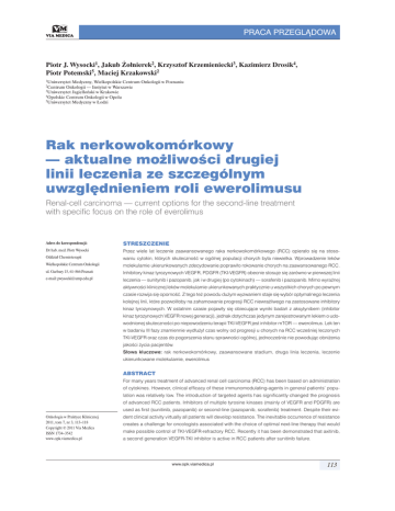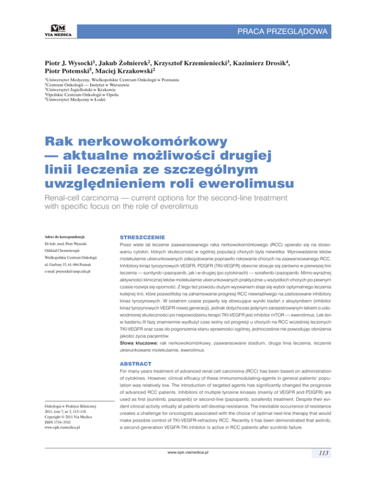 PRACA PRZEGLĄDOWA Piotr J. Wysocki1, Jakub Żołnierek2, Krzysztof Krzemieniecki3, Kazimierz Drosik4, Piotr Potemski5, Maciej Krzakowski2 1Uniwersytet Medyczny, Wielkopolskie Centrum Onkologii w Poznaniu Onkologii — Instytut w Warszawie 3Uniwersytet Jagielloński w Krakowie 4Opolskie Centrum Onkologii w Opolu 5Uniwersytet Medyczny w Łodzi 2Centrum Rak nerkowokomórkowy — aktualne możliwości drugiej linii leczenia ze szczególnym uwzględnieniem roli ewerolimusu Renal-cell carcinoma — current options for the second-line treatment with specific focus on the role of everolimus Adres do korespondencji: STRESZCZENIE Dr hab. med. Piotr Wysocki Przez wiele lat leczenie zaawansowanego raka nerkowokomórkowego (RCC) opierało się na stoso- Oddział Chemioterapii waniu cytokin, których skuteczność w ogólnej populacji chorych była niewielka. Wprowadzenie leków Wielkopolskie Centrum Onkologii molekularnie ukierunkowanych zdecydowanie poprawiło rokowanie chorych na zaawansowanego RCC. ul. Garbary 15, 61–866 Poznań Inhibitory kinaz tyrozynowych VEGFR, PDGFR (TKI-VEGFR) obecnie stosuje się zarówno w pierwszej linii e-mail: [email protected] leczenia — sunitynib i pazopanib, jak i w drugiej (po cytokinach) — sorafenib i pazopanib. Mimo wyraźnej aktywności klinicznej leków molekularnie ukierunkowanych praktycznie u wszystkich chorych po pewnym czasie rozwija się oporność. Z tego też powodu dużym wyzwaniem staje się wybór optymalnego leczenia kolejnej linii, które pozwoliłoby na zahamowanie progresji RCC niewrażliwego na zastosowane inhibitory kinaz tyrozynowych. W ostatnim czasie pojawiły się obiecujące wyniki badań z aksytynibem (inhibitor kinaz tyrozynowych VEGFR nowej generacji), jednak dotychczas jedynym zarejestrowanym lekiem o udowodnionej skuteczności po niepowodzeniu terapii TKI-VEGFR jest inhibitor mTOR — ewerolimus. Lek ten w badaniu III fazy znamiennie wydłużył czas wolny od progresji u chorych na RCC wcześniej leczonych TKI-VEGFR oraz czas do pogorszenia stanu sprawności ogólnej, jednocześnie nie powodując obniżenia jakości życia pacjentów. Słowa kluczowe: rak nerkowokomórkowy, zaawansowane stadium, druga linia leczenia, leczenie ukierunkowane molekularnie, ewerolimus ABSTRACT For many years treatment of advanced renal cell carcinoma (RCC) has been based on administration of cytokines. However, clinical efficacy of these immunomodulating-agents in general patients’ population was relatively low. The introduction of targeted agents has significantly changed the prognosis of advanced RCC patients. Inhibitors of multiple tyrosine kinases (mainly of VEGFR and PDGFR) are used as first (sunitinib, pazopanib) or second-line (pazopanib, sorafenib) treatment. Despite their eviOnkologia w Praktyce Klinicznej 2011, tom 7, nr 3, 113–118 Copyright © 2011 Via Medica ISSN 1734–3542 www.opk.viamedica.pl dent clinical activity virtually all patients will develop resistance. The inevitable occurrence of resistance creates a challenge for oncologists associated with the choice of optimal next-line therapy that would make possible control of TKI-VEGFR-refractory RCC. Recently it has been demonstrated that axitinib, a second generation VEGFR-TKI inhibitor is active in RCC patients after sunitinib failure. www.opk.viamedica.pl 113 ONKOLOGIA W PRAKTYCE KLINICZNEJ 2011, tom 7, nr 3 However, it is everolimus that remains the only agent currently approved for treatment of RCC refractory to multikinase inhibitors. In a phase III clinical study everolimus significantly prolonged progression free survival and time to deterioration of Karnofsky’s performance status, without significant negative influence on overall patients' quality of life. Key words: renal-cell carcinoma, advanced stage, second-line treatment, everolimus, molecular targeted therapy Onkol. Prak. Klin. 2011; 7, 3: 113–118 Wstęp Rak nerkowokomórkowy (RCC, renal cell carcinoma) stanowi około 3% wszystkich nowotworów złośliwych. W Polsce rocznie rozpoznaje się go u około 3800 chorych, a około 2500 chorych umiera z powodu tego nowotworu [1]. U około 30% chorych w chwili rozpoznania występują przerzuty w odległych narządach, a u niemal połowy chorych dochodzi do uogólnienia po pierwotnym leczeniu chirurgicznym o założeniu doszczętnym [2]. Średnie przeżycie chorych na uogólnionego RCC niepoddawanych leczeniu systemowemu wynosi około 12 miesięcy, ale choroba może mieć bardzo indywidualny przebieg naturalny (gwałtowny z szybką progresją lub powolny z okresową stabilizacją lub niekiedy samoistną regresją) [3, 4]. Pod względem morfologicznym RCC jest nowotworem zróżnicowanym — najczęściej (około 80%) rozpoznaje się raka jasnokomórkowego, a pozostałe 20% stanowią inne typy histologiczne (brodawkowaty, chromofobny, rdzeniasty oraz z cewek zbiorczych). Rak jasnokomórkowy u 55–70% chorych wiąże się z inaktywacją supresorowego genu VHL (von Hippel-Lindau) [5], który bierze udział w degradacji czynników indukowanych hipoksją typu 1a i 2a (HIF1a, HIF2a, hypoxia-inducible factor 1a, 2a). Aktywność czynników transkrypcyjnych HIF1a, HIF2a warunkuje ekspresję między innymi czynnika wzrostu śródbłonka naczyniowego (VEGF, vascular endothelial growth factor) i płytkowo-pochodnego czynnika wzrostu (PDGF, platelet-derived growth factor), które mają zasadnicze znaczenie w rozwoju RCC oraz angiogenezie aktywowanej w drodze pobudzenia szlaku PI3K/AKT/mTOR oraz Ras/Raf/MEK/ERK [6, 7]. Rak nerkowokomórkowy, a przede wszystkim typ jasnokomórkowy, uważa się za nowotwór immunogenny, którego wzrost i progresja zależą od upośledzenia naturalnych mechanizmów przeciwnowotworowych. Przez wiele lat jedyną metodą leczenia systemowego RCC pozostawała immunoterapia, której podstawą były rekombinowane cytokiny, ale skuteczność interleukiny 2 (IL-2) i/lub interferonu a (IFN-a) w ogólnej populacji chorych na zaawansowanego RCC była niewielka [8