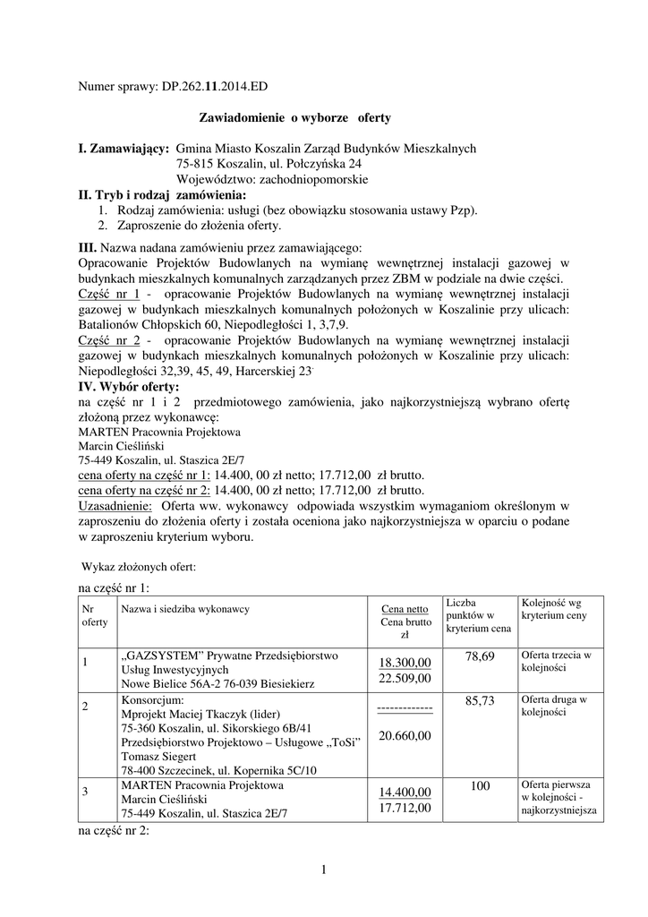 Numer sprawy: DP.262.11.2014.ED Zawiadomienie o wyborze oferty I. Zamawiający: Gmina Miasto Koszalin Zarząd Budynków Mieszkalnych 75-815 Koszalin, ul. Połczyńska 24 Województwo: zachodniopomorskie II. Tryb i rodzaj zamówienia: 1. Rodzaj zamówienia: usługi (bez obowiązku stosowania ustawy Pzp). 2. Zaproszenie do złożenia oferty. III. Nazwa nadana zamówieniu przez zamawiającego: Opracowanie Projektów Budowlanych na wymianę wewnętrznej instalacji gazowej w budynkach mieszkalnych komunalnych zarządzanych przez ZBM w podziale na dwie części. Część nr 1 - opracowanie Projektów Budowlanych na wymianę wewnętrznej instalacji gazowej w budynkach mieszkalnych komunalnych położonych w Koszalinie przy ulicach: Batalionów Chłopskich 60, Niepodległości 1, 3,7,9. Część nr 2 - opracowanie Projektów Budowlanych na wymianę wewnętrznej instalacji gazowej w budynkach mieszkalnych komunalnych położonych w Koszalinie przy ulicach: Niepodległości 32,39, 45, 49, Harcerskiej 23. IV. Wybór oferty: na część nr 1 i 2 przedmiotowego zamówienia, jako najkorzystniejszą wybrano ofertę złożoną przez wykonawcę: MARTEN Pracownia Projektowa Marcin Cieśliński 75-449 Koszalin, ul. Staszica 2E/7 cena oferty na część nr 1: 14.400, 00 zł netto; 17.712,00 zł brutto. cena oferty na część nr 2: 14.400, 00 zł netto; 17.712,00 zł brutto. Uzasadnienie: Oferta ww. wykonawcy odpowiada wszystkim wymaganiom określonym w zaproszeniu do złożenia oferty i została oceniona jako najkorzystniejsza w oparciu o podane w zaproszeniu kryterium wyboru. Wykaz złożonych ofert: na część nr 1: Nr oferty 1 2 3 Nazwa i siedziba wykonawcy Cena netto Cena brutto zł „GAZSYSTEM” Prywatne Przedsiębiorstwo Usług Inwestycyjnych Nowe Bielice 56A-2 76-039 Biesiekierz Konsorcjum: Mprojekt Maciej Tkaczyk (lider) 75-360 Koszalin, ul. Sikorskiego 6B/41 Przedsiębiorstwo Projektowo – Usługowe „ToSi” Tomasz Siegert 78-400 Szczecinek, ul. Kopernika 5C/10 MARTEN Pracownia Projektowa Marcin Cieśliński 75-449 Koszalin, ul. Staszica 2E/7 na część nr 2: 1 18.300,00 22.509,00 ------------- Liczba Kolejność wg punktów w kryterium ceny kryterium cena 78,69 Oferta trzecia w kolejności 85,73 Oferta druga w kolejności 20.660,00 14.400,00 17.712,00 100 Oferta pierwsza w kolejności najkorzystniejsza Nr oferty 1 2 3 Nazwa i siedziba wykonawcy Cena netto Cena brutto zł „GAZSYSTEM” Prywatne Przedsiębiorstwo Usług Inwestycyjnych Nowe Bielice 56A-2 76-039 Biesiekierz Konsorcjum: Mprojekt Maciej Tkaczyk (lider) 75-360 Koszalin, ul. Sikorskiego6B/41 Przedsiębiorstwo Projektowo – Usługowe „ToSi” Tomasz Siegert 78-400 Szczecinek, ul. Kopernika 5C/10 MARTEN Pracownia Projektowa Marcin Cieśliński 75-449 Koszalin, ul. Staszica 2E/7 Koszalin, dnia 9. 05. 2014r. 21.500,00 26.445,00 ------------- Liczba Kolejność wg punktów w kryterium ceny kryterium cena 66,98 Oferta trzecia w kolejności 84,95 Oferta druga w kolejności 20.850,00 14.400,00 17.712,00 100 Oferta pierwsza w kolejności najkorzystniejsza Dyrektor mgr Monika Tkaczyk 2