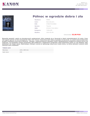 Kanon s.c. Ul. Zamiany 16/2 02-786 Warszawa Północ w ogrodzie dobra i zła Wydawca: REBIS Autor: Berendt John EAN: 9788375102802 Oprawa: Twarda ISBN: 978-83-7510-280-2 Kategoria: THRILLER Wydano: 2012-05-09 Cena brutto: 32,00 PLN Niezwykła opowieść, oparta na dramatycznych wydarzeniach, które rozegrały się w Savannah w latach osiemdziesiątych XX wieku. Przez 216 tygodni gościła na liście bestsellerów 'New York Timesa'! Dziennikarz John Kelso przyjeżdża do Savannah, by opisać bożonarodzeniowe przyjęcie wydawane przez Johna Williamsa - jednego z najzamożniejszych obywateli miasta. Niespodziewanie świąteczna impreza kończy się tragicznie, a jej gospodarz zostaje aresztowany jako podejrzany o popełnienie morderstwa. Kelso postanawia zostać na czas śledztwa, żeby dowiedzieć się czegoś więcej. Nadchodzące miesiące uczynią ze spokojnego dotychczas miasta arenę, na której odkrytych zostanie wiele ciemnych stron moralności. Tabela cech Wymiary 135 x 205 mm Ilość stron 470 http://www.kanon24.pl sklep internetowy