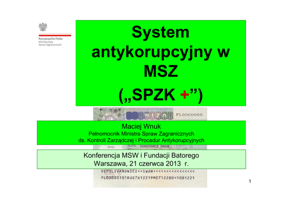 System antykorupcyjny w MSZ („SPZK +”) Maciej Wnuk Pełnomocnik Ministra Spraw Zagranicznych ds. Kontroli Zarządczej i Procedur Antykorupcyjnych Konferencja MSW i Fundacji Batorego Warszawa, 21 czerwca 2013 r. 1 Filozofia podejścia Co zrobisz ze znalezionym na parkingu portfelem, jeżeli masz gwarancję, że nikt Cię nie widzi? Zatrzymam 17% Nie wiem 50% Oddam 33% Źródło: Daniel Kaufmann, World Bank Institute, luty 2006. 2 Filozofia podejścia Co zrobisz ze znalezionym na parkingu portfelem, jeżeli istnieje 30% prawdopodobieństwo, że sfilmuje cię kamera? Zatrzymam 4% Nie wiem 22% Oddam 74% Źródło: Daniel Kaufmann, World Bank Institute, luty 2006. 3 Filozofia podejścia Dwie wiadomości: zła i dobra. Zła: korupcji nie da się zlikwidować całkowicie… Zatrzymam 17% Dobra: zjawiska korupcyjne można zmarginalizować. Zatrzymam 4% Nie wiem 22% Nie wiem 50% Oddam 33% Oddam 74% Polityka antykorupcyjna polega na zarządzaniu ryzykiem korupcyjnym 4 SPZK I etap 2011 r. – 2012 r. 27 procesów funkcjonowania MSZ, 95 czynników ryzyka korupcyjnego, dla 55 czynników – działania minimalizujące, grudzień 2012 r. - certyfikacja II etap 2013 r. 19 procesów funkcjonowania MSZ 5 Procedura reakcji na zdarzenie korupcyjne lub podejrzenie takich zdarzeń - SPZK 1. Sposób reakcji na propozycje lub naciski korupcyjne 2. Zgłoszenie pracownik centrali kontrola audyt inspekcja nadzór pracownik zgłoszenie zewnętrzne placówki [email protected] 3. Postępowanie wyjaśniające Pełnomocnik ds. antykorupcji, dyrektorzy BKA i ISZ 4. Ocena wyników, ew. zgłoszenia i wnioski 5. Reakcja na zagrożenie zabezpieczenie dowodów przesunięcia kadrowe dodatkowy nadzór ponowne wszczęcie sprawy 6 Osoby zaangażowane Przedstawiciel Kierownictwa ds. SPZK (wiceminister) Pełnomocnik Ministra ds. Kontroli Zarządczej i Procedur Antykorupcyjnych Specjalista ds. antykorupcji - Sekretariat Ministra Dwa stanowiska w Inspektoracie Służby Zagranicznej (oświadczenia majątkowe, monitoring zamówień i inwestycji) 7 Zadania wrażliwe 2009 r. Identyfikacja stanowisk i zadań wrażliwych (ustawa o finansach publicznych, standardy kontroli finansowej) 2009 r. – 2011 r. Wdrażanie środków zaradczych ograniczających ryzyka Podstawowe obszary: •zamówienia publiczne, •gospodarowanie nieruchomościami, •przyznawanie dotacji, •procesy kadrowe. 8 Zapobieganie konfliktowi interesów Zasady uzyskiwania zgody na dodatkowe zatrudnienie lub dodatkowe czynności zarobkowe – ocena ryzyka konfliktu interesów ze względu na dodatkowego pracodawcę Deklaracje potencjalnego konfliktu interesów, na podstawie regulacji wewnętrznych, wymagane w procesach wrażliwych Szkolenia, w tym w zakresie (nie-)dopuszczalności przyjmowania upominków i innych świadczeń. 9 Szkolenia, legislacja, informacja Program szkoleniowy • • • • • kadra kierownicza, wyjeżdżający na placówki, powracający z placówek, aplikacja dyplomatyczno-konsularna, (pozostali pracownicy – w przygotowaniu). Monitoring wewnętrznej legislacji Zakładki w intranecie Monitoring systematyczny i ad-hoc 10 Analiza oświadczeń majątkowych Prowadzi: Inspektorat Służby Zagranicznej 1. Kontrola terminowości i kompletności. 2. Sprawdzenie w publicznych rejestrach (KRS, CEIDG). 3. Analiza porównawcza. Obecny wzór oświadczenia majątkowego: -osobom uczciwym – utrudnia rzetelne wypełnienie, -osobom nieuczciwym – ułatwia uniknięcie odpowiedzialności. Konieczna nowelizacja 11
