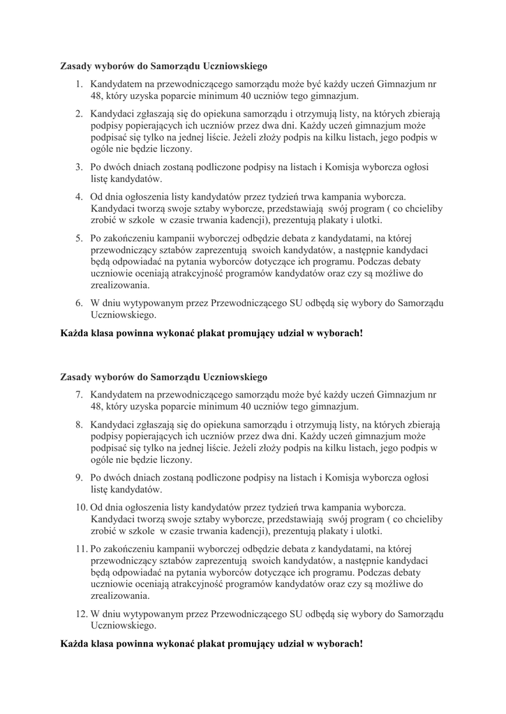 Zasady wyborów do Samorządu Uczniowskiego 1. Kandydatem na przewodniczącego samorządu może być każdy uczeń Gimnazjum nr 48, który uzyska poparcie minimum 40 uczniów tego gimnazjum. 2. Kandydaci zgłaszają się do opiekuna samorządu i otrzymują listy, na których zbierają podpisy popierających ich uczniów przez dwa dni. Każdy uczeń gimnazjum może podpisać się tylko na jednej liście. Jeżeli złoży podpis na kilku listach, jego podpis w ogóle nie będzie liczony. 3. Po dwóch dniach zostaną podliczone podpisy na listach i Komisja wyborcza ogłosi listę kandydatów. 4. Od dnia ogłoszenia listy kandydatów przez tydzień trwa kampania wyborcza. Kandydaci tworzą swoje sztaby wyborcze, przedstawiają swój program ( co chcieliby zrobić w szkole w czasie trwania kadencji), prezentują plakaty i ulotki. 5. Po zakończeniu kampanii wyborczej odbędzie debata z kandydatami, na której przewodniczący sztabów zaprezentują swoich kandydatów, a następnie kandydaci będą odpowiadać na pytania wyborców dotyczące ich programu. Podczas debaty uczniowie oceniają atrakcyjność programów kandydatów oraz czy są możliwe do zrealizowania. 6. W dniu wytypowanym przez Przewodniczącego SU odbędą się wybory do Samorządu Uczniowskiego. Każda klasa powinna wykonać plakat promujący udział w wyborach! Zasady wyborów do Samorządu Uczniowskiego 7. Kandydatem na przewodniczącego samorządu może być każdy uczeń Gimnazjum nr 48, który uzyska poparcie minimum 40 uczniów tego gimnazjum. 8. Kandydaci zgłaszają się do opiekuna samorządu i otrzymują listy, na których zbierają podpisy popierających ich uczniów przez dwa dni. Każdy uczeń gimnazjum może podpisać się tylko na jednej liście. Jeżeli złoży podpis na kilku listach, jego podpis w ogóle nie będzie liczony. 9. Po dwóch dniach zostaną podliczone podpisy na listach i Komisja wyborcza ogłosi listę kandydatów. 10. Od dnia ogłoszenia listy kandydatów przez tydzień trwa kampania wyborcza. Kandydaci tworzą swoje sztaby wyborcze, przedstawiają swój program ( co chcieliby zrobić w szkole w czasie trwania kadencji), prezentują plakaty i ulotki. 11. Po zakończeniu kampanii wyborczej odbędzie debata z kandydatami, na której przewodniczący sztabów zaprezentują swoich kandydatów, a następnie kandydaci będą odpowiadać na pytania wyborców dotyczące ich programu. Podczas debaty uczniowie oceniają atrakcyjność programów kandydatów oraz czy są możliwe do zrealizowania. 12. W dniu wytypowanym przez Przewodniczącego SU odbędą się wybory do Samorządu Uczniowskiego. Każda klasa powinna wykonać plakat promujący udział w wyborach!