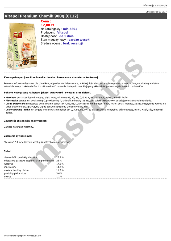 Informacje o produkcie Utworzono 08-03-2017 Vitapol Premium Chomik 900g [0112] Cena : 12,00 zł co ta Karma pełnoporcjowa Premium dla chomika. Pakowana w atmosferze kontrolnej. s Nr katalogowy : mls-5801 Producent : Vitapol Dostępność : do 1 dnia Stan magazynowy : bardzo wysoki Średnia ocena : brak recenzji Pełnowartościowa mieszanka dla chomików, odpowiednio zbilansowana, w której ilość zbóż została zmniejszona na rzecz różnego rodzaju granulatów i witaminizowanych ekstrudatów. Ich różnorodność zapewnia dostęp do szerokiej gamy składników pokarmowych, witamin i minerałów. Pokarm wzbogacony najlepszej jakości warzywami i owocami oraz ziołami. ● ● ● ● Marchew dostarcza liczne karoteny, olejki lotne, witaminy B1, B2, B6, C, E, H, K, PP oraz wapń, żelazo, miedź i fosfor. Pietruszka bogata jest w witaminę C, prowitaminę A, chlorofil, minerały żelazo, jod, działa rozkurczowo, odkażająco oraz ułatwia trawienie. Chleb świętojański dostarcza wielu witamin takich jak A, B2, B3, D, E oraz soli mineralnych: wapń, fosfor, potas, magnez, żelazo. Pozytywnie wpływa na układ trawienny oraz przyczynia się do obniżenia poziomu cholesterolu we krwi. . Lekkostrawne jabłko jest bogate w wiele witamin takich jak C, A, B1, B2, PP i B3 oraz składniki mineralne, głównie potas, fosfor, wapń, sód, magnez i żelazo. Zawartość składników analitycznych: m as Zawiera naturalne witaminy. Zalecenia żywnościowe: Stosować 2-3 razy dziennie według zapotrzebowania zwierzęcia. Skład: ziarno zbóż i produkty zbożowe mieszanka paszowa uzupełniająca granulowana warzywa inne rośliny nasiona i rośliny oleiste produkty piekarnicze owoce Wygenerowano w programie www.oscGold.com 26,9 % 25 % 17,9 % 14,2 % 11,3 % 3,6 % 1,1 %
