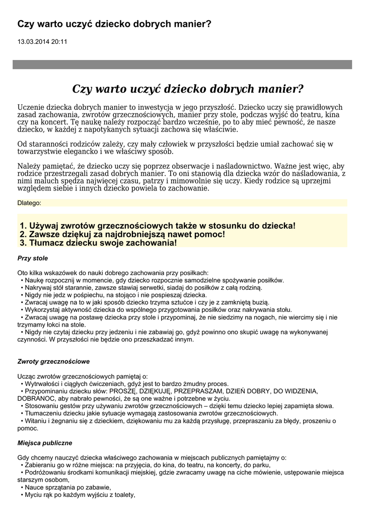 Czy warto uczyć dziecko dobrych manier? 13.03.2014 20:11 Czy warto uczyć dziecko dobrych manier? Uczenie dziecka dobrych manier to inwestycja w jego przyszłość. Dziecko uczy się prawidłowych zasad zachowania, zwrotów grzecznościowych, manier przy stole, podczas wyjść do teatru, kina czy na koncert. Tę naukę należy rozpocząć bardzo wcześnie, po to aby mieć pewność, że nasze dziecko, w każdej z napotykanych sytuacji zachowa się właściwie. Od staranności rodziców zależy, czy mały człowiek w przyszłości będzie umiał zachować się w towarzystwie elegancko i we właściwy sposób. Należy pamiętać, że dziecko uczy się poprzez obserwacje i naśladownictwo. Ważne jest więc, aby rodzice przestrzegali zasad dobrych manier. To oni stanowią dla dziecka wzór do naśladowania, z nimi maluch spędza najwięcej czasu, patrzy i mimowolnie się uczy. Kiedy rodzice są uprzejmi względem siebie i innych dziecko powiela to zachowanie. Dlatego: 1. Używaj zwrotów grzecznościowych także w stosunku do dziecka! 2. Zawsze dziękuj za najdrobniejszą nawet pomoc! 3. Tłumacz dziecku swoje zachowania! Przy stole Oto kilka wskazówek do nauki dobrego zachowania przy posiłkach: • Naukę rozpocznij w momencie, gdy dziecko rozpocznie samodzielne spożywanie posiłków. • Nakrywaj stół starannie, zawsze stawiaj serwetki, siadaj do posiłków z całą rodziną. • Nigdy nie jedz w pośpiechu, na stojąco i nie pospieszaj dziecka. • Zwracaj uwagę na to w jaki sposób dziecko trzyma sztućce i czy je z zamkniętą buzią. • Wykorzystaj aktywność dziecka do wspólnego przygotowania posiłków oraz nakrywania stołu. • Zwracaj uwagę na postawę dziecka przy stole i przypominaj, że nie siedzimy na nogach, nie wiercimy się i nie trzymamy łokci na stole. • Nigdy nie czytaj dziecku przy jedzeniu i nie zabawiaj go, gdyż powinno ono skupić uwagę na wykonywanej czynności. W przyszłości nie będzie ono przeszkadzać innym. Zwroty grzecznościowe Ucząc zwrotów grzecznościowych pamiętaj o: • Wytrwałości i ciągłych ćwiczeniach, gdyż jest to bardzo żmudny proces. • Przypominaniu dziecku słów: PROSZĘ, DZIĘKUJĘ, PRZEPRASZAM, DZIEŃ DOBRY, DO WIDZENIA, DOBRANOC, aby nabrało pewności, że są one ważne i potrzebne w życiu. • Stosowaniu gestów przy używaniu zwrotów grzecznościowych – dzięki temu dziecko lepiej zapamięta słowa. • Tłumaczeniu dziecku jakie sytuacje wymagają zastosowania zwrotów grzecznościowych. • Witaniu i żegnaniu się z dzieckiem, dziękowaniu mu za każdą przysługę, przepraszaniu za błędy, proszeniu o pomoc. Miejsca publiczne Gdy chcemy nauczyć dziecka właściwego zachowania w miejscach publicznych pamiętajmy o: • Zabieraniu go w różne miejsca: na przyjęcia, do kina, do teatru, na koncerty, do parku, • Podróżowaniu środkami komunikacji miejskiej, gdzie zwracamy uwagę na ciche mówienie, ustępowanie miejsca starszym osobom, • Nauce sprzątania po zabawie, • Myciu rąk po każdym wyjściu z toalety, • Oczyszczaniu nosa za pomocą chusteczek higienicznych, • Zasłanianiu ust przy kichaniu, kaszlu czy ziewaniu, • Wpojeniu nawyku informowania rodziców o każdej sytuacji, w której dziecko chce odejść w inne miejsce, • Dbaniu o wygląd zewnętrzny – czystość ubrań, estetyczny wizerunek, uczesane włosy itp. Motto: Uprzejmość – trudna to sztuka, lecz czasu na nią nie szkoda. Za nią cię spotka nagroda, choćbyś jej nawet nie szukał. Ch. Perrault