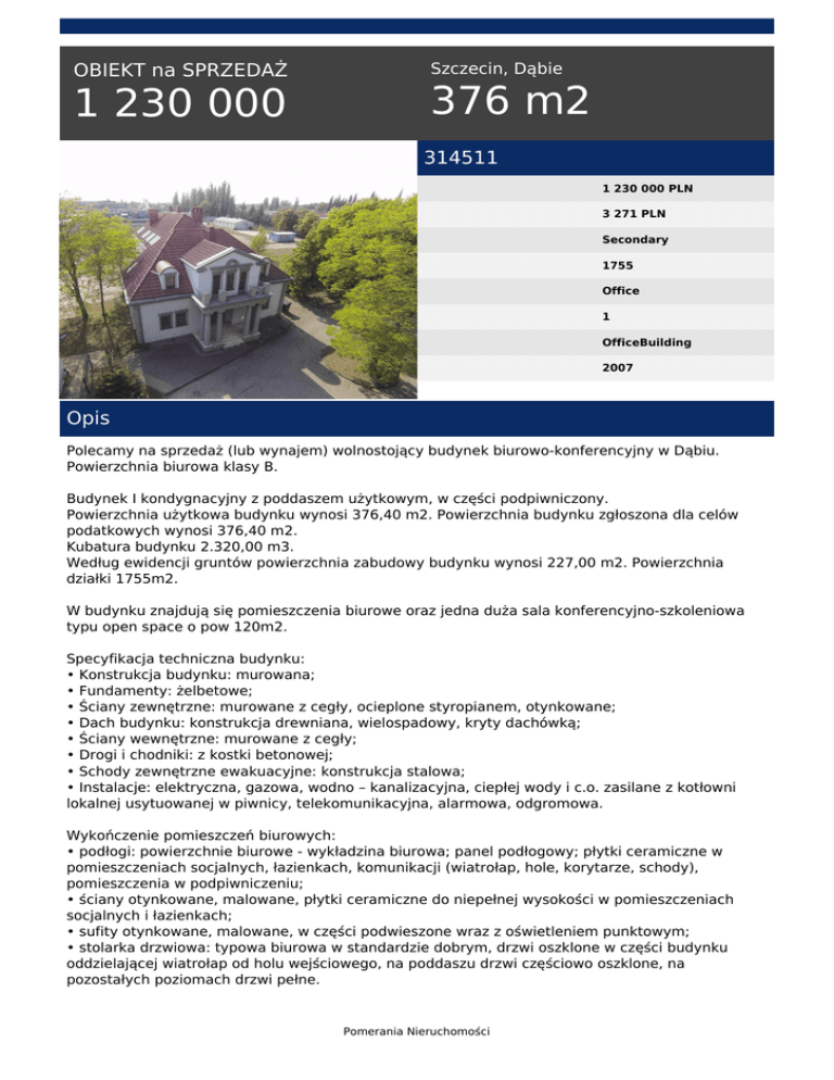 OBIEKT na SPRZEDAŻ 1 230 000 Szczecin, Dąbie 376 m2 314511 1 230 000 PLN 3 271 PLN Secondary 1755 Office 1 OfficeBuilding 2007 Opis Polecamy na sprzedaż (lub wynajem) wolnostojący budynek biurowo-konferencyjny w Dąbiu. Powierzchnia biurowa klasy B. Budynek I kondygnacyjny z poddaszem użytkowym, w części podpiwniczony. Powierzchnia użytkowa budynku wynosi 376,40 m2. Powierzchnia budynku zgłoszona dla celów podatkowych wynosi 376,40 m2. Kubatura budynku 2.320,00 m3. Według ewidencji gruntów powierzchnia zabudowy budynku wynosi 227,00 m2. Powierzchnia działki 1755m2. W budynku znajdują się pomieszczenia biurowe oraz jedna duża sala konferencyjno-szkoleniowa typu open space o pow 120m2. Specyfikacja techniczna budynku: • Konstrukcja budynku: murowana; • Fundamenty: żelbetowe; • Ściany zewnętrzne: murowane z cegły, ocieplone styropianem, otynkowane; • Dach budynku: konstrukcja drewniana, wielospadowy, kryty dachówką; • Ściany wewnętrzne: murowane z cegły; • Drogi i chodniki: z kostki betonowej; • Schody zewnętrzne ewakuacyjne: konstrukcja stalowa; • Instalacje: elektryczna, gazowa, wodno – kanalizacyjna, ciepłej wody i c.o. zasilane z kotłowni lokalnej usytuowanej w piwnicy, telekomunikacyjna, alarmowa, odgromowa. Wykończenie pomieszczeń biurowych: • podłogi: powierzchnie biurowe - wykładzina biurowa; panel podłogowy; płytki ceramiczne w pomieszczeniach socjalnych, łazienkach, komunikacji (wiatrołap, hole, korytarze, schody), pomieszczenia w podpiwniczeniu; • ściany otynkowane, malowane, płytki ceramiczne do niepełnej wysokości w pomieszczeniach socjalnych i łazienkach; • sufity otynkowane, malowane, w części podwieszone wraz z oświetleniem punktowym; • stolarka drzwiowa: typowa biurowa w standardzie dobrym, drzwi oszklone w części budynku oddzielającej wiatrołap od holu wejściowego, na poddaszu drzwi częściowo oszklone, na pozostałych poziomach drzwi pełne. Pomerania Nieruchomości W łazienkach / w.c. montaż biały i armatura – standard dobry, typowy. Nieruchomość idealnie nadaje się na siedzibę firmy, posiada bezpośredni dostęp do ul. Pomorskiej. Cena 1.000.000 plus VAT Zapytaj naszego maklera o BEZPŁATNE doradztwo przy uzyskaniu KREDYTU. Współpracujemy z wieloma bankami i mamy doświadczenie w przeprowadzaniu transakcji z uwzględnieniem warunków kredytowych. Dane nie stanowią oferty handlowej w rozumieniu art. 66,§ 1 Kodeksu Cywilnego. Szczegółowych informacji udziela Biuro Nieruchomości Pomerania . Pomerania Nieruchomości tel. Lewobrzeże: 914894242 | Prawobrzeże: 913508888 email: [email protected] Pomerania Nieruchomości Powered by TCPDF (www.tcpdf.org)