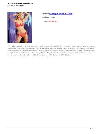 Tytuł główny nagłówka podtytuł nagłówka nazwa Stringi Lovely V-1508 producent: Axami cena: 59.00 zł Połyskliwa koronka i delikatna satyna to kobiece materiały, dzięki którym stringi Lovely nabierają wyjątkowego, subtelnego charakteru. Zmysłowy krój tego modelu pozwala w pełni wyeksponować urodę Twojego ciała. Dość szeroka koronka wykończona kokardką z tyłu podkreśla krągłość bioder i wcięcie w talii. Ciepły koralowy kolor jest jak pieszczota dla oczu... i dla Twojej skóry. Wyjątkowy charakter tych stringów nabiera wyrazu przy biustonoszu push-up Lovely! Skład materiałowy: 87% Poliamid 13% Elastan 1/1