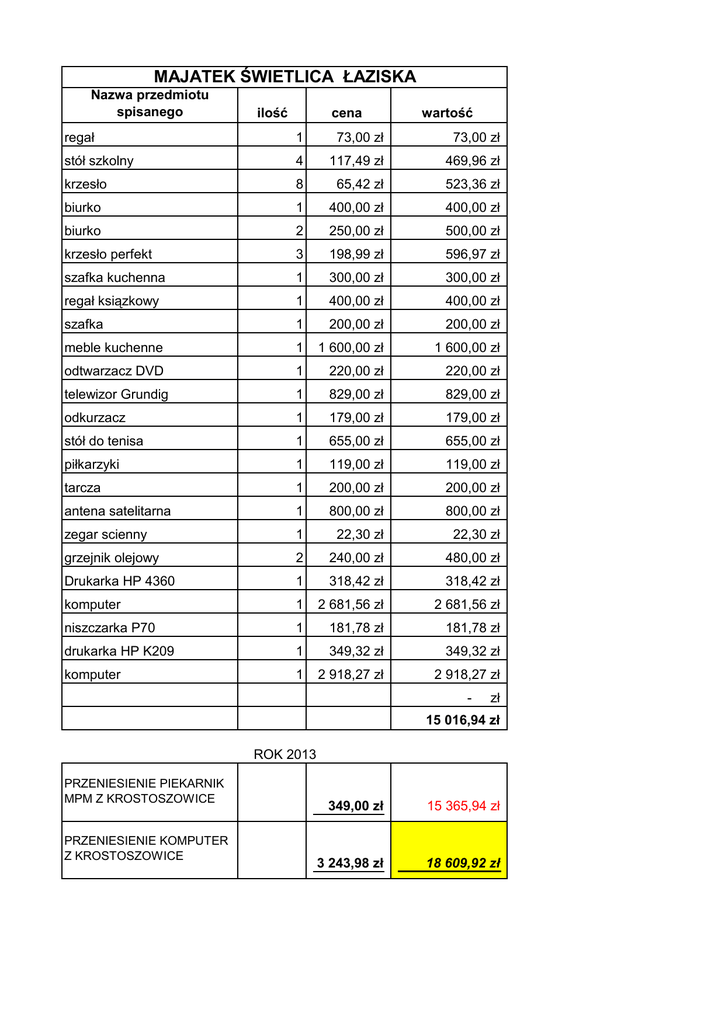 MAJATEK ŚWIETLICA ŁAZISKA Nazwa przedmiotu spisanego ilość cena wartość regał 1 73,00 zł 73,00 zł stół szkolny 4 117,49 zł 469,96 zł krzesło 8 65,42 zł 523,36 zł biurko 1 400,00 zł 400,00 zł biurko 2 250,00 zł 500,00 zł krzesło perfekt 3 198,99 zł 596,97 zł szafka kuchenna 1 300,00 zł 300,00 zł regał ksiązkowy 1 400,00 zł 400,00 zł szafka 1 200,00 zł 200,00 zł meble kuchenne 1 1 600,00 zł 1 600,00 zł odtwarzacz DVD 1 220,00 zł 220,00 zł telewizor Grundig 1 829,00 zł 829,00 zł odkurzacz 1 179,00 zł 179,00 zł stół do tenisa 1 655,00 zł 655,00 zł piłkarzyki 1 119,00 zł 119,00 zł tarcza 1 200,00 zł 200,00 zł antena satelitarna 1 800,00 zł 800,00 zł zegar scienny 1 22,30 zł 22,30 zł grzejnik olejowy 2 240,00 zł 480,00 zł Drukarka HP 4360 1 318,42 zł 318,42 zł komputer 1 2 681,56 zł 2 681,56 zł niszczarka P70 1 181,78 zł 181,78 zł drukarka HP K209 1 349,32 zł 349,32 zł komputer 1 2 918,27 zł 2 918,27 zł - zł 15 016,94 zł ROK 2013 PRZENIESIENIE PIEKARNIK MPM Z KROSTOSZOWICE PRZENIESIENIE KOMPUTER Z KROSTOSZOWICE 349,00 zł 15 365,94 zł 3 243,98 zł 18 609,92 zł